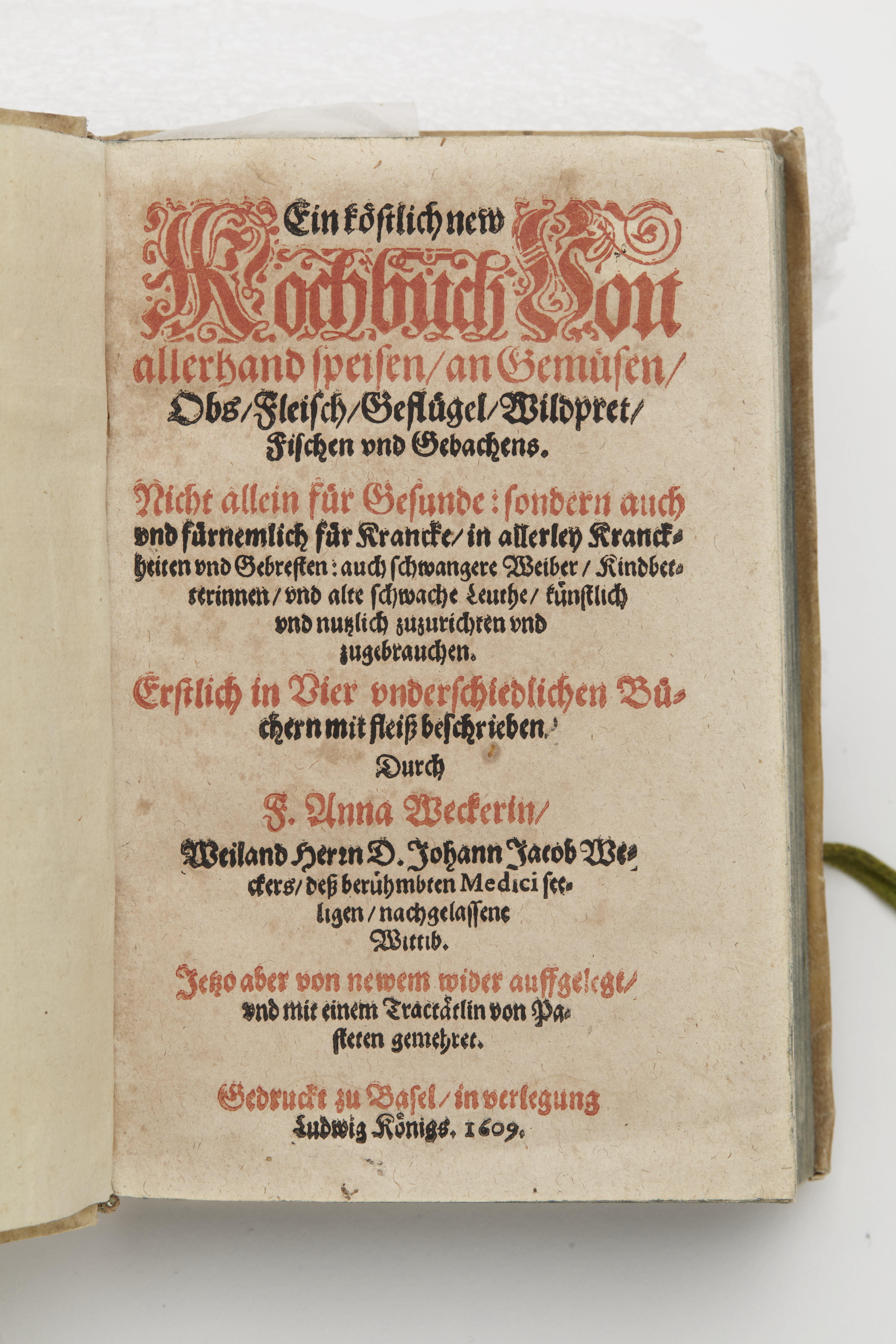 Ein köstlich new Kochbuch von allerhand speisen, an Gemüsen, Obs, Fleisch, Geflügel, Wildpret, Fischen vnd Gebachens... in vier... Büchern... von newem... auffgelegt, vnd mit einem Tractätlin von Pasteten gemehret. Gedruckt zu Basel, in verlegung Ludwig Königs. 1609.