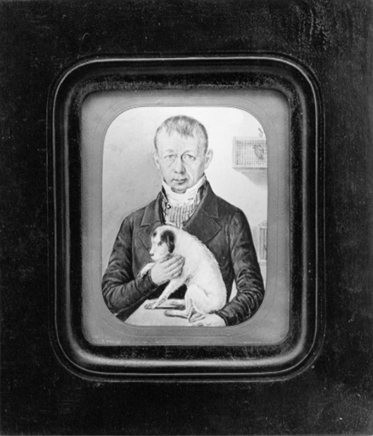Akvarell på papper. Stående midjebild, fas, framåtkammat, grånande hår, randig väst med hög krage, vit halsduk, blågrå rock. Står vid litet bord och leker med vit hund med bruna öron, som sitter på bordet. I bakgrunden burar med småfågel. Passepartout målad med guldfärg, dageröppning med rundade hörn, glas. Prydnadsram av trä, målad på framsidan och kanterna med mörkt rödbrun lasyrfärg. På baksidan klistrat svart pressat papper, upptill mässingsring.