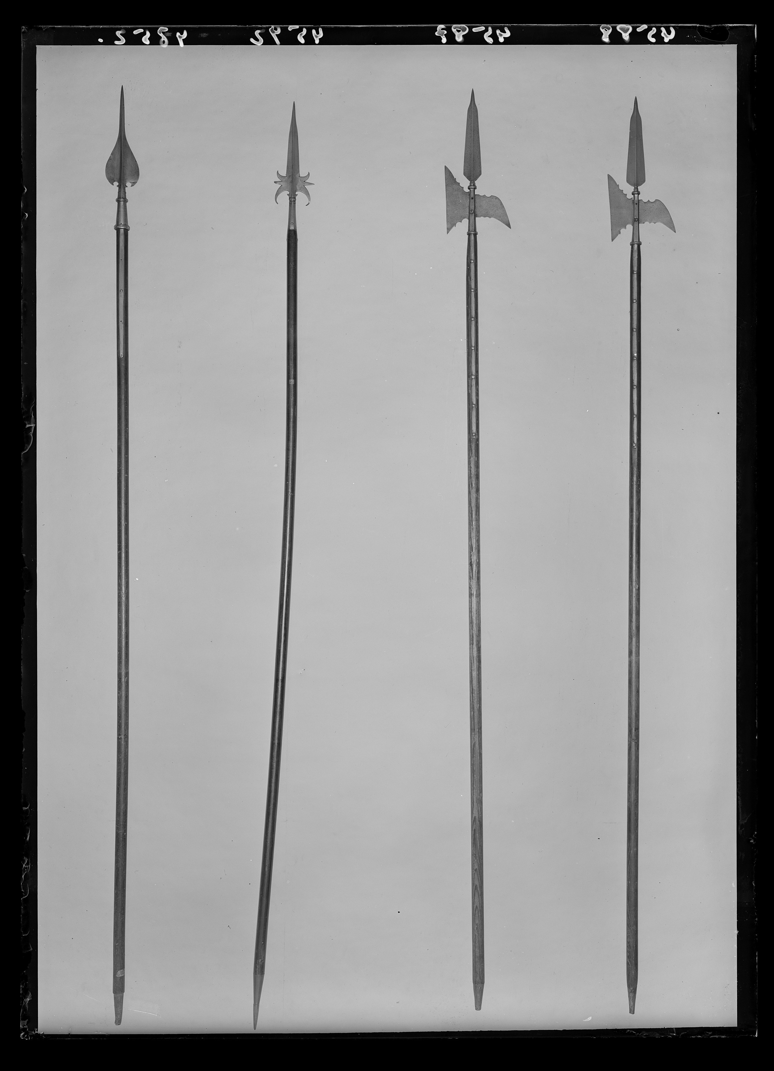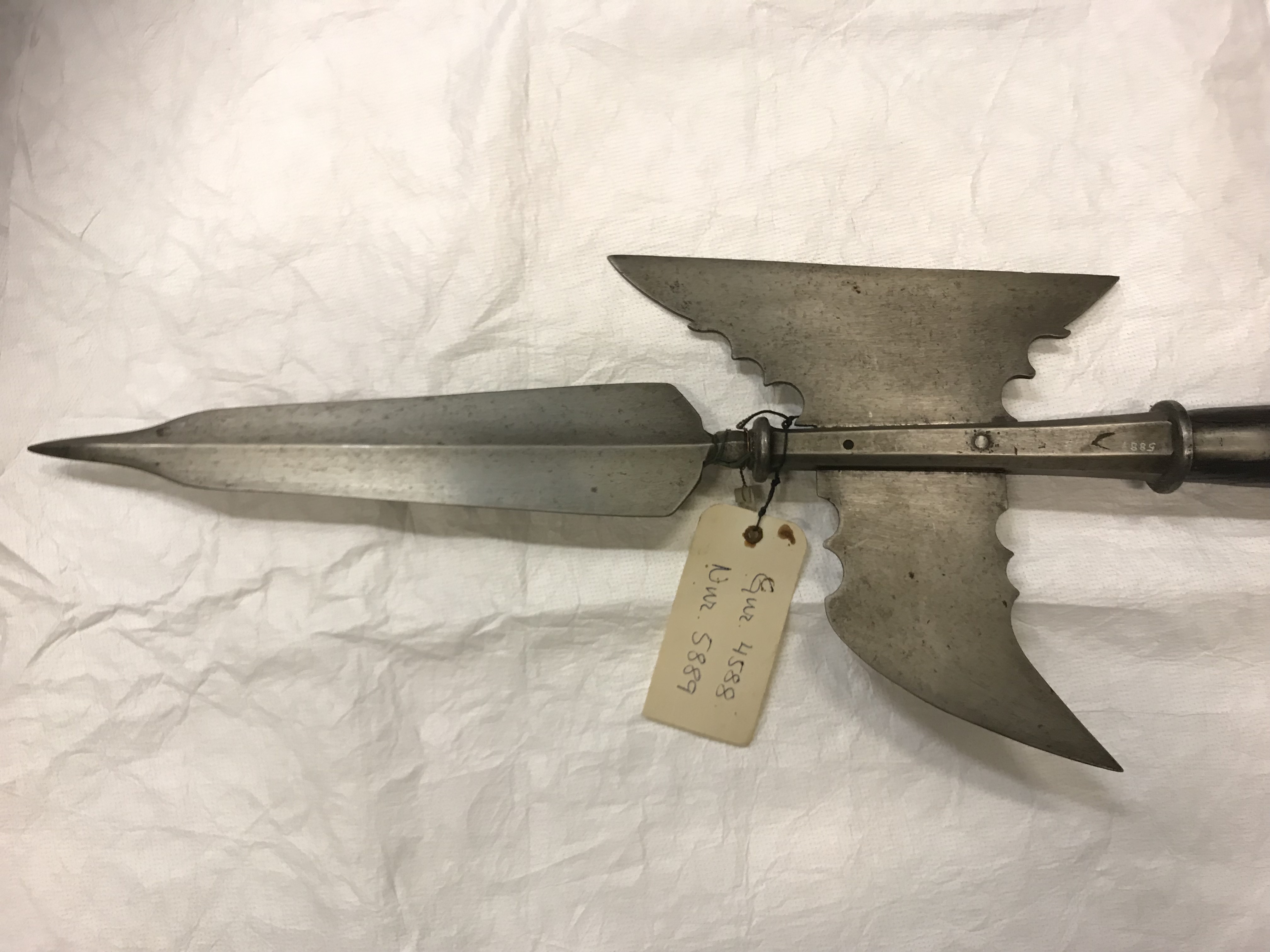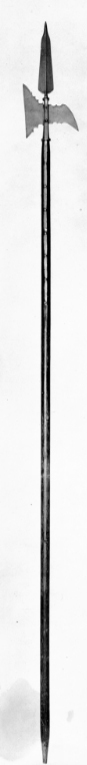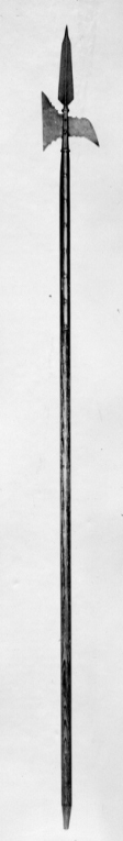 Klinga med mötande skär och avsmalnande, något förtjockat spetsparti. Yxbladet med rakt avskuren eggsida och haken spetsigt nedåtböjd. Yxbladets och hakens övre och nedre kant närmast fästet konturerad med skålformiga urtag. Holken åttkantig med ringformig krans upptill och nedtill, från denna utgår två stycken skenor, L: 549 mm fästade med sju nitar. Skaft av trä med runt tvärsnitt, nedtill med konisk doppsko av stål. h: 74 mm.
