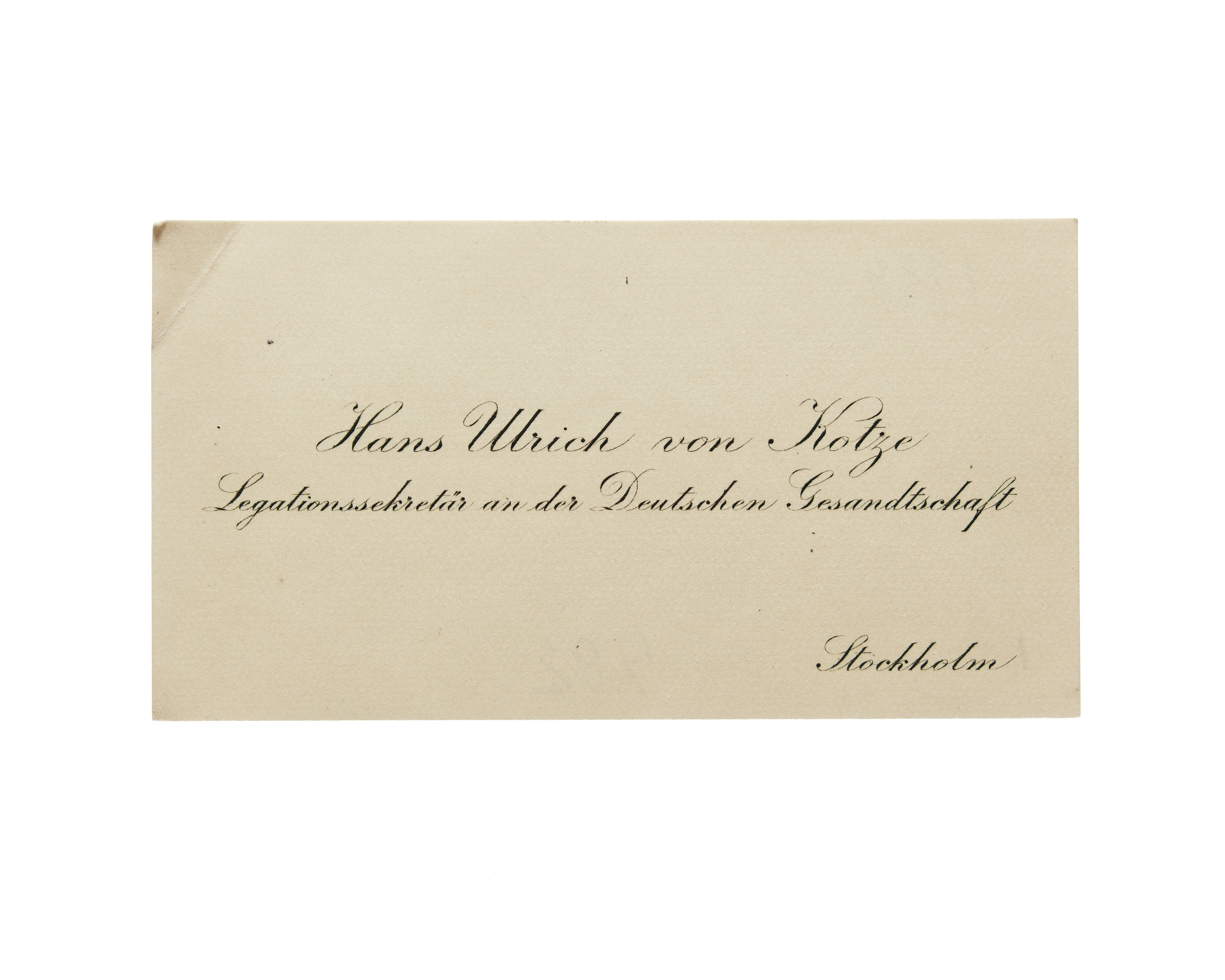 Ett visitkort från Hans Ulrich von Kotze, Legationssekretär an der deutschen Gesandtschaft, daterat 1924, vikt i övre vänstra hörnet. Adress (nedre högra hörnet) Strockhol.