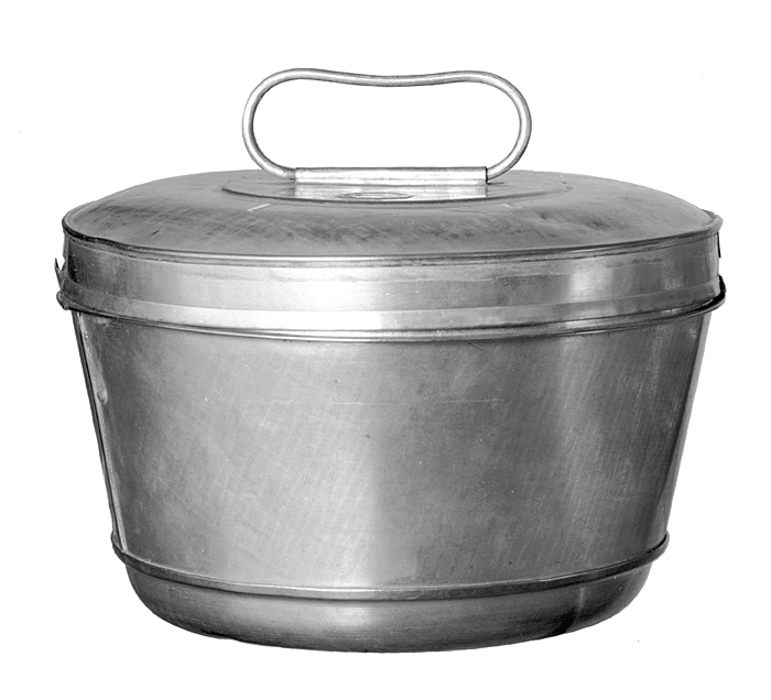 PUDDINGFORMAR med lock, två stycken av bleckplåt. Runda, omvänt svagt koniska, med grov vulstig bottenring och mycket grovt mittrör; kring övre kanten en hög fals för locket, nedtill avslutad i en utstående falskant; bottenringen fastfalsad vid stommen; mittrör något koniskt, med en längdgående fals samt plan överände, vari ett litet runt hål; i falsen två rakt utstående nabbar för urtagningar i locksargen (båda nabbarna i ena falsen och en i den andra saknas). Höjd: 12 cm.; diameter: 20,7 cm. och 21,3 cm. Lock: Lågt, något kupigt, med utanpågående sarg med nedre kanten snett utvikt, i denna två motstående rätvinkliga urtagningar (för nabbarna i falsen); översidan med plant mittfält inom en utåtfallande bred vulst; på mittfältet ett avlångt rundstavigt handtag, rörligt under en omvikt plåtflik. Höjd: 3,6 cm.; diameter: 20,7 cm. Svensk tillverkning, Stockholm; firman Johan Ericsson & Co