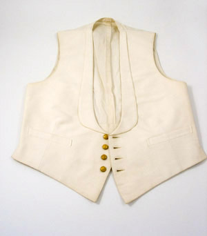 Väst av vit bomullspiké med sjalkrage och två fickor. Knäppning fram med fyra kullriga knappar i gul metall, 14 mm i diam, med emblem i relief i form av ett ankare krönt av en sluten krona, omgiven av ett "O". Repstavsbård på knappens ytterkant. Bakstycke av linne, med spänntamp. På ena spänntampen sitter ett rektangulärt spänne med två korta nålar och text i relief: "A.RANZ" på övre långsidan, och "SOLIDE" på den nedre tvärslån, med en volutliknande dekoration på var sida. På insidan av samma spänntamp finns en pärlemorknapp, 10 mm i diam. Foder av linne. Alberto Ranz, Madrid, 1927. Gustaf V erhöll spansk amiralsvärdighet 1927-05-00. Gåva av H. M. konung Gustaf V:s arvingar genom Konung Gustaf V:s hovmarskalksämbete.