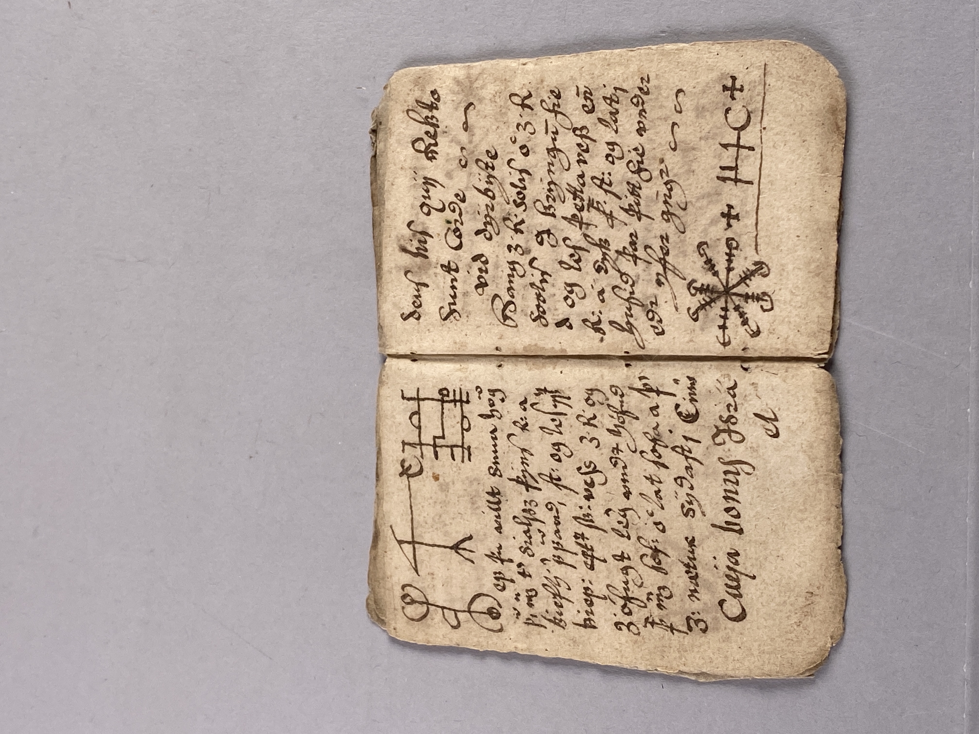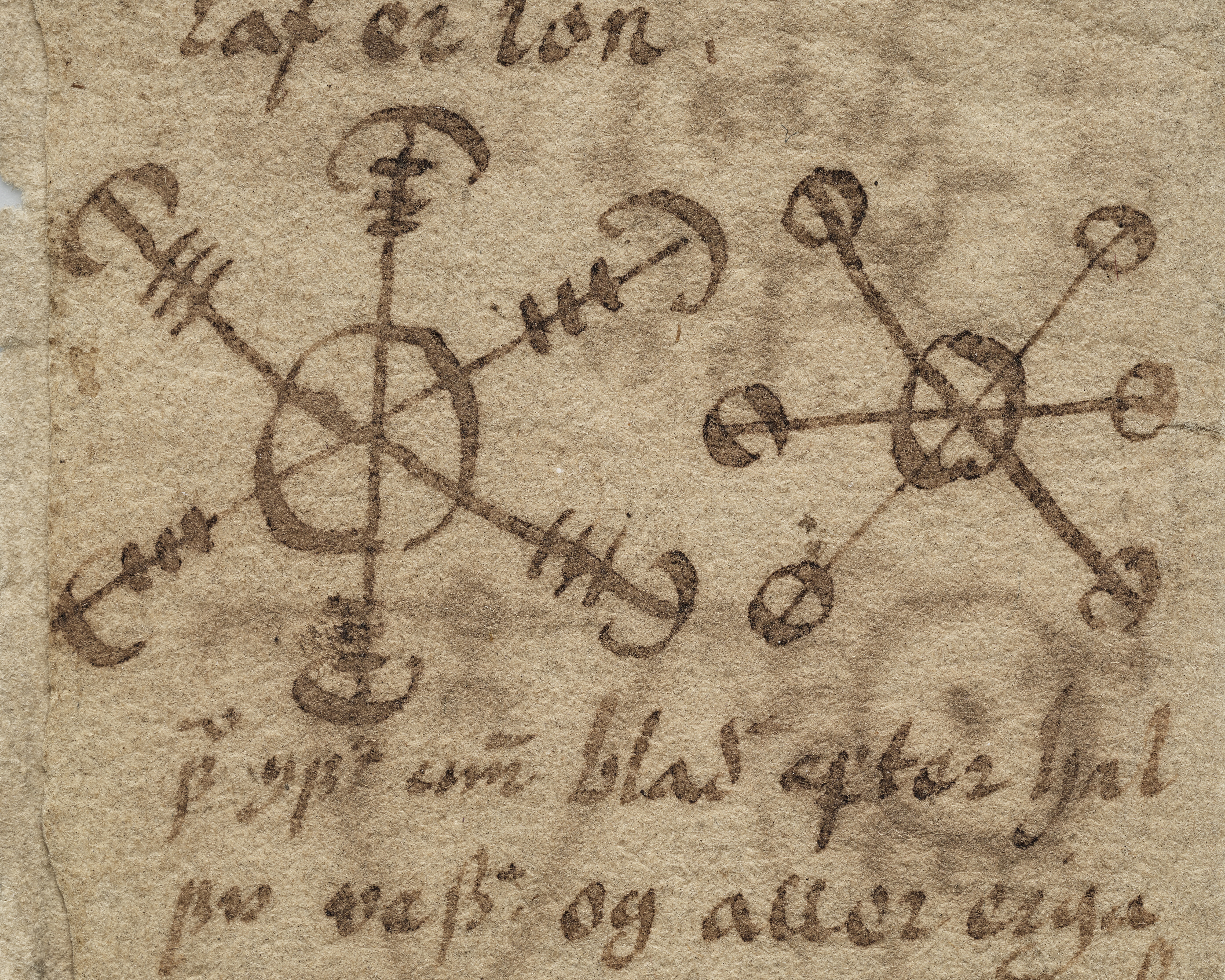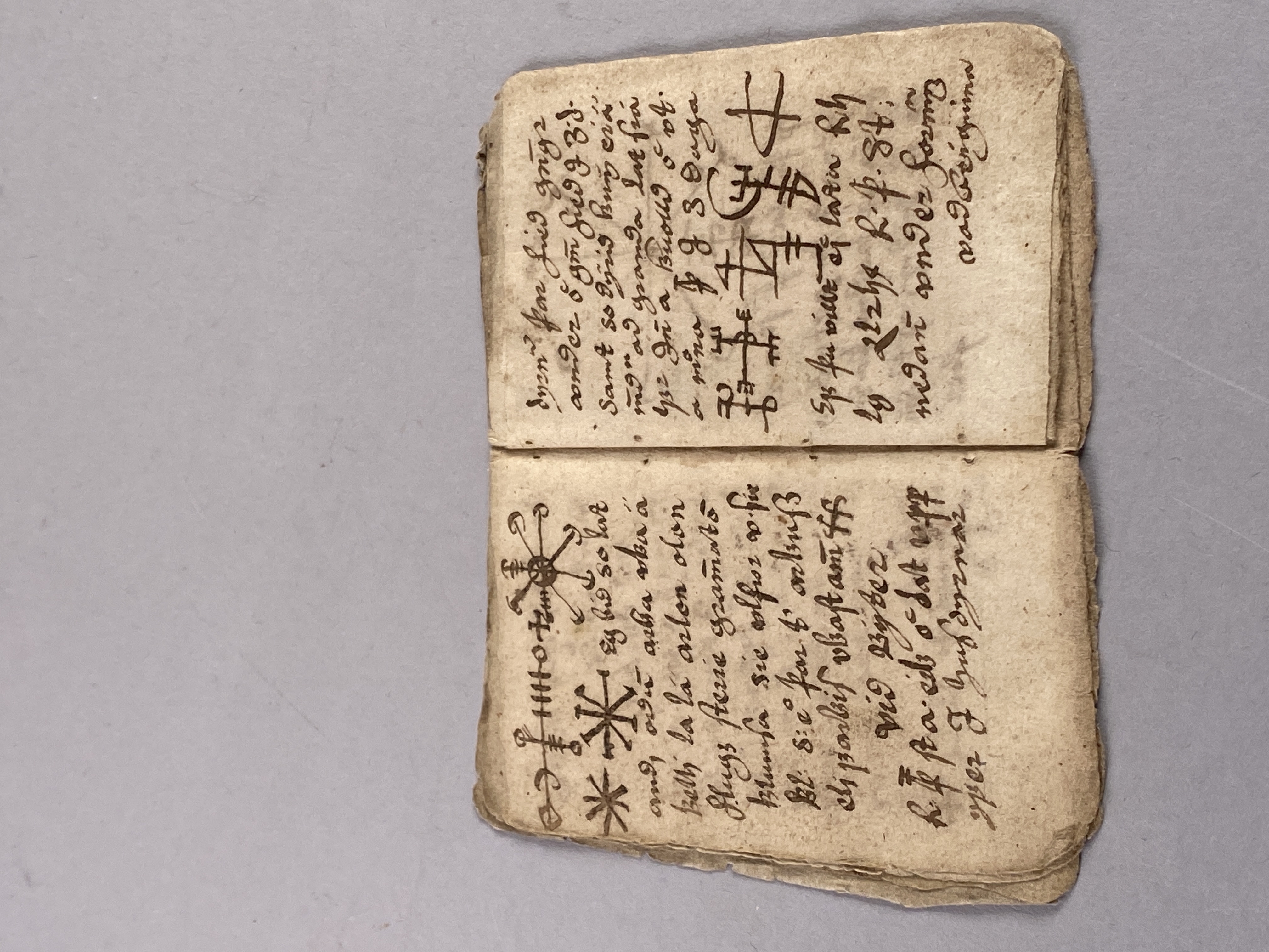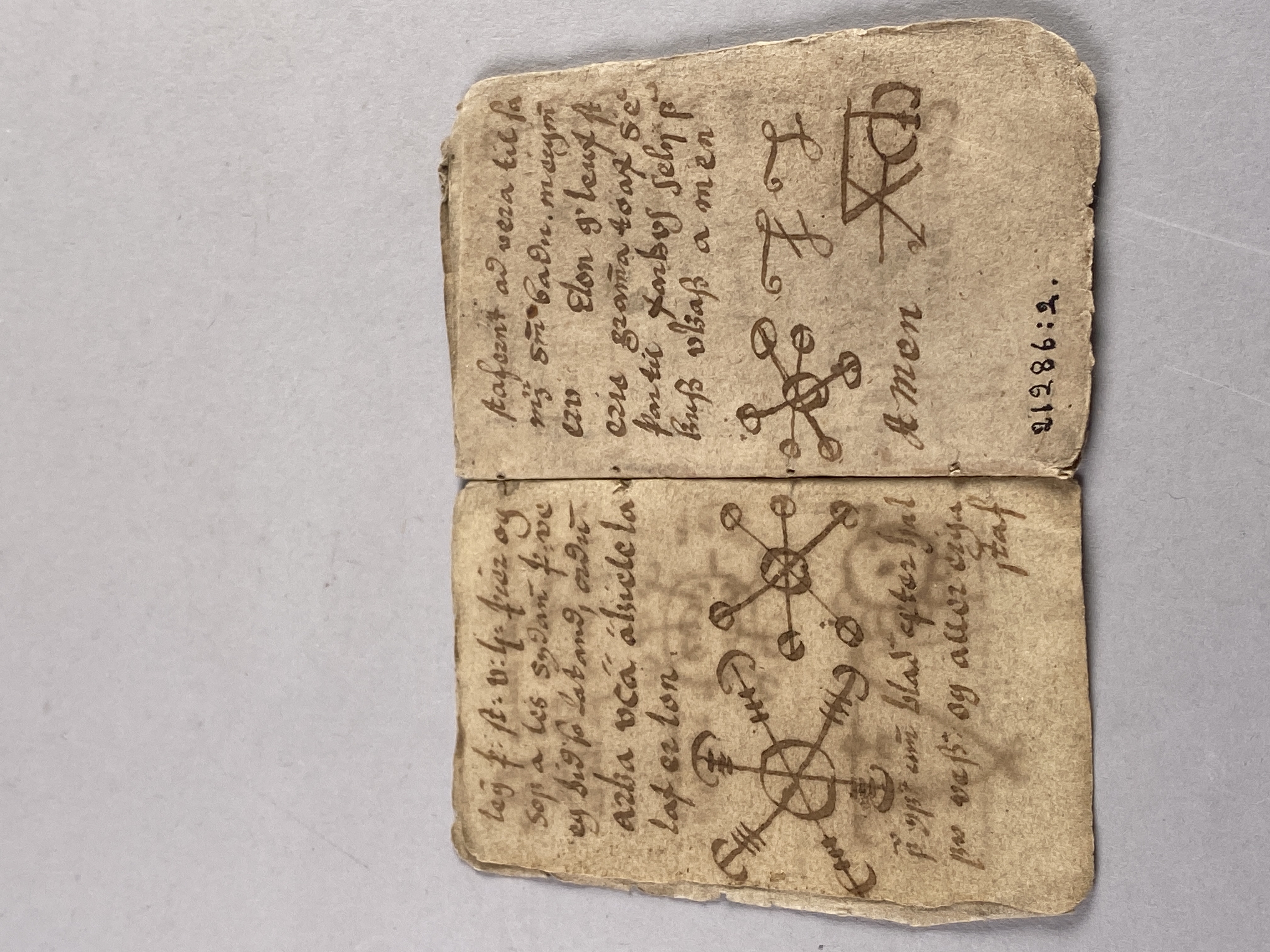 14 blad tillhörande bok möjligen skriven på isländska. Innehåller text samt ritade magiska tecken. Daterad till 1500-1600-tal.
