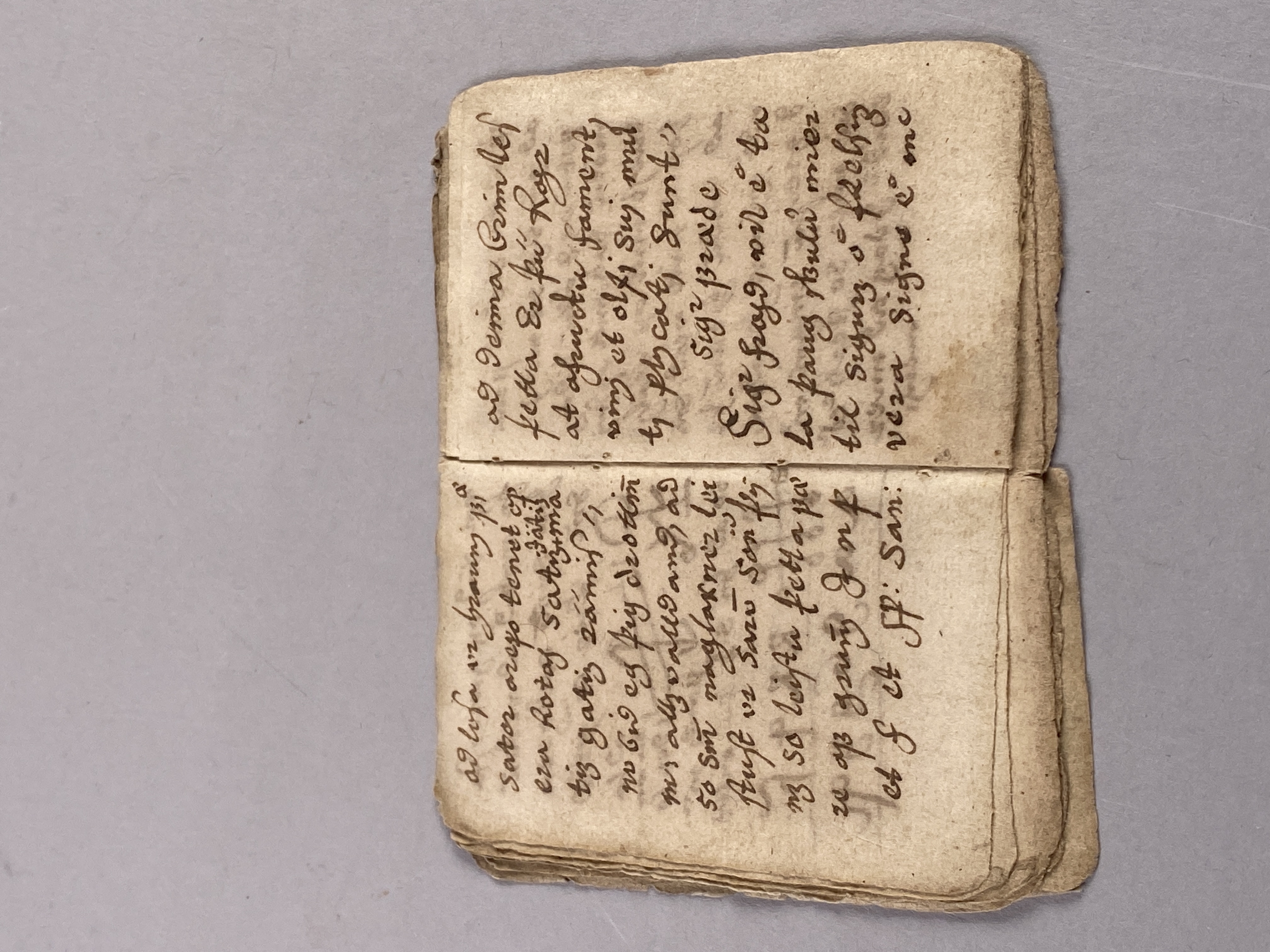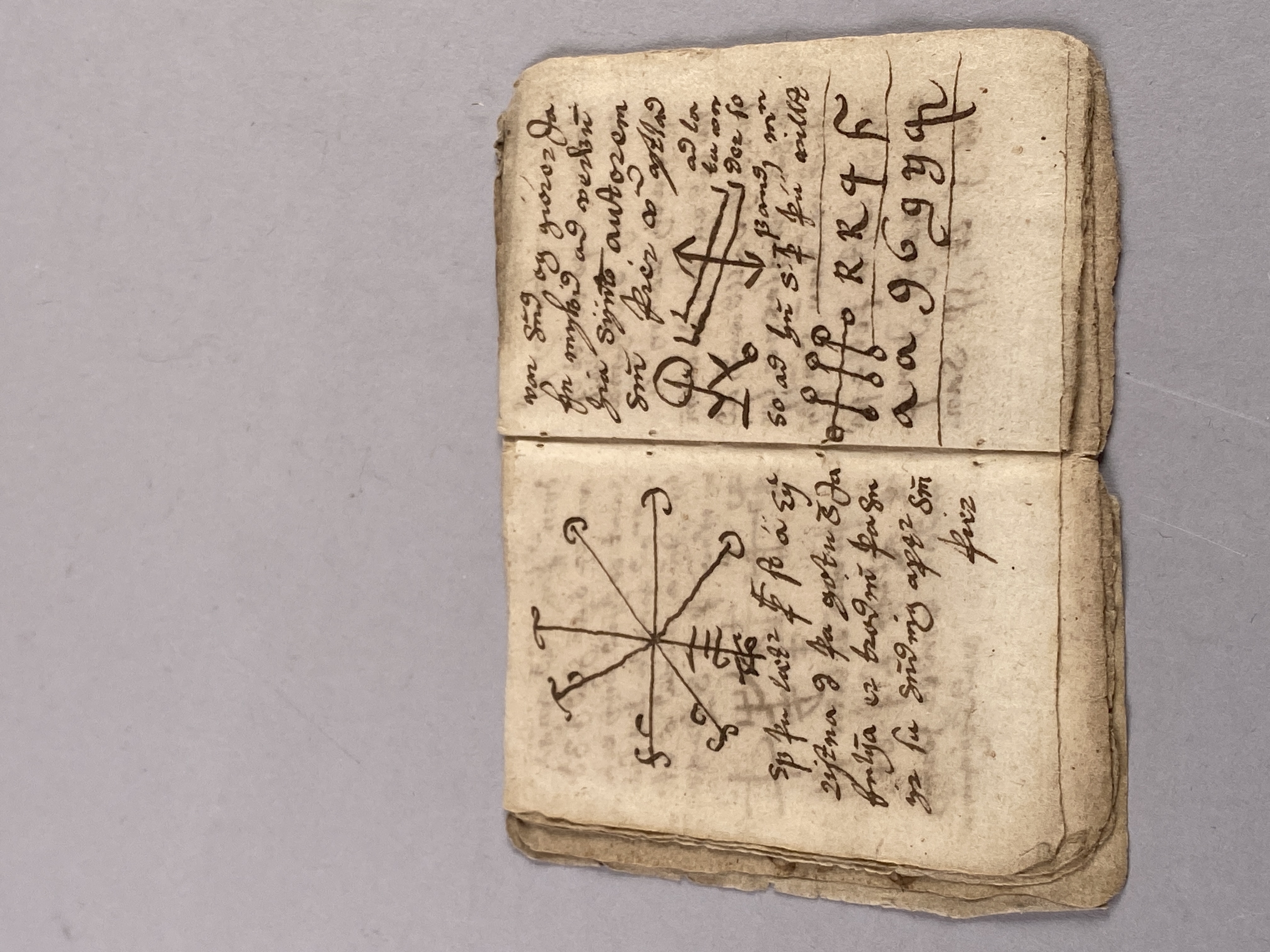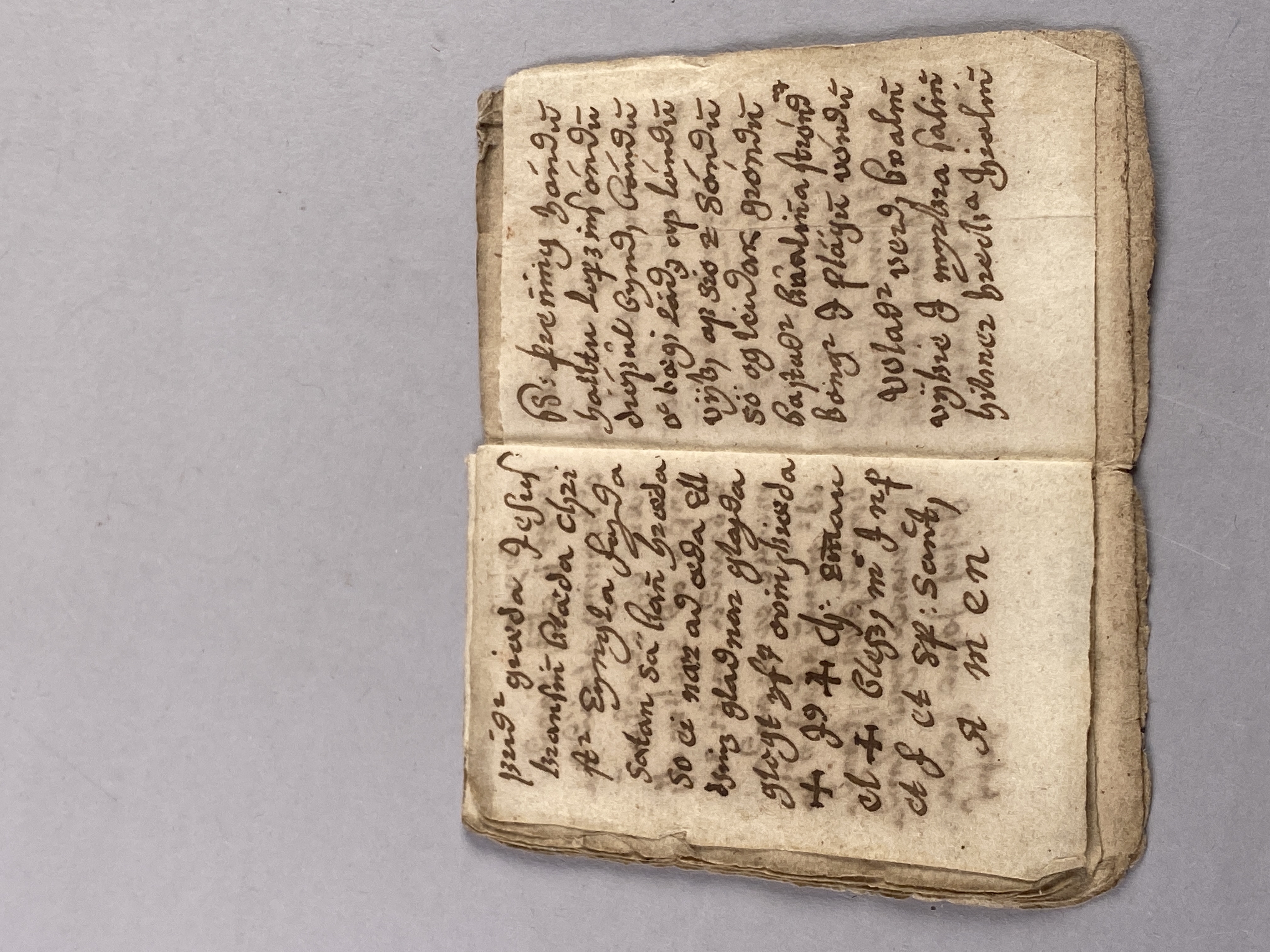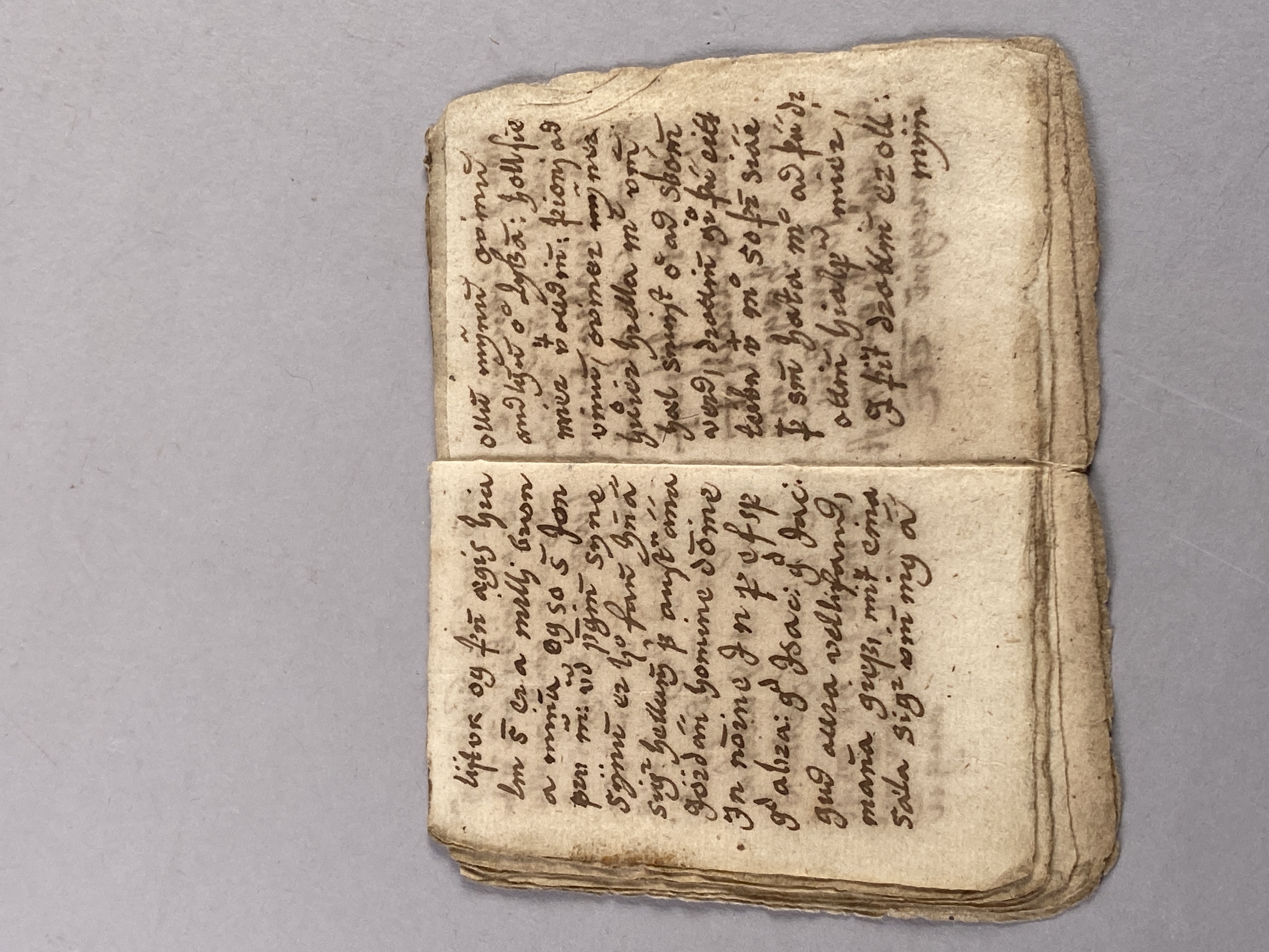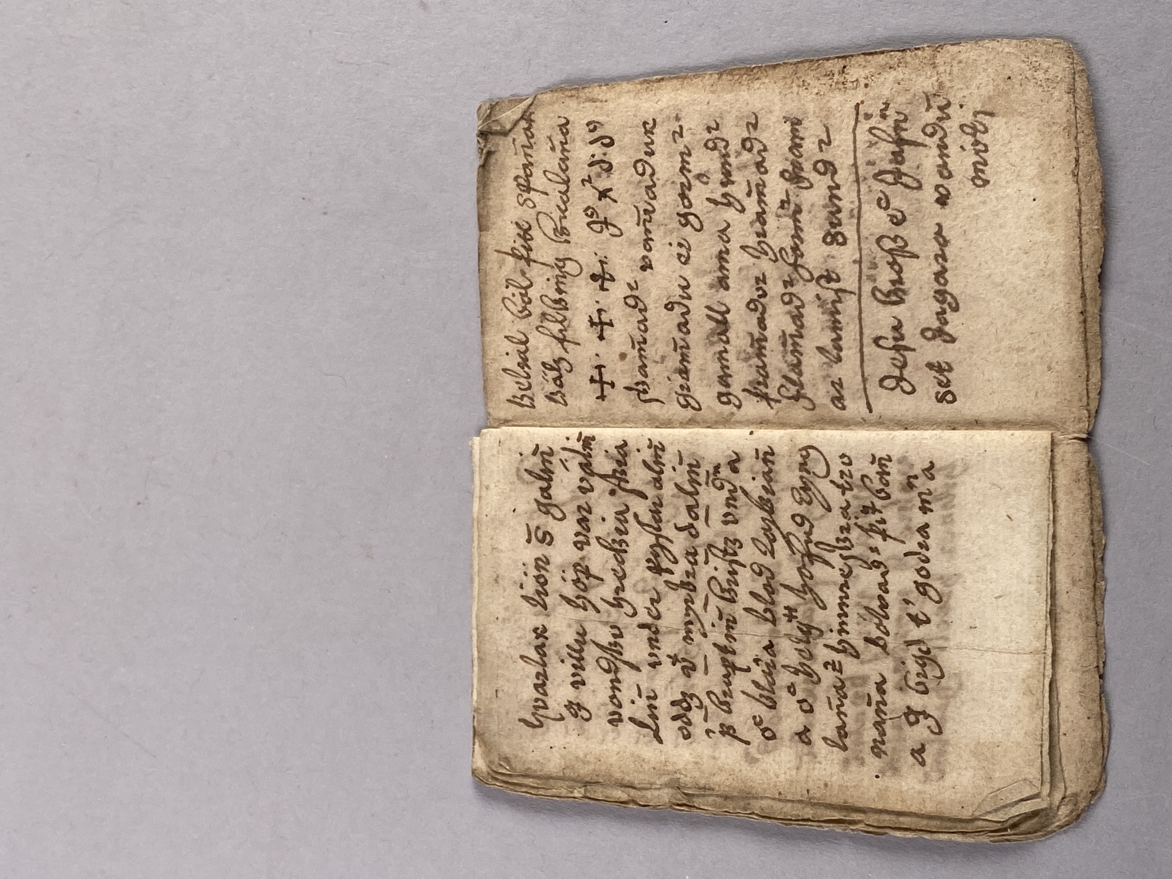 14 blad tillhörande bok möjligen skriven på isländska. Innehåller text samt ritade magiska tecken. Daterad till 1500-1600-tal.