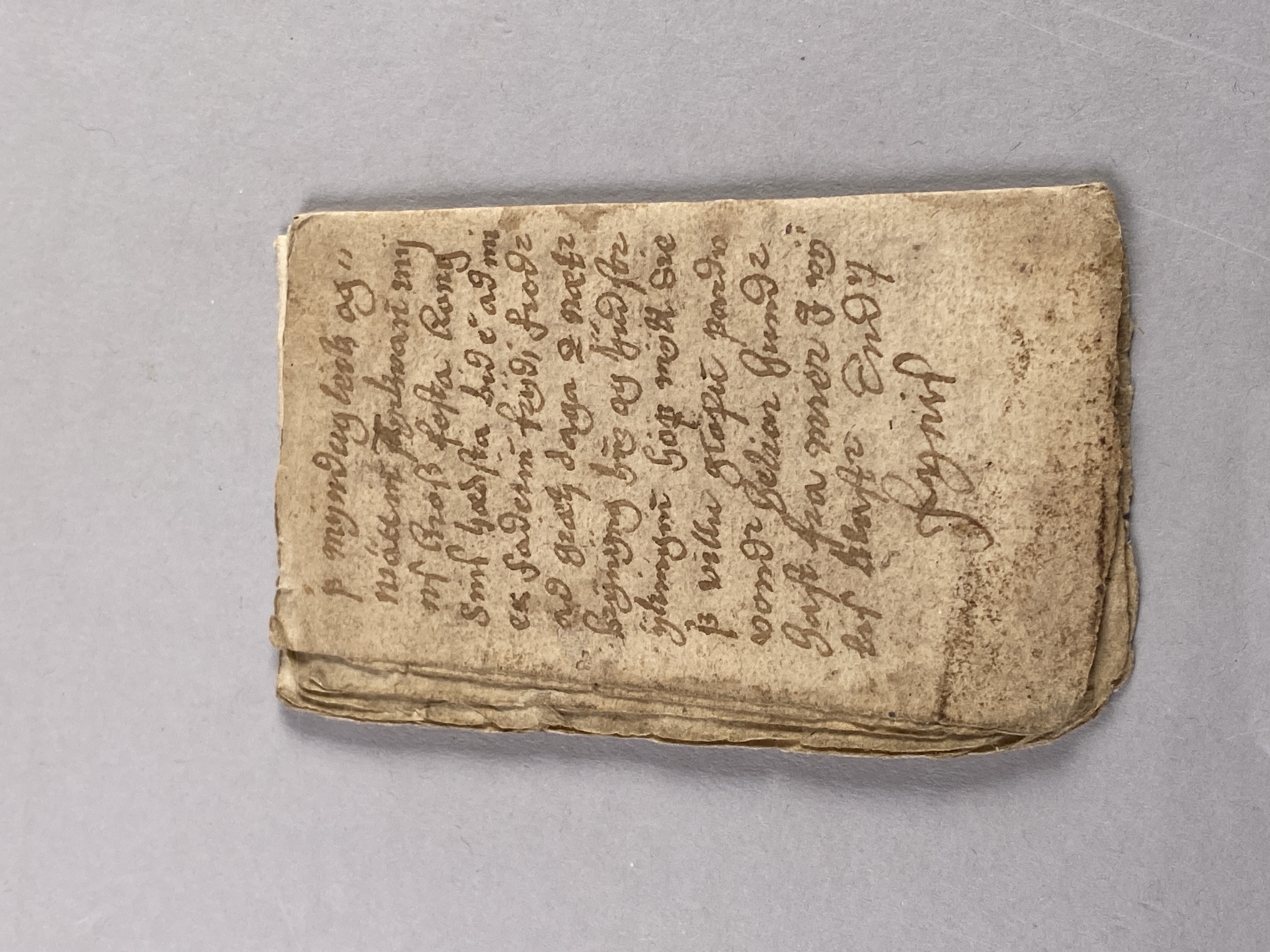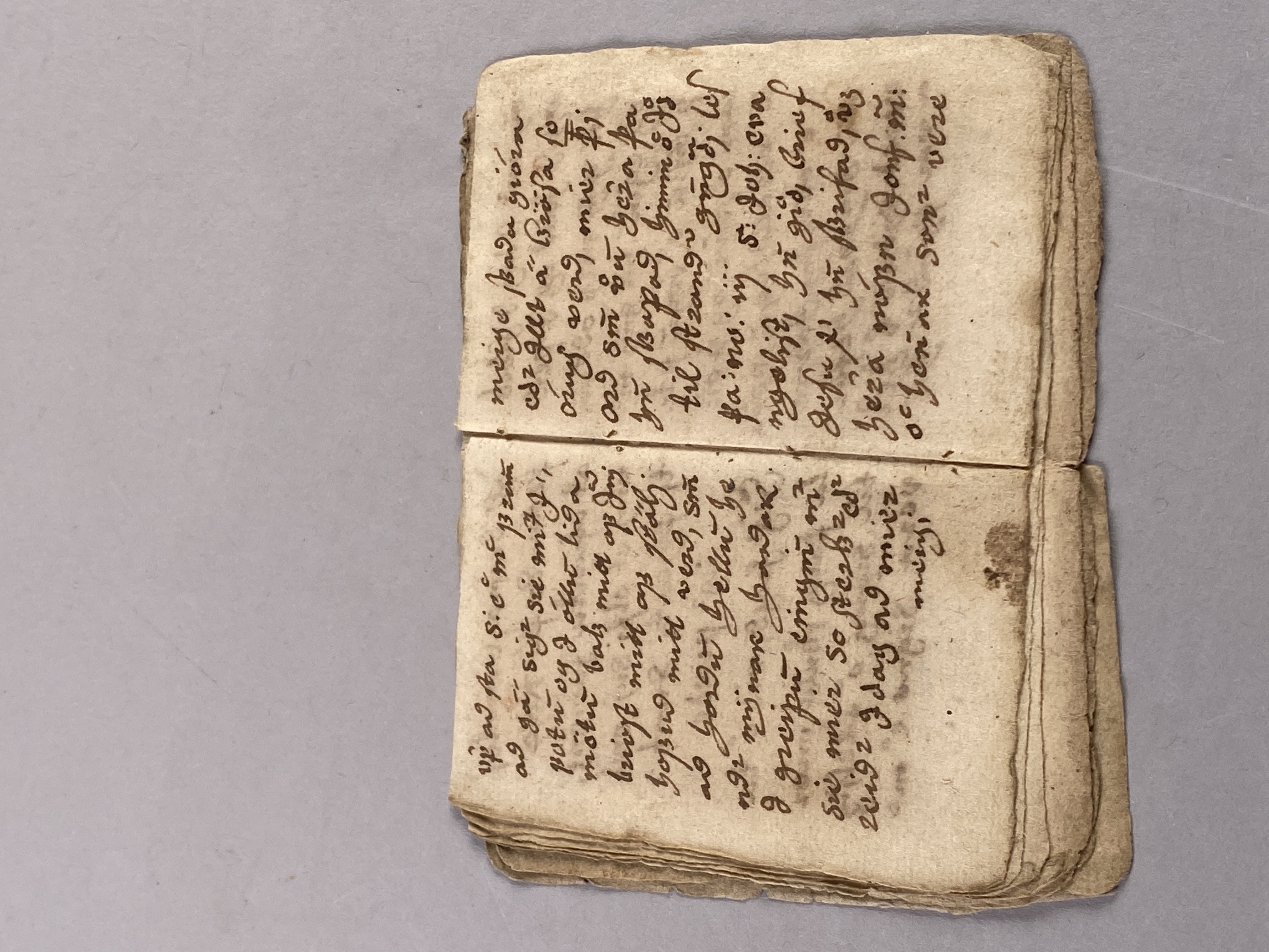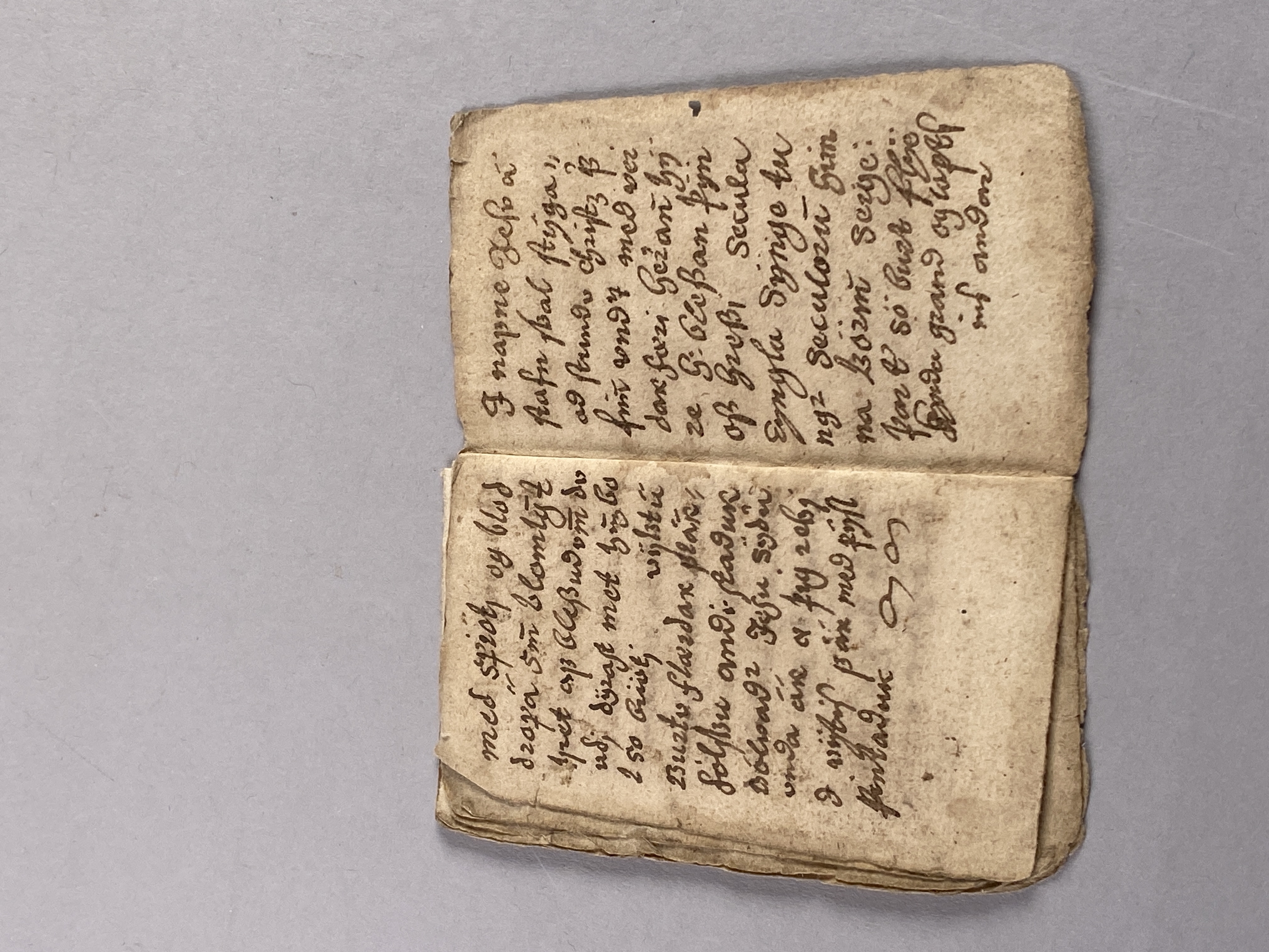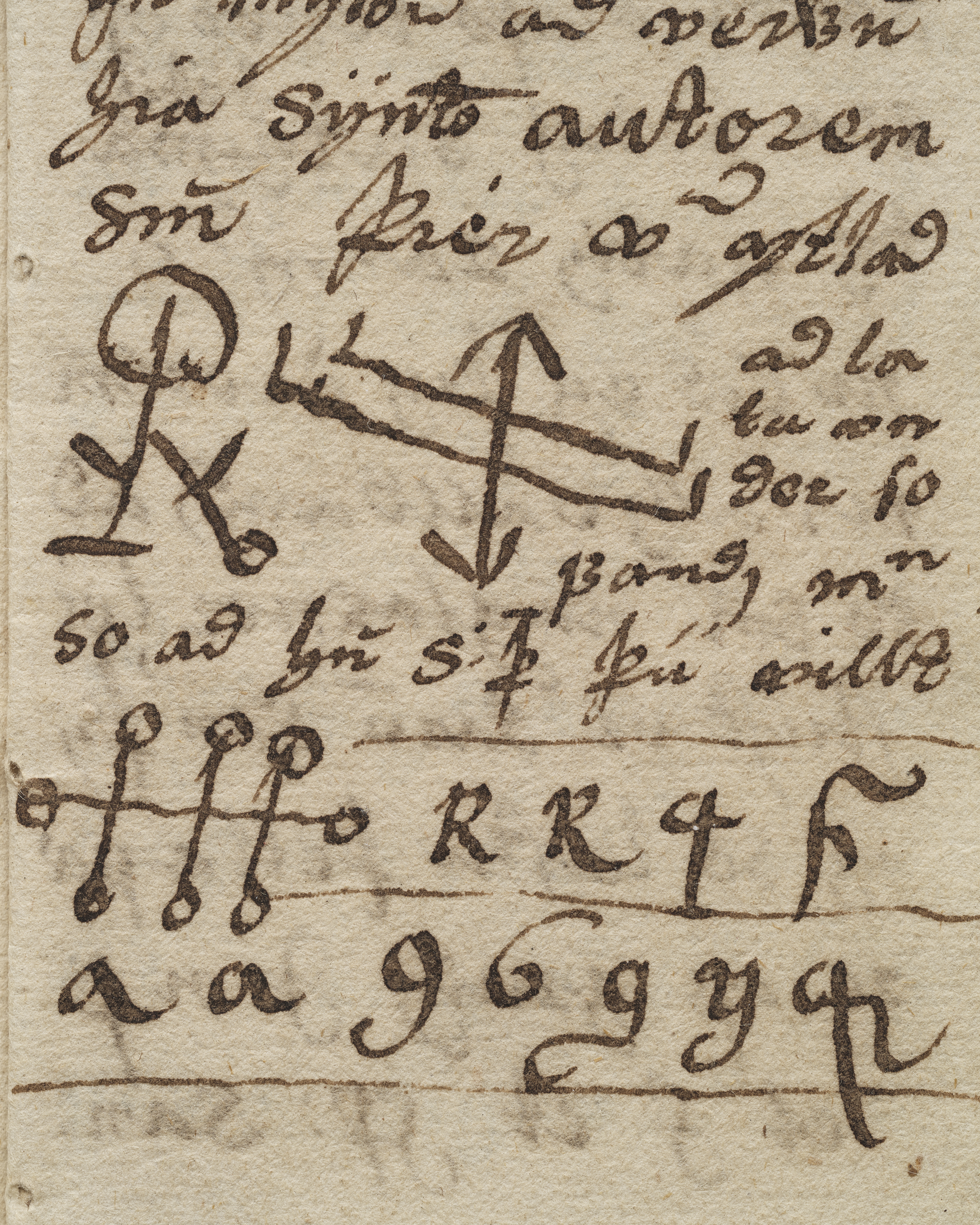 14 blad tillhörande bok möjligen skriven på isländska. Innehåller text samt ritade magiska tecken. Daterad till 1500-1600-tal.