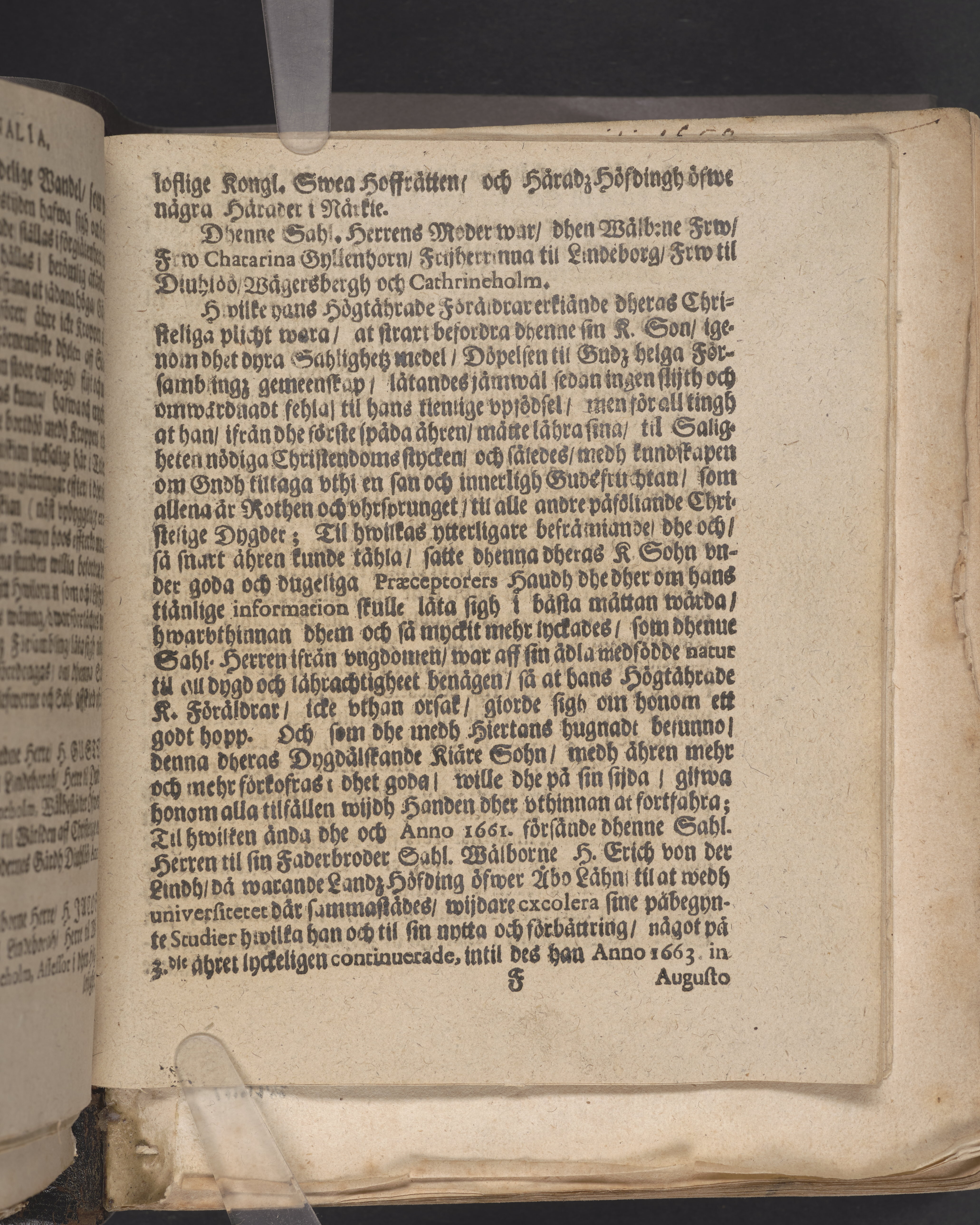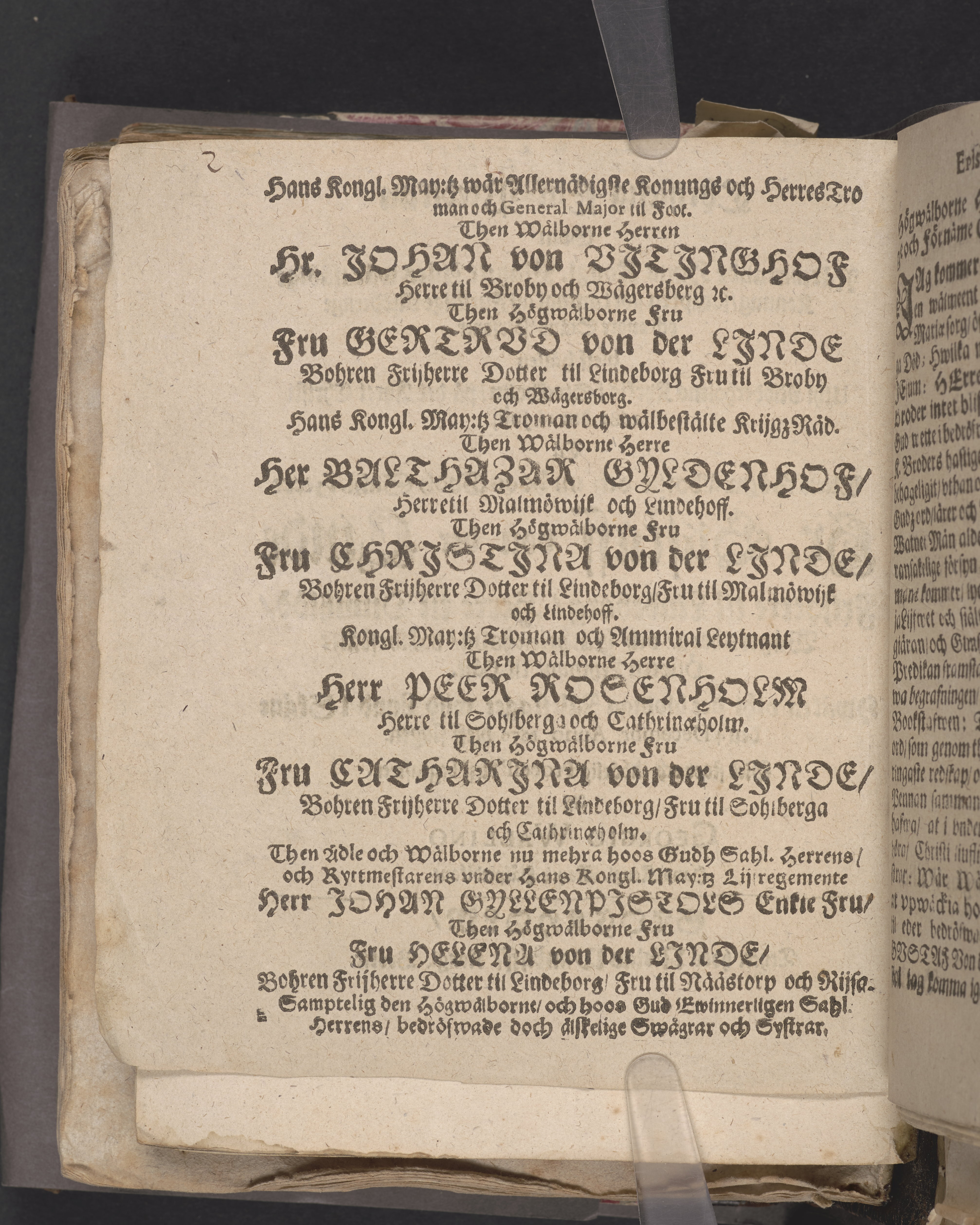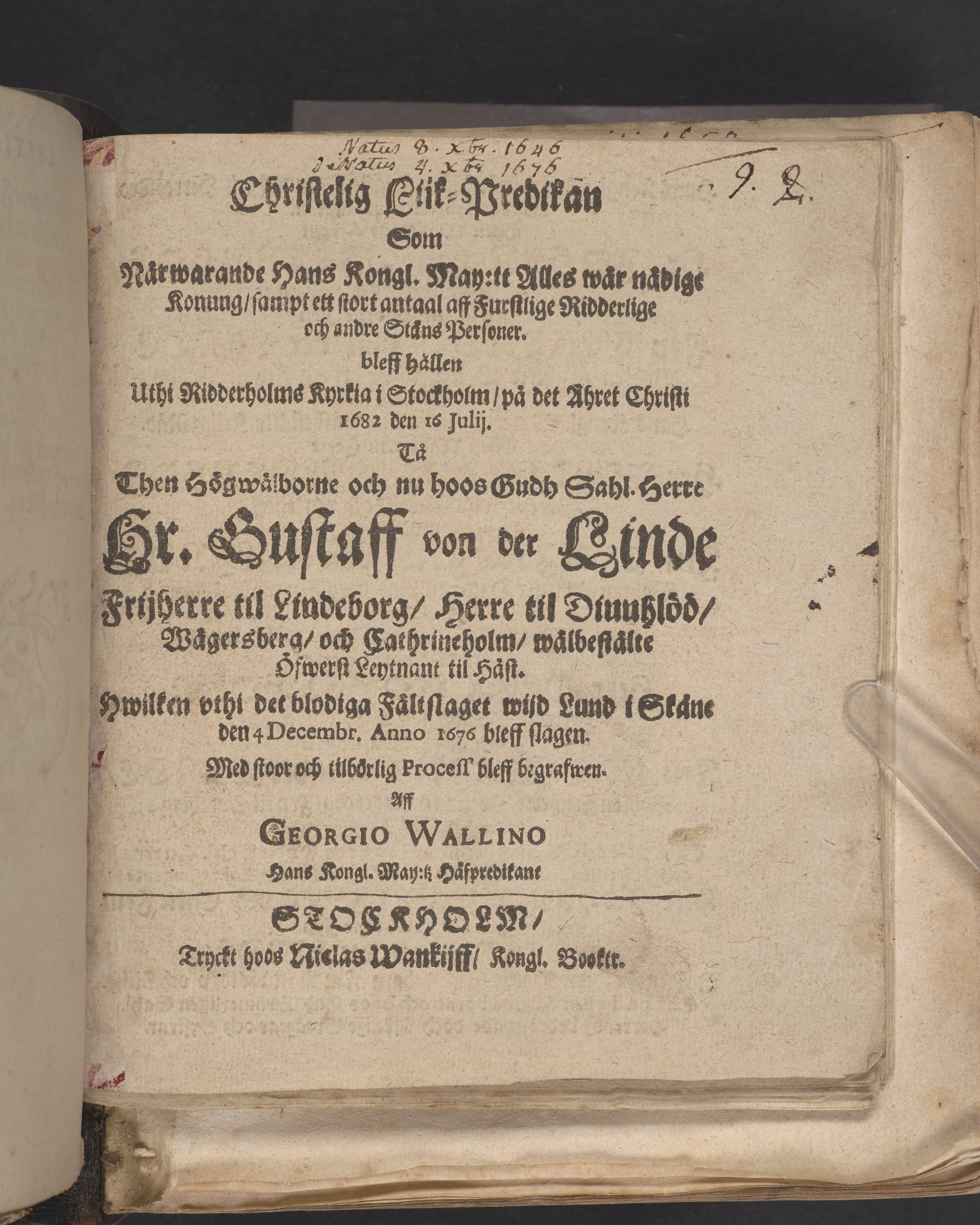 Christelig lijk-predikan som ... bleff hållen uthi Ridderholms kyrkia i Stockholm, på det åhret Christi 1682 den 16 julij. Tå then högwälborne och nu hoos Gudh sahl. herre Hr. Gustaff von der Linde frijherre til Lindeborg ... bleff begrafwen. Aff Georgio Wallino ... Stockholm, tryckt hoos Niclas Wankijff, kongl. booktr.