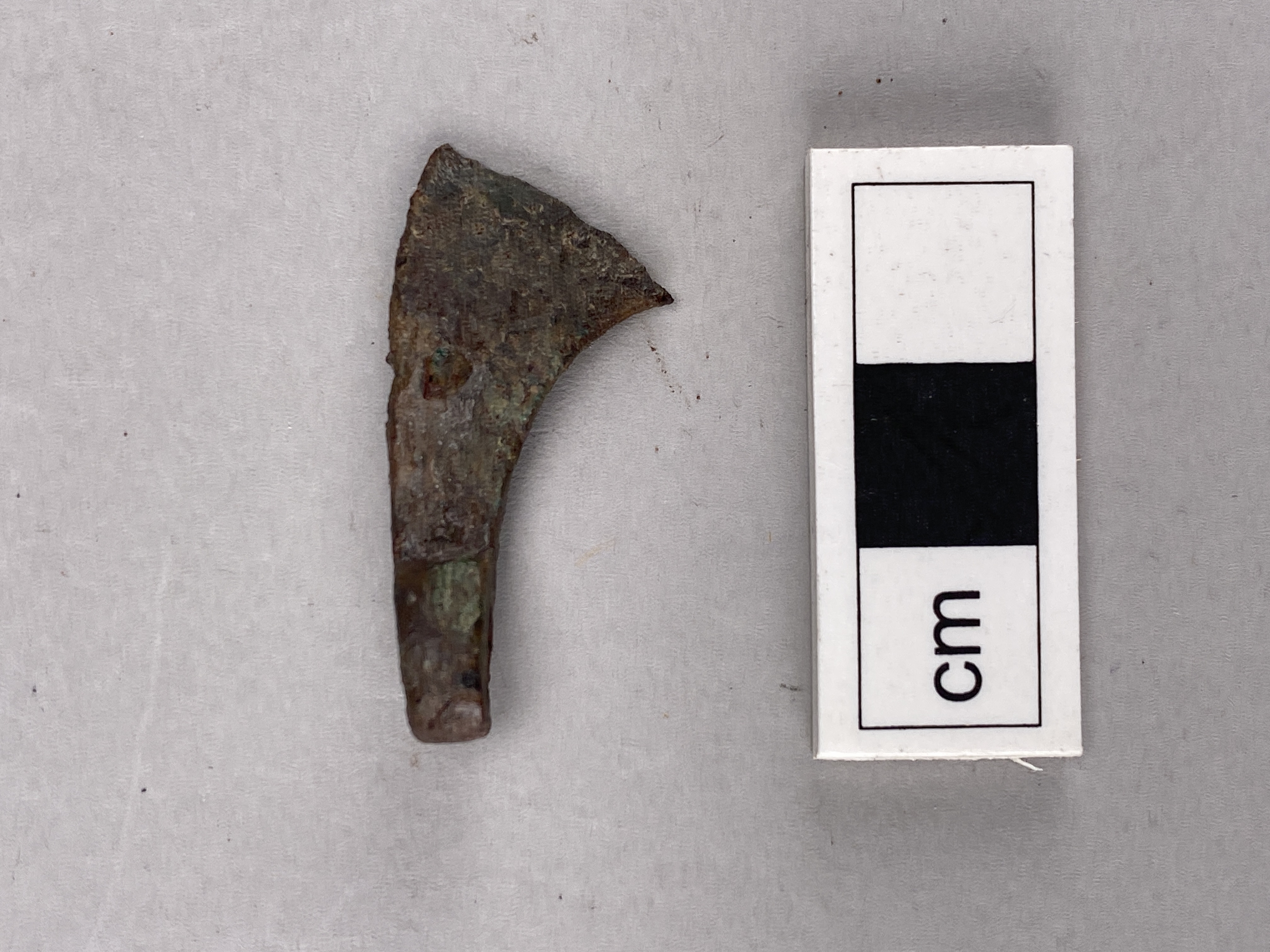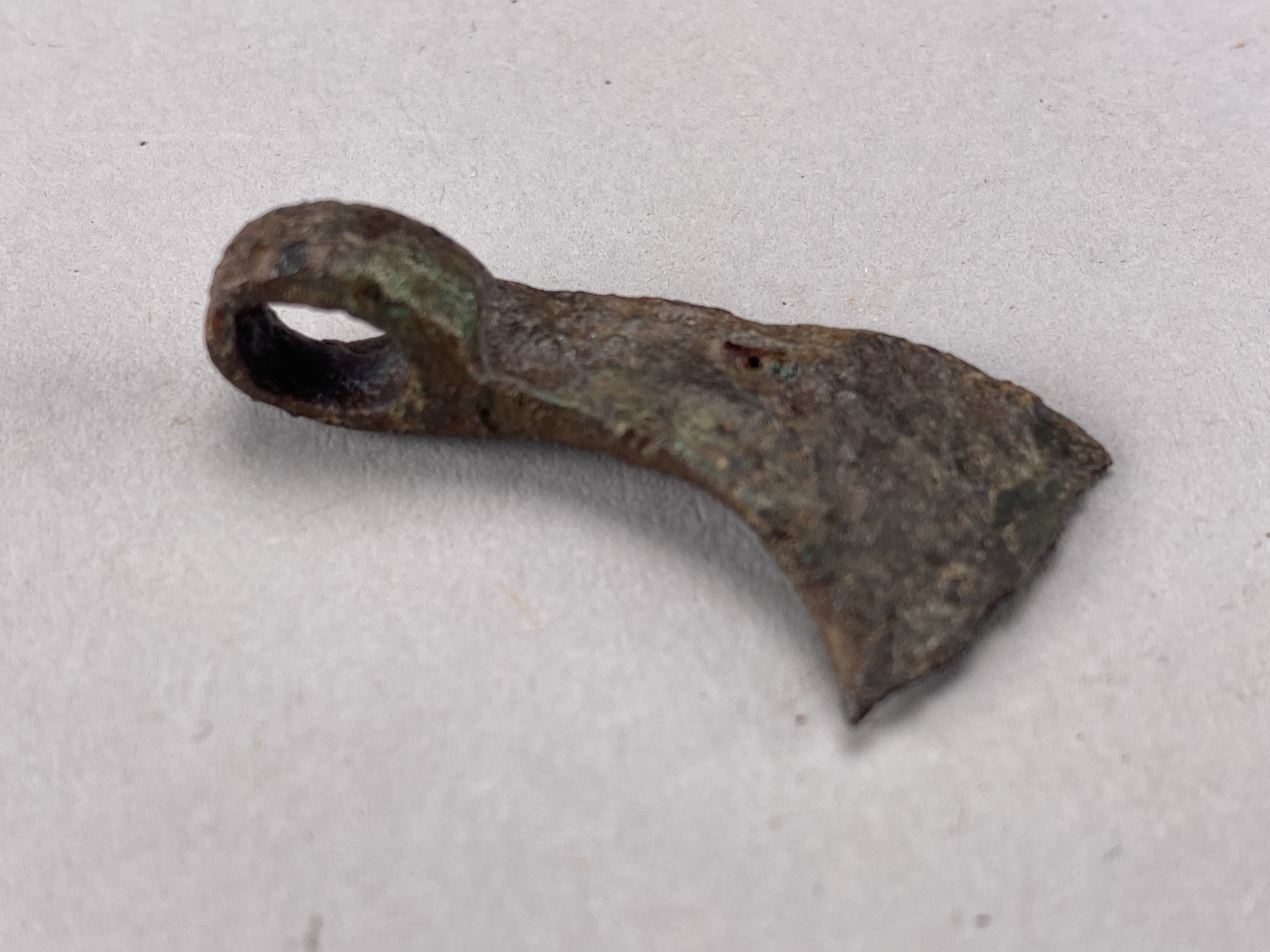Avbruten del av "arm". Fastsmält glaspärla i öglan.