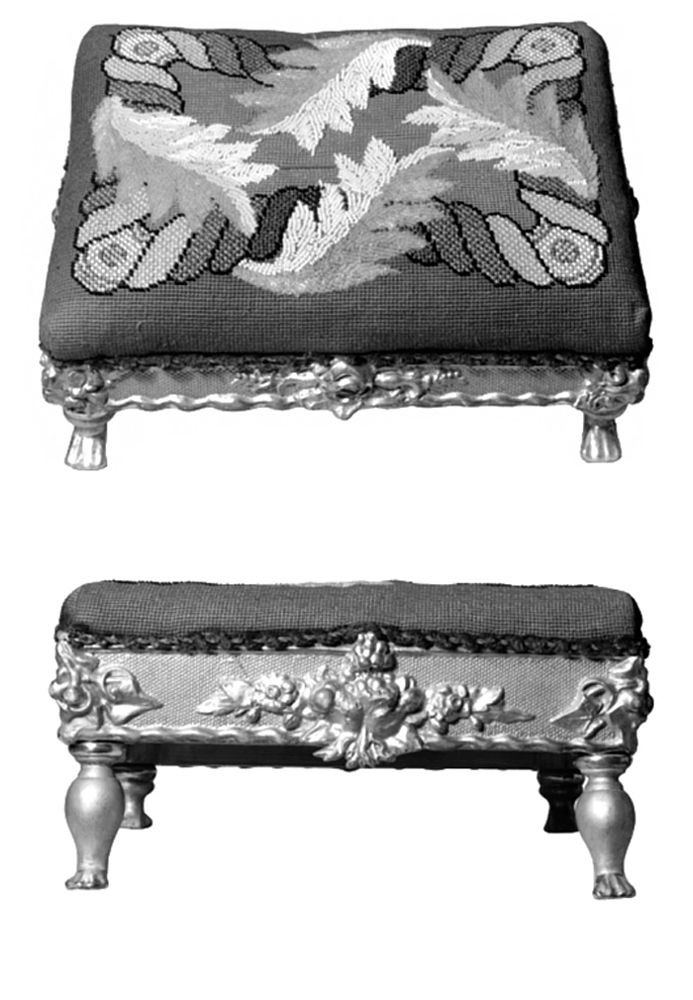 PALL Rektangulär, med fyra ben, sarg och framåtlutande sits, stoppad samt klädd med broderi i korssöm av sefirgarn och filosellsilke jämte mönster i pärlsöm och vit bomullsstramalj. Gåva till Wilhelmina Kempe på hennes lysningsdag 30 april 1865.
