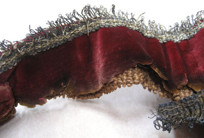 8 st grimmor af do sammet med smala guld i silfver fransar, på hvarje grimma en ring och en sölja af förgyld messing samt ett skaft af rödt silke med en liten qvast och knapp af guld, silfver och rödt silke samt 2 hvalknutar af do;