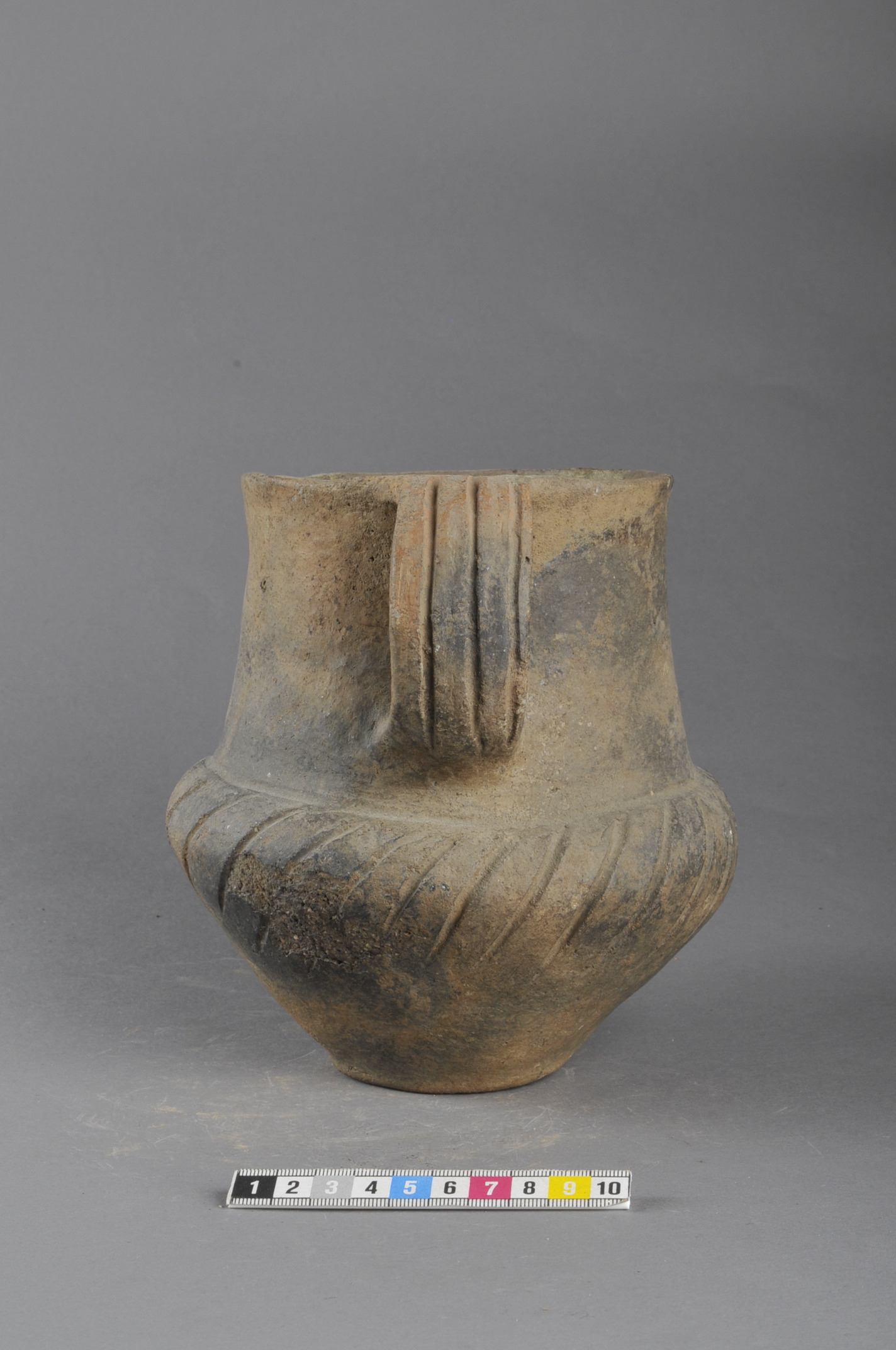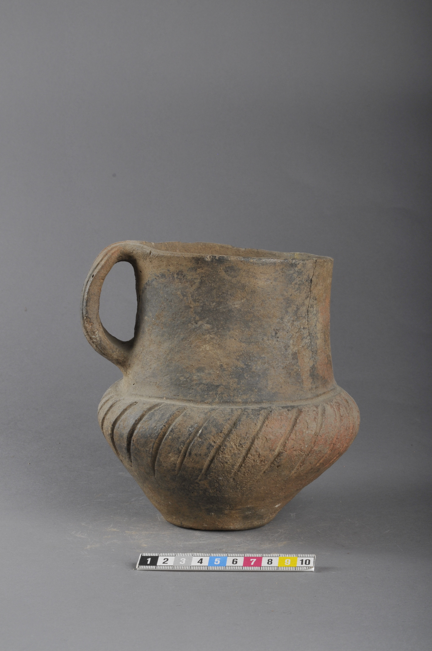 Kärl med hög, slät hals. Avsats mellan hals och skuldra ornerad med en horisóntell linje som löper runt kannan. Det övre bukpartiet är ornerat med snedställda liner och hänkeln med tre parallella vertikala linjer. Gods är brunt och glättat. Kärlet var täckt av en häll som tjänat som lock.