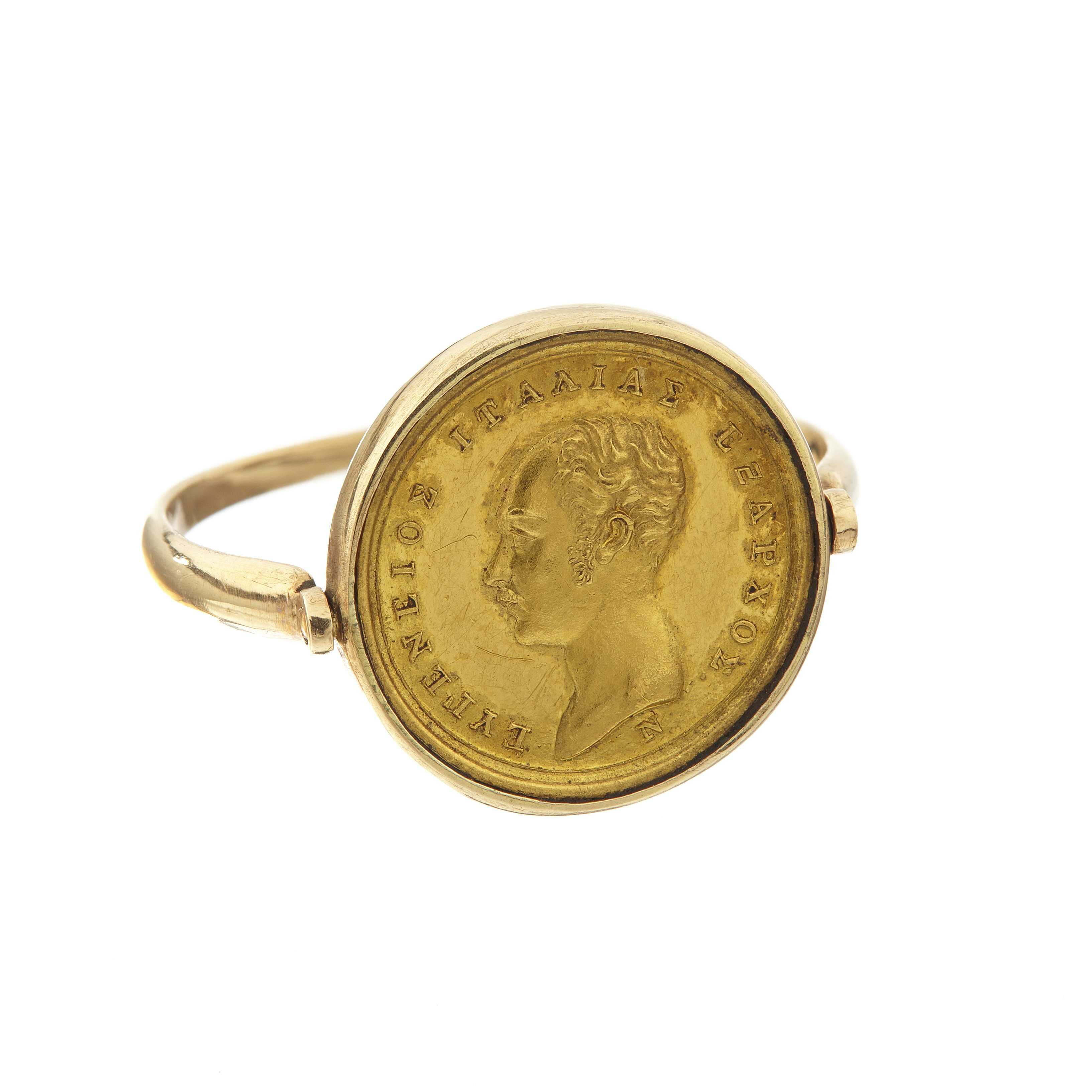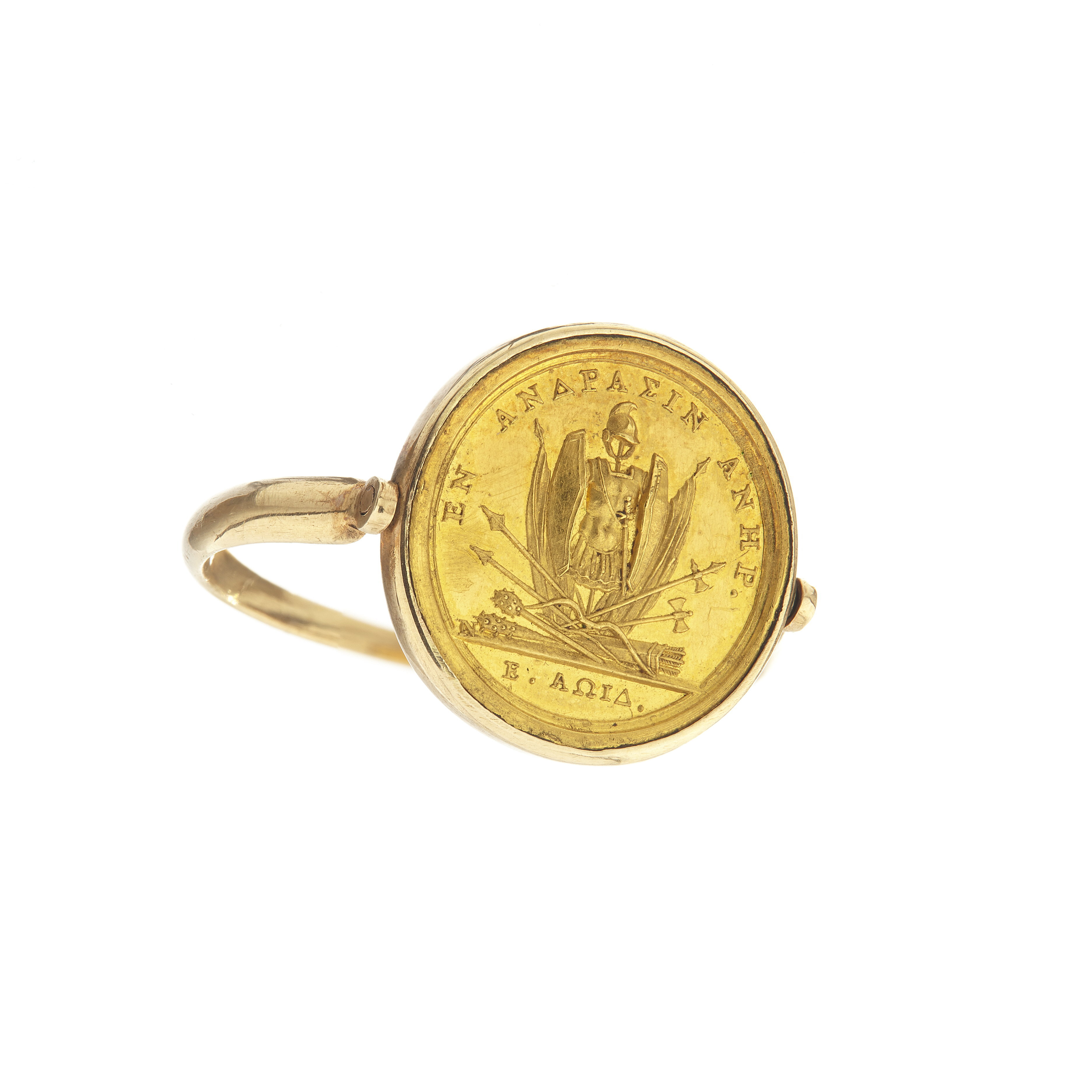 Rund vändbar platta av guld i form av medalj, åtsida: Eugene de Beauharnais, halsbild, profil v, framåtkammat hår, polisonger, mustasch, signatur vid avsnittet: N. Nygrekisk text:EYGENIOS ITALIAS EKSARCHOS. Frånsida: trofégrupp av antikt kroppspansar med hjälm, två sköldar, två korsställda fanor, två spjut, en hillebard, en dubbelyxa, en båge, två spikklubbor, en båge och ett pilkoger,grekisk text: EN ANDRASIN ANER., i avskärning nertill E.AOID.