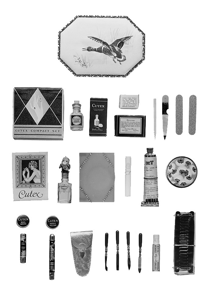 "MAKE UP"-ATTIRALJ i ask. Tolv olika toilettförermål (rör en modern kvinnas make up). Ask: Av papp, avlång, med starkt fasade hörn och utanpågående trycklock samt klädd med rödgult papper; på locket i färger en åt vänster över ett vatten flygande andrake. Lock och botten med utstående kanter, på det förstnämnda en bård, där figurer och ornament i färger mot svart botten. Höjd: 4,5 cm, längd: 26 cm, bredd: 18,5 cm. Toilettföremål: 1. En kvadratisk svart pappask, vari sex olika föremål, nämligen en flaska med gul vätska samt i svart fodral, ett stycke nagelpolityr i svart fodral, en vit putspinne av massa, en nagelfil av stål, två sandpappersskivor jämte bruksanvisning, tryckt på flera språk. 2. En parfymflaska med porslinspropp i form av ett kvinnohuvud med grön mössa. 3. Ett rektangulärt cigarettetui av guldröd och svart celluloid samt innehållande fem cigaretter; i locket en liten rund spegel. 4. och 5. En tub crème (Veet) för borttagande av överflödigt hår jämte en spatel av björk, jämnbred, med rundade ändar. 6. En rund puderdosa av mässing, innehållande ljusrött fast puder och en puderlapp. 7. Två små runda dosor av svart och gredelin celluloid, den ena innehållande vit, den andra rödbrun polerpasta. 8. Ett fodral av förgyllt skinn, innehållande en nagelfil, en nagelkniv och två nagelputsare, alla med svagt koniskt skaft av ljusgrön celluloid. 9. En tub av vit celluloid med vitt polerpulver för naglarna. 10. Ett par bågformiga onduleringskammar (PEANCO) av brun celluloid jämte bruksanvisning, tryckt på flera språk. 11. Ett läppstift i tub av mässing. 12. Ett tuschstift i tub av mässing. Föremålen liggande i asken på ett ljusgrönt sidenstycke. Gåva till Wilhelmina von Hallwyl julaftonen 1927 från hennes dotterdotter Carola Johanna Cecilia Wachtmeister af Johannishus. Gåvan åtföljd av ett poem samt ett meddelande från Erik Österlunds Antikvariat. Se grupp LXIV: Arkiv.