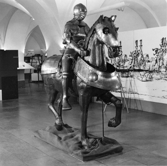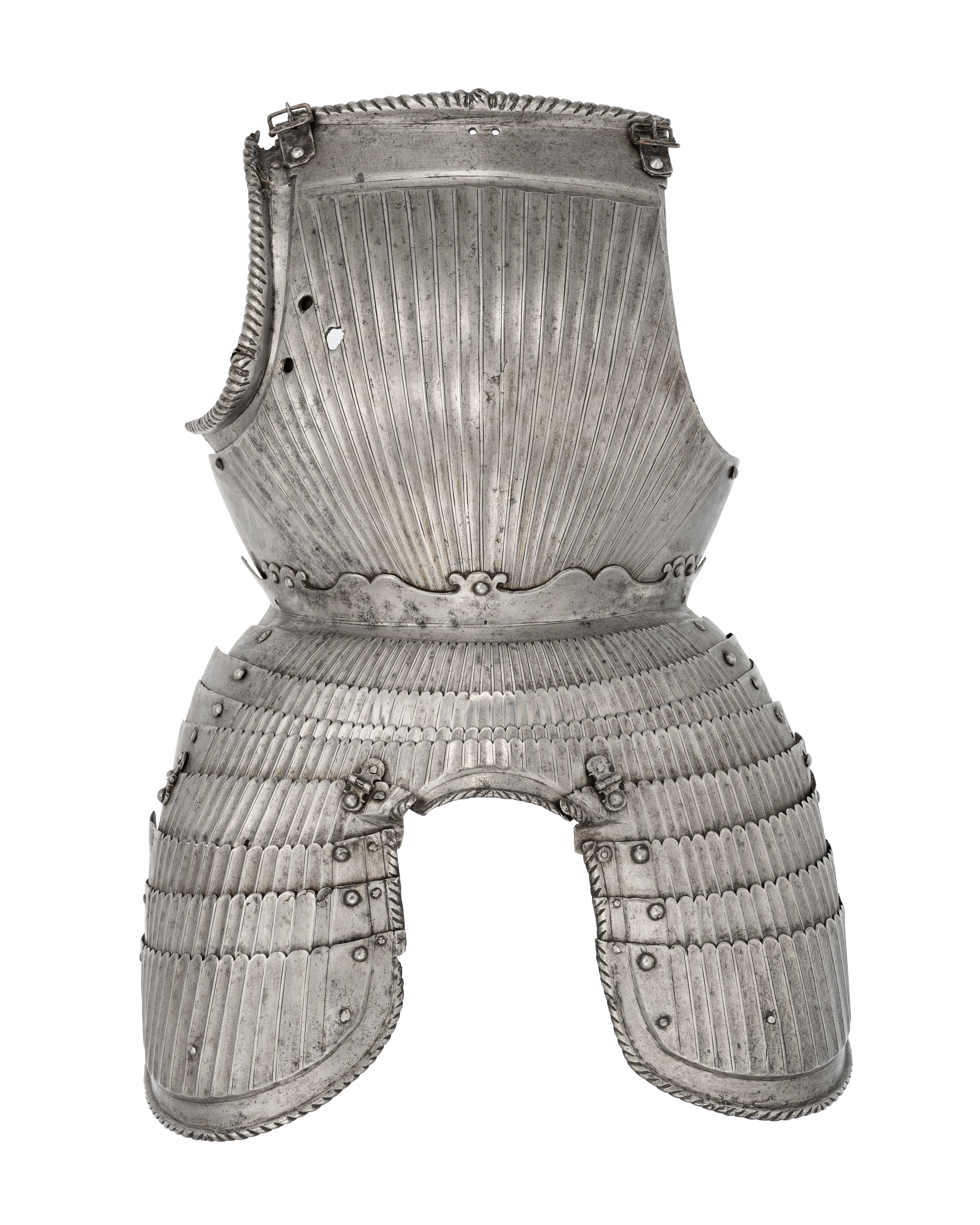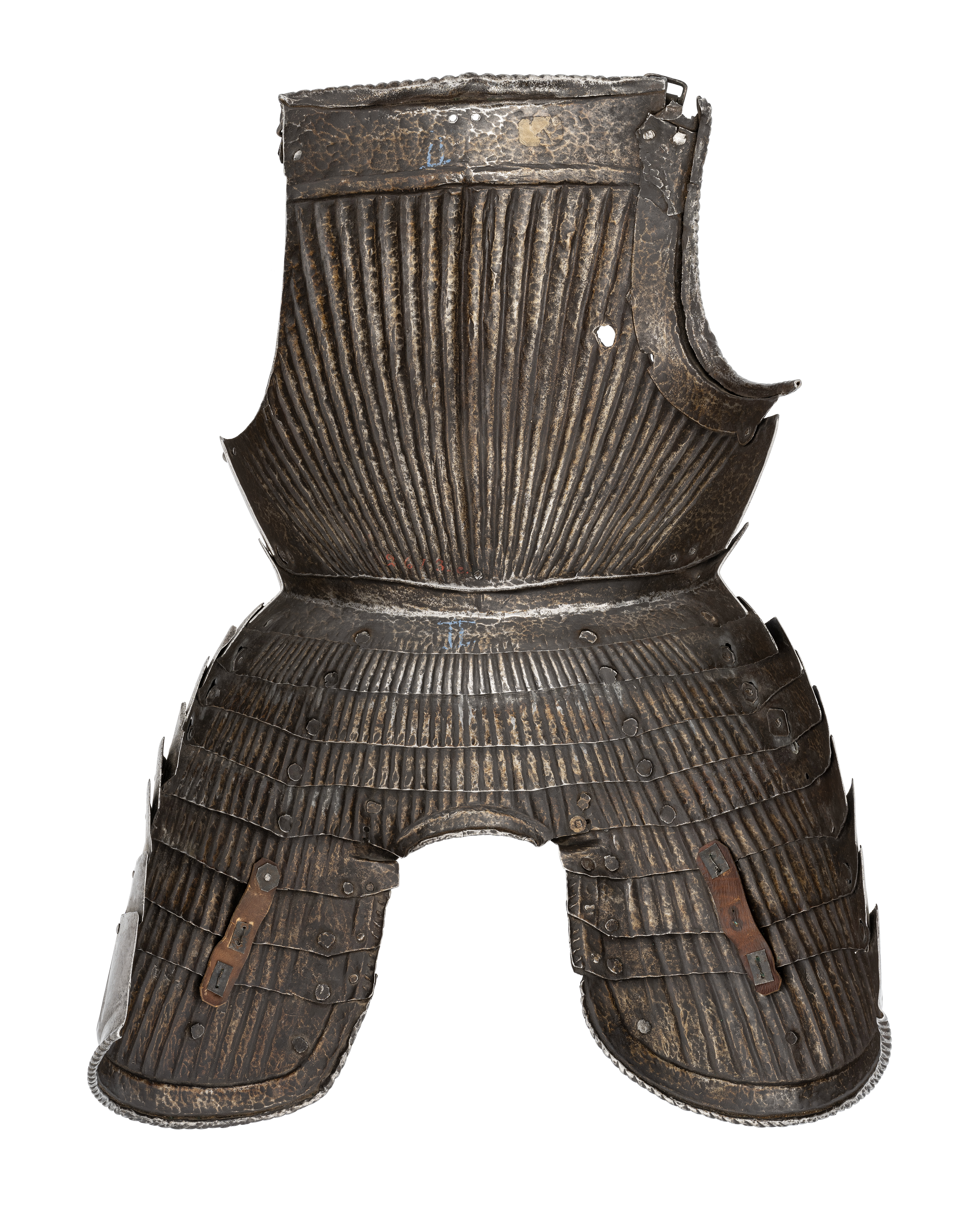 Bröstharnesk med bukskenor och tasetter (15 delar) av smitt räfflat stål. Av Maximiliantyp. Bröstharnesket består av en bröstplåt, höger insättning och plakard (vänster insättning saknas). Bröstplåtens överkant är liksom höger insättning inåt omvikt och rundsmidd med räfflad repdekor. Därunder, på bröstplåten, ett 40-45 mm brett blankt fält som följs av en ca 14 mm bred nedsänkning. Därnedanför är bröstplåten markant kupad och välvd och med en något utskjutande mittås. På ömse sidor om mittåsen, 18 respektive 17 räfflor med svagt utskjutande åsar med två huggna linjer som strålar mot grenpartiet. Armurtagens kanter är fasade. På höger sida tre huggna hål för fastsättande av lanshake. Insättningen är nitad med två nitar vid bröstplåtens armurtag. I övre niten sitter även en sekundär sölja. På vänster sida även en sekundär sölja. Insättningens övre och undre kant något skadad. Mitt fram, under den rundsmidda kanten, två små slagna hål. Plakard med profilerad och fasad överkant (mycket lik inv.nr. 24719), nitad med fem nitar vid bröstplåten. Nederkanten utsmidd.Markerad midja i form av två huggna linjer. I sidorna ovanför mitten, två senare uppslagna hål. I plakardens nederkant är den översta bukskenan fastnitad. Fyra stycken vid varandra nitade bukskenor, den nedersta med inåt omvikt, rundsmidd kant med huggen repdekor vid urtaget för blygdkapseln. Därovan en 11 mm bred nedsänkning. Varje skena med 45 stycken, uppåt sammanstrålande, räfflor vilka avslutas med en fasad överkant med vågig profil. Tasetterna är fästa i nedersta bukskenan med vardera två gångjärn. Vardera tasetten består av fyra delar. den högra med 14 räfflor och den vänstra med 15. De följer samma linjer som bukskenorna. Tasetterna insida och underkant är inåt omvikta, rundsmidda och med mejslad repdekor. Därovan och innanför en 11-18 mm bred nedsänkning. Insidan saknar lädret som hållit samman bukskenorna. Tasetterna med sekundärt läder och något saknas helt. Både bukskenor och tasetter är nitade direkt i varandra på avlånga hål för ökad rörlighet. Sannolikt har tasetternas innerkanter samt mitten av tasetter och bukskenor suttit fast med nit och läder. Utförandet är mycket likt inv.nr. 24719 såväl i storlek som räfflornas storlek, kanternas profiler, gångjärnen och proportionerna. Det är sannolikt samma verkstad som dessa båda harnesk har tillverkats i. Också inv.nr. 20231 har likheter som gör att även detta skulle kunna vara tillverkat i samma verkstad. Däremot avviket plakardens profilering, men gångjärn, räfflor, repdekor och hantverksspår överensstämmer med de övriga.