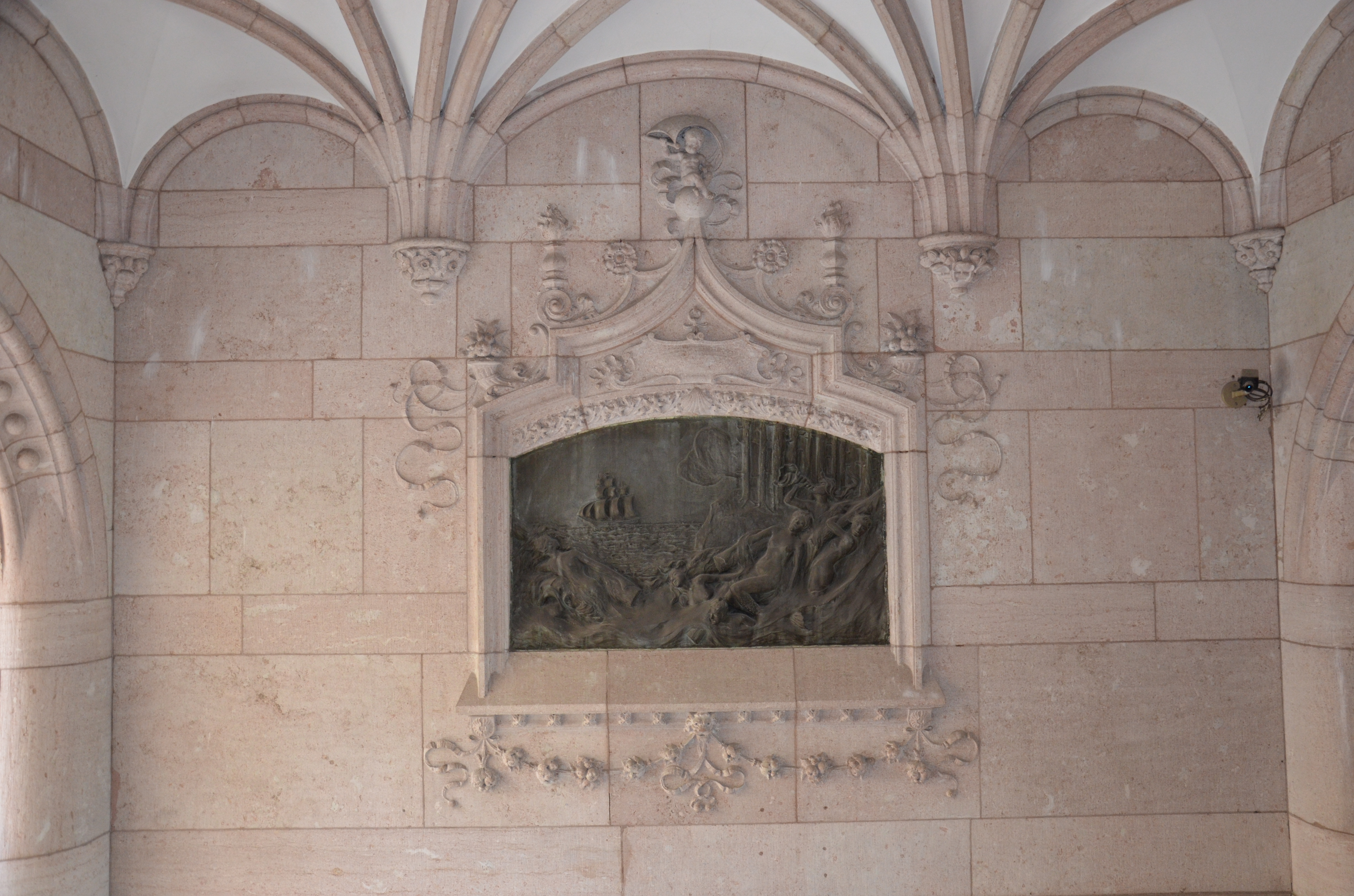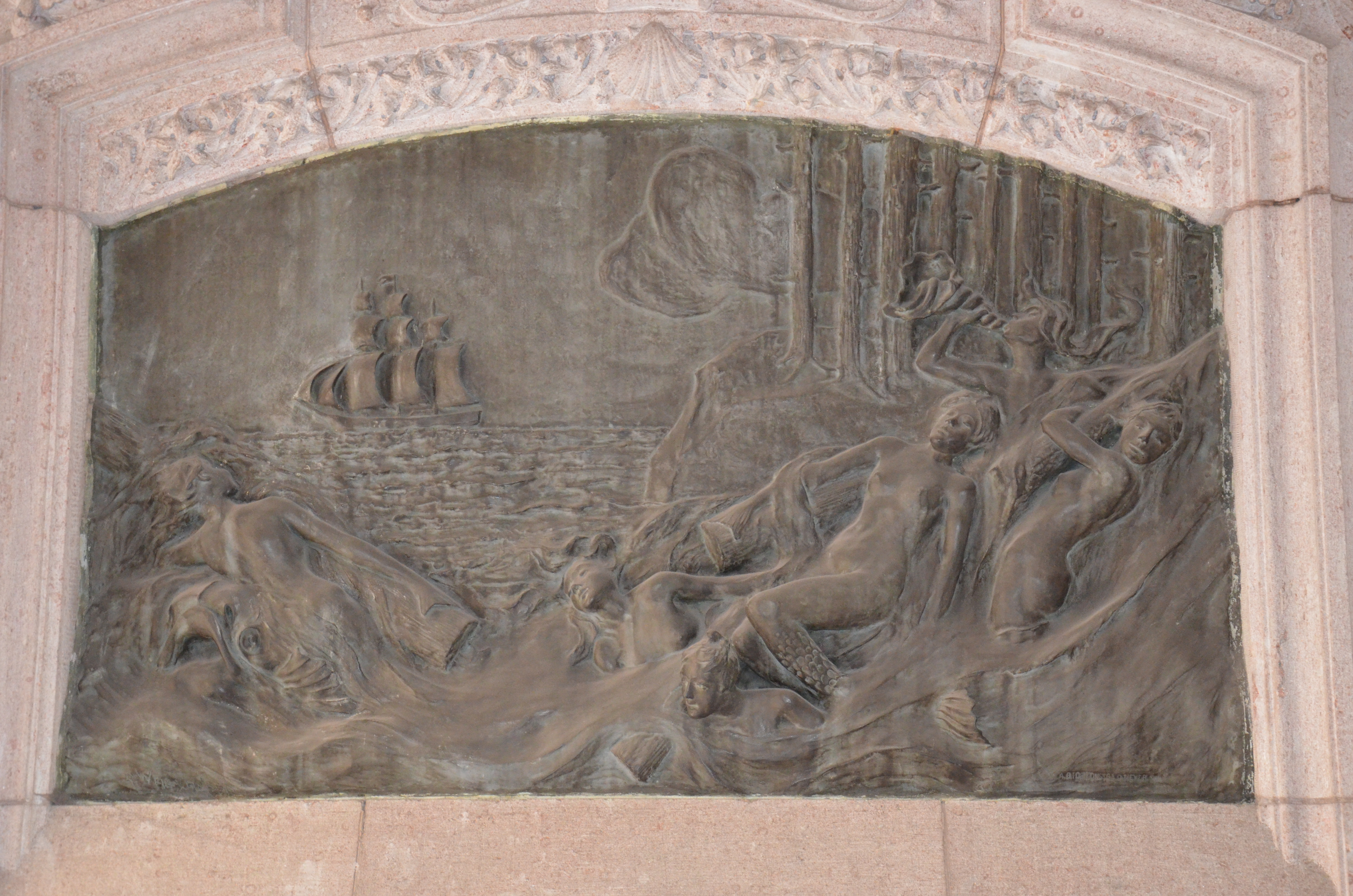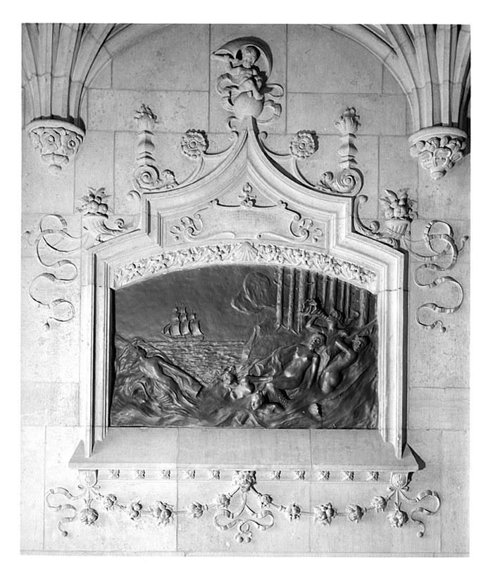 Skulptur. TIMMERUTSKEPPNINGEN,reliefplatta av brons. Motivet, med forsande älv, ett skepp, flytande timmerstockar delvis burna av sex najader, syftar på firman Wilh. H. Kempes verksamhet i Norrland (Ljusne-Woxna Aktiebolags sågverksrörelse) samt familjeförmögenhetens ursprung. Modellerad efter beställning av Walter och Wilhelmina von Hallwyl av konstnären Alf Wallander 1898.