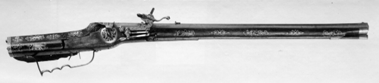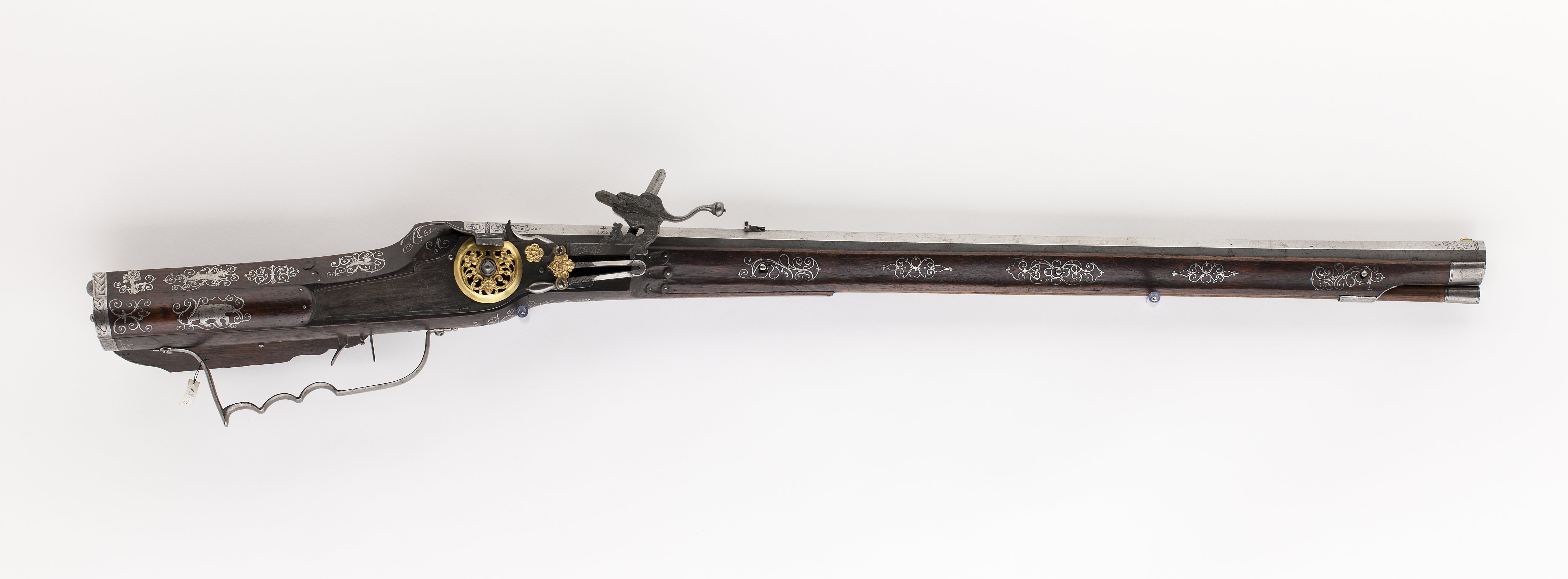 Åttsidig pipa av stål, 10 räfflor, raka bommar. Graverade blomrankor på kammaren, framför siktet och runt kornet, bård vid pipans båda ändar. På kammaren stämpel: MG och lejon (Stöckelnr 456) samt "M.G. 1648". Riktmedel: Klaffsikte av stål, stolpkorn av mässing med tvärgående V-skåra. Fästning: Tre häften, pipan fäst med krysskruv samt tre pipstift av stål. Hjullås med plant låsbleck av blånerat stål. Hjulet täckt av välvd, genombruten, ciselerad kapsel av förgylld mässing med blommor och änglahuvud. Fängpanna med svagt rundad framkant, linjedekor. Bakåtböjd, tungformig krutskärm. Fängpannelock med rörlig arm. Blomformig tryckknapp av förgylld mässing i form av änglahuvud. Hane med kantig kropp med graverad dekor i form av voluter. Lös överkäke med s-formigt svängt fingergrepp med kulformig ände. Böjd, konturerad hanhals med graverad skärm i form av fantasidjur. Högt, fyrsidigt käkskruvhuvud. Hanfjäder med droppformigt, blånerat fjäderlöv. Hanstudel av förgylld mässing, gjuten och förgylld i form av änglahuvud. Fästning: Två låsskruvar. Avtryckare med snälltryck. Rektangulärt avtryckarbleck av stål. Helstock av valnöt med kolv av tysk typ med kolvlåda och snidad volut på vingen, kolvlådelock av stockens trä. Kolv och delar av framstocken med dekor i form av inlagda ståltrådsrankor, stålstift samt graverade figurer, hare, träd. Beslag av stål. Bakplåt med stödkula. Två graverade låsskruvsbrickor i form av blommor. Näsband och överrörka. Varbygel med tre fingerlägen, bakre armen avslutad i en konturerad platta. Tillbehör:Laddstock av trä, skoning av stål. Två pappersbitar med text: "No 302, 267 (?) och "Carl X, No 302"
