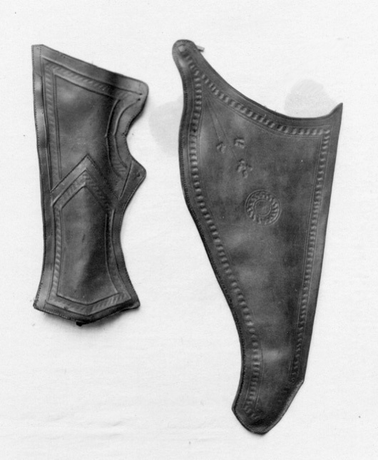Koger av brunt läder på utsidan ornerat med pressad dekor i form av kantbård och cirkel på mitten med våglinjer. Insidan slät med upphängningsögla i ena hörnet.