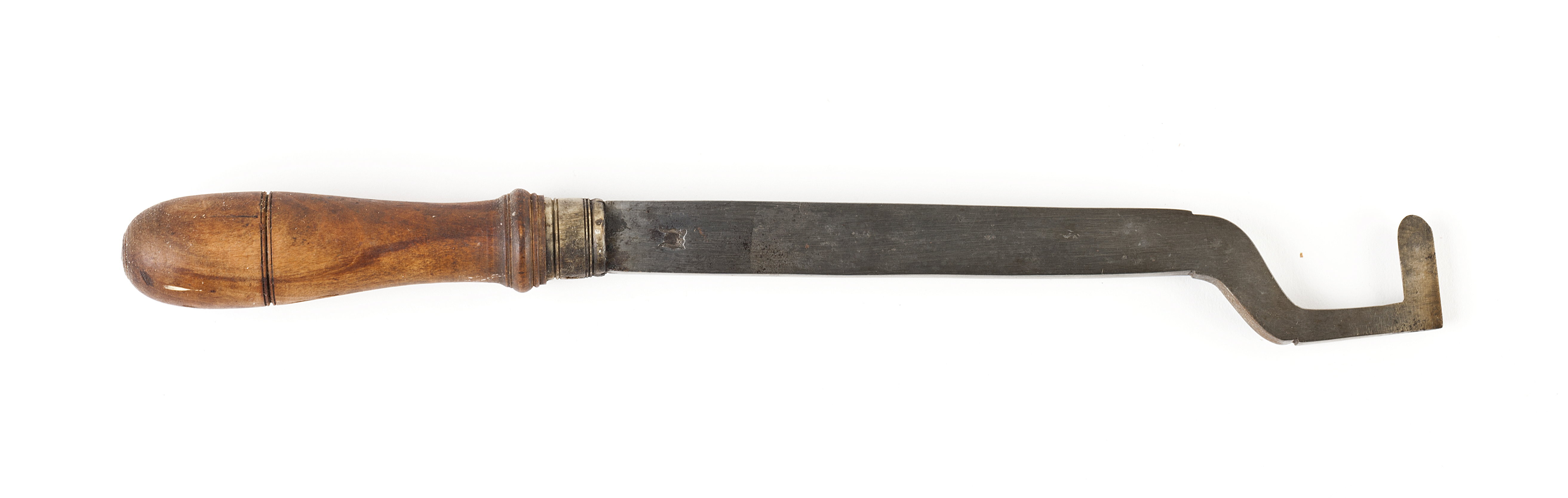 Klinga med rektangulär genomskärning. Änden böjd i en trubbig och en rät vinkel. Rundad egg, parallell med stålet. Stämplat på klingan: oxenstiernska vapnet. Svarvat skaft av päronträ, med en vulst nedtill. Hornring.