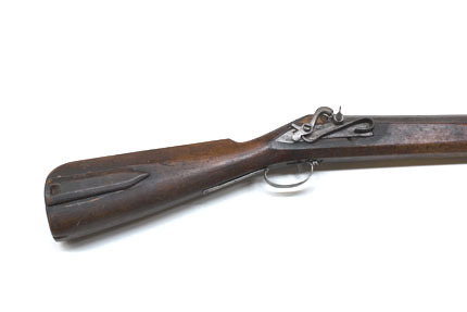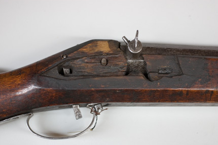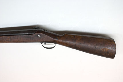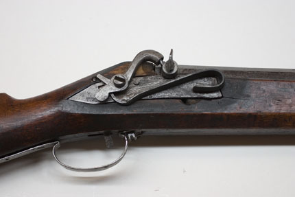 Åttsidig pipa av stål, 10 räfflor, på undersidan slagmärken från smidet, smala sprickor och märken efter skruvstädet, rundade kanter. Rektangulärt, i vinkel böjt svansskruvblad. På kammarens h. sida en rund snäcka med tändhattsnippel och plunderskruv med platt, ojämnt runt huvud med mitthål. Riktmedel: Inlaxat ståndsikte, fastlött stolpkorn av mässing. Fästning: Ett inlaxat häfte. Pipan fäst med krysskruv underifrån samt ett pipstift i form av ett avbitet, runt stålstift. Slagsnapplås med plant, flintlåsliknande låsbleck, främre övre kanten böjd i vinkel över stocken, blecket rakt avskuret framtill. S-formig, fyrsidig hane med avfasade sidor, långt utdragen hanfot. Utvändig slagfjäder, framåt-uppåtböjd framtill samt uppböjd bakom hanen. Studeln s-formig, bred med baktill en skruv för fäste i låsblecket. Fästning: Kraftig, rak avtryckare, fäst i stocken med ett stålstift. Helstock av fernissad björk med sluten laddstocksränna. Kort, rundad, nedåtböjd kolvhals, rak kolv med ovalt tvärsnitt, 40 mm djup kolvlåda. Plant lock med fasade kanter, tumgrepp. Två mässingsnitar på kolvhälen, rund läderplatta på krysskruven mellan svansskruvblad och stock. I piprännans botten borrade hål ner till laddstocksrännan, de främre förenade med en slits. Vid mynningen inskuret en sicksacklinje. Bandformig varbygel av stål, främre armen rundad, fäst med krysskruven, stolparna bakåtböjda, bygel med hål, bakre armen utdragen och fastspikad, två extra hål.