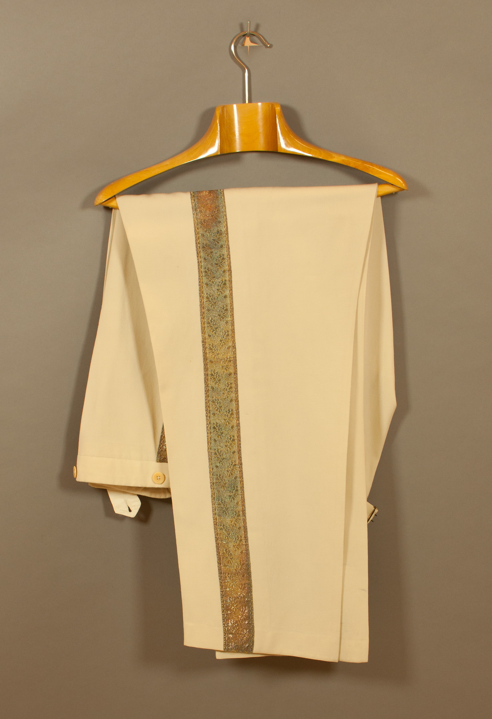 Långbyxor av vit gabardin, yllediagonal, skurna med gylf med sex knappar av vitt ben med firmanamn: " J. M. JANSSON & WALLGREN". I linningen åtta knappar. I vardera sidan 50 mm bred guldgalon samt fickor i sidsömmen. Mitt bak spänntampar med firmaetikett: "J. M. JANSSON & WALLGREN // HOFLEVERANTÖR // 11.3 STOCKHOLM 1929 // Kab.kam.herre /7 E. Boström". Foder i linningen av vit bomull, fickor av vit bomull.