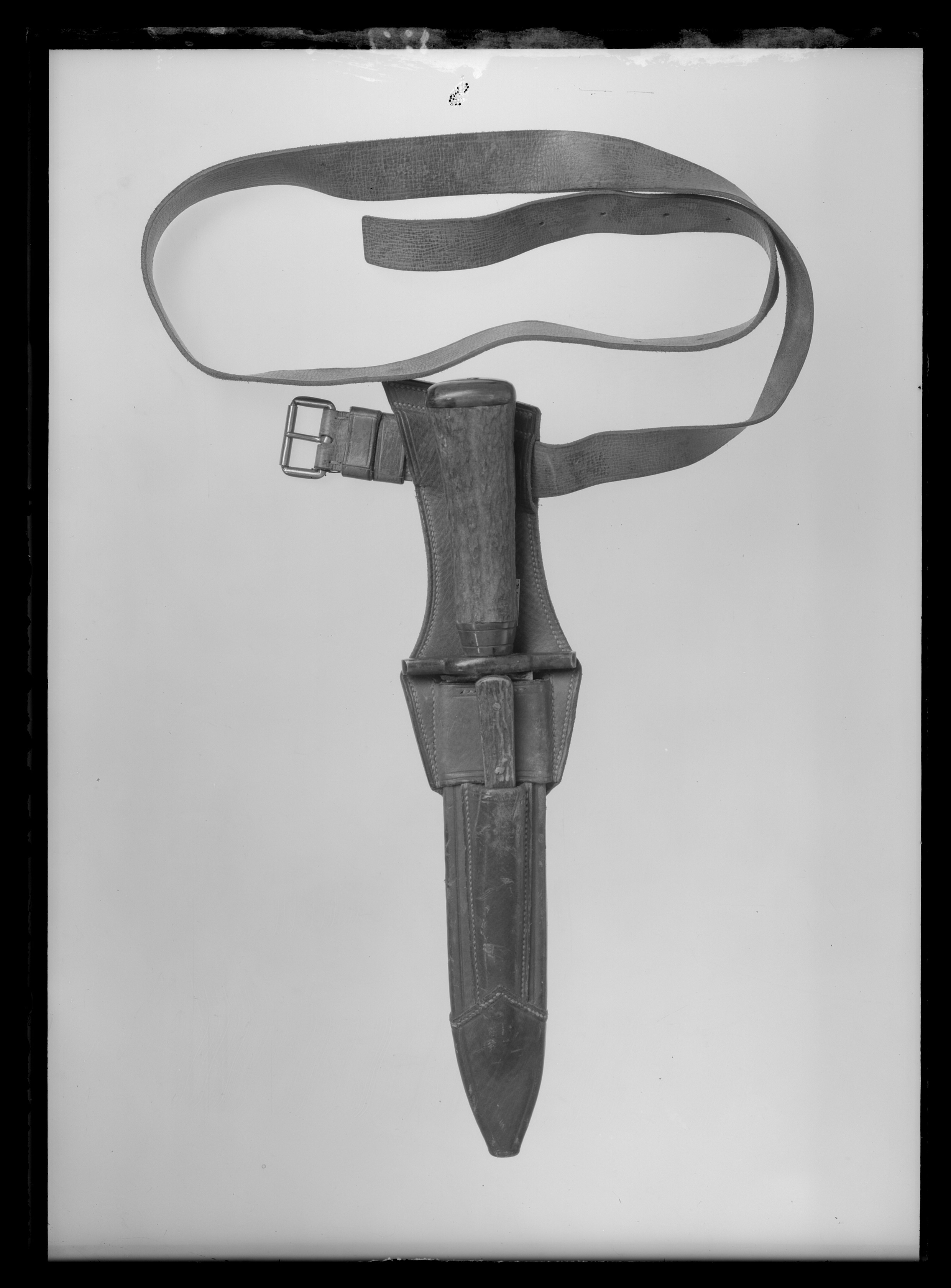 Fäste av brunt horn upptill med oval skoning av grön-grått horn och nedtill på fästet 15 mm hög ringformig skoning av stål med två inpressade raka linjer. Korta raka, parerstänger med rektangulärt tvärsnitt. Klinga bred, rak, eneggad högglanspolerad förnicklad (?). Plan, brev rygg. 62 mm från uddan är klingan slipad på ryggsidan. På insidan vid basen inslaget: "GEBR. KELLNER // WIEN."