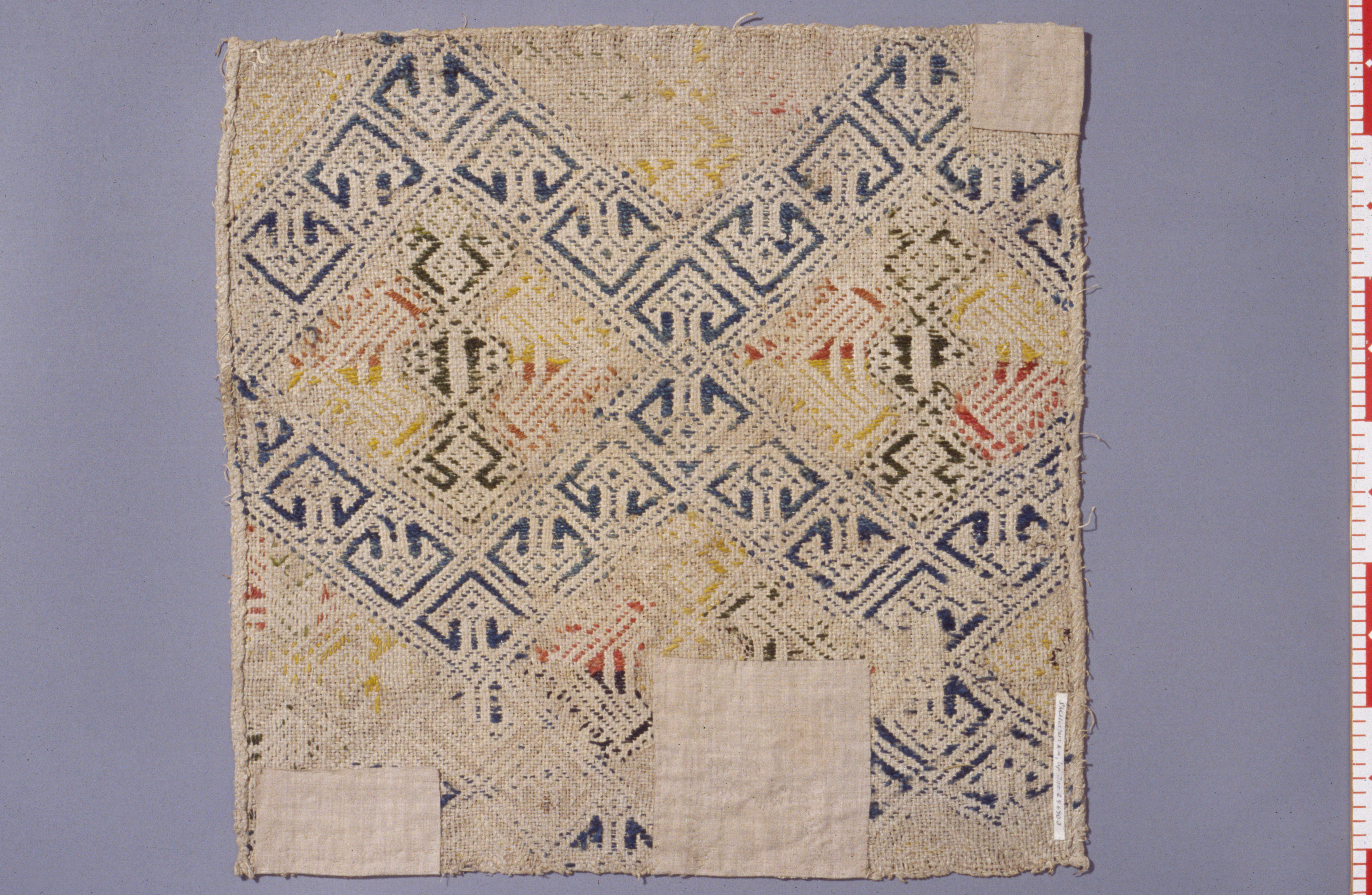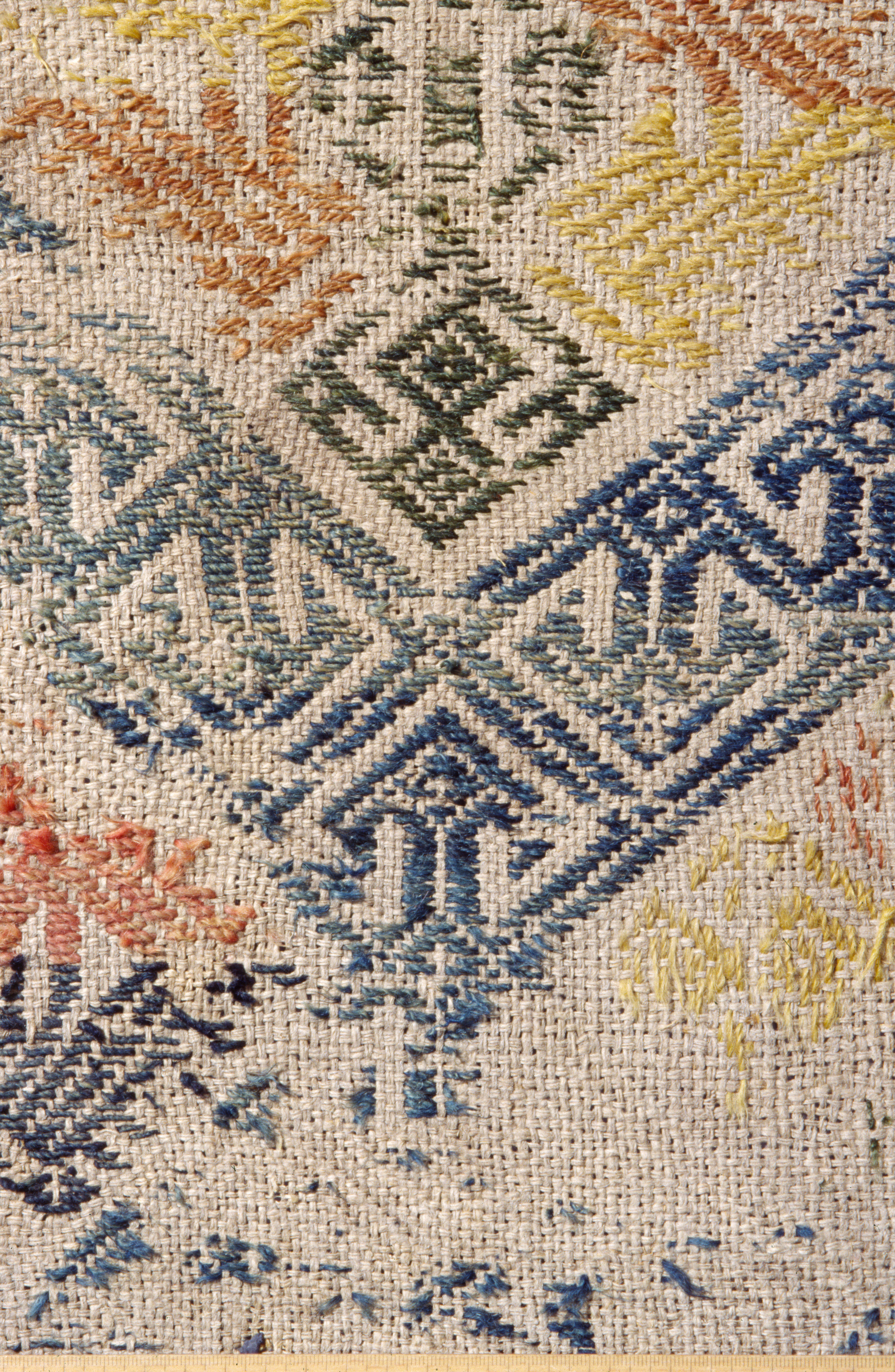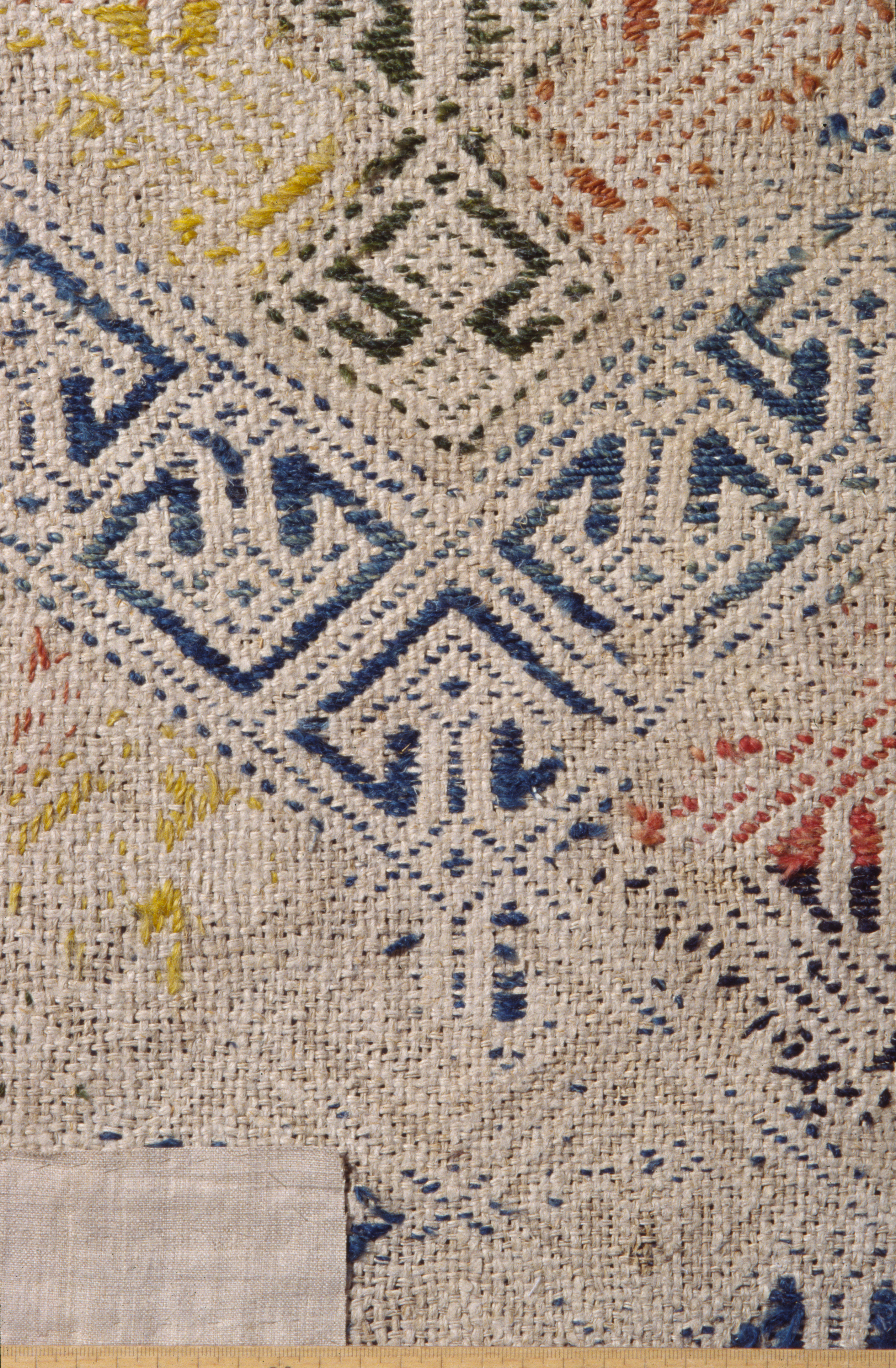 Grov tvistväv i linne. Broderad i vävsöm i blått, grönt, gult och rött ullgarn. Symmetriskt ytmönster med geometrisk teckning av stora rutor kring ornament. Svenskt arbete. Deponerad 1952.