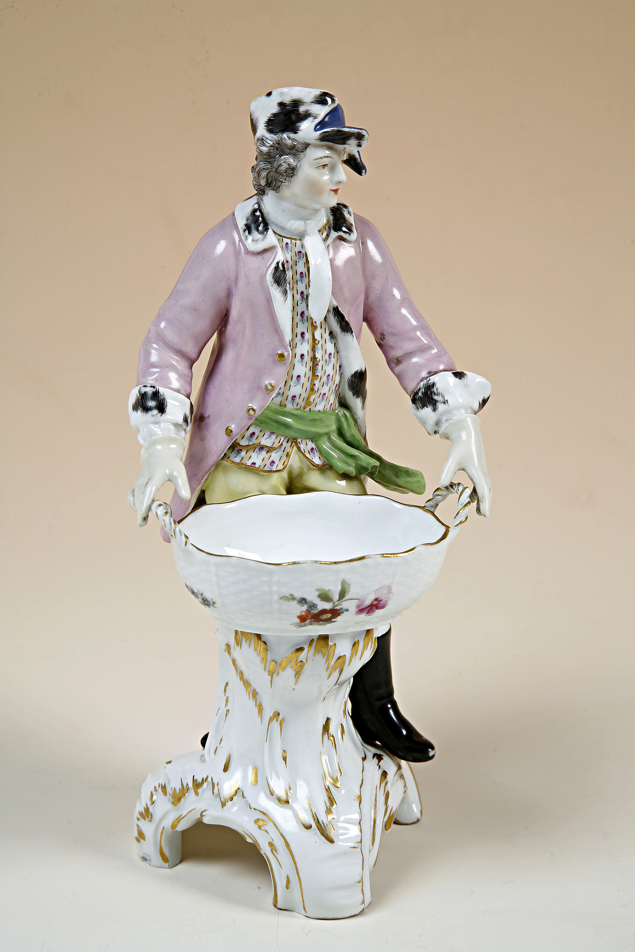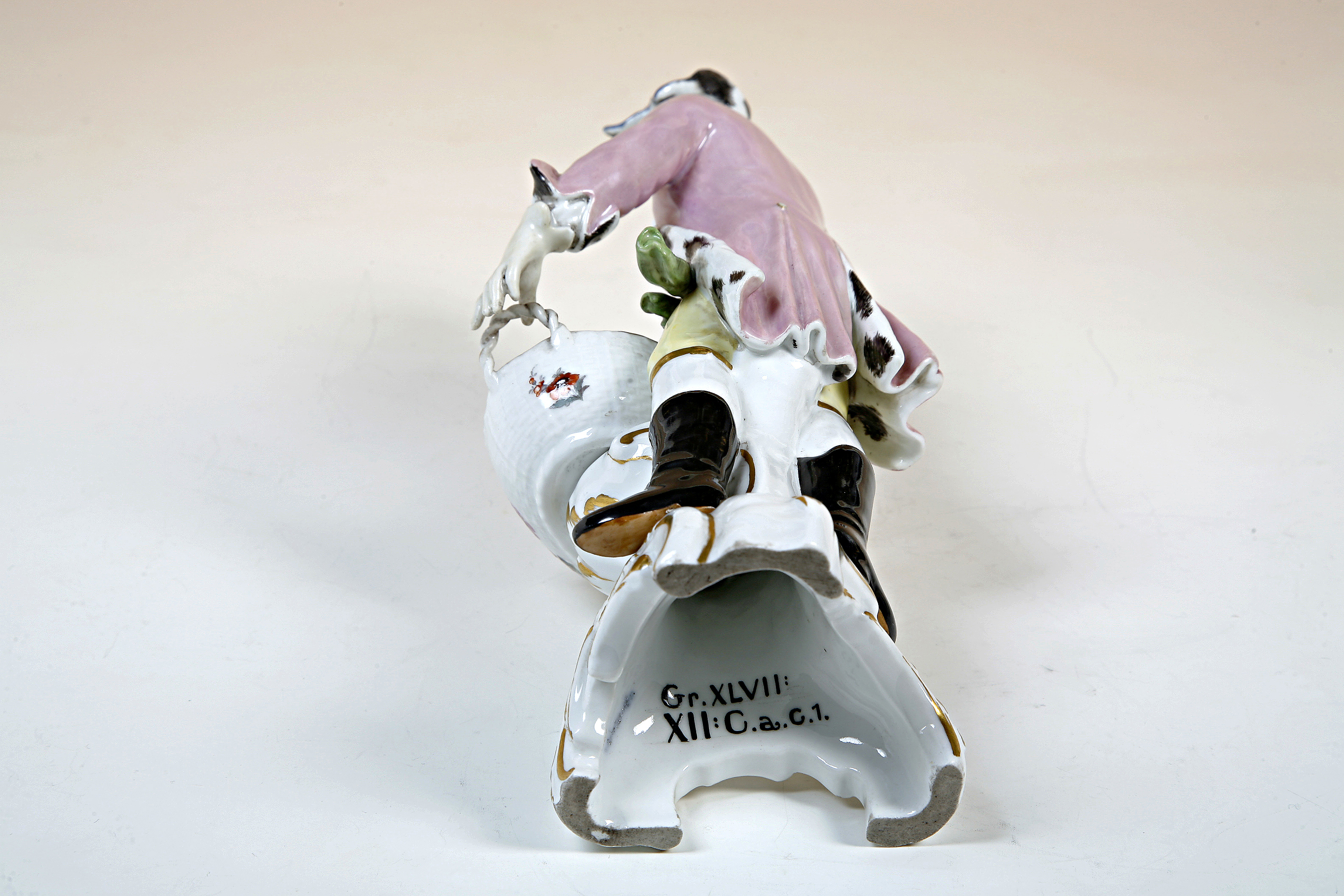 FIGURIN. Ung man med videkorg symboliserande "Vintern" ur serien "Årstiderna" efter modell av Friedrich Meyer omkring år 1765. Dekor i färger och guld på glasyren.Pendang till inv.nr XLVII:XII:C.a.c.02. Fabriken grundlagd år 1752 av Wilhelm Caspar Wegely som av ekonomiska skäl tvingades stänga 1757. Fabriken öppnades ånyo 1761 av köpmannen Johann Ernst Gotzkowsky med Friedrich Elias Meyer som modellmästare. 1763 övertogs fabriken av Fredrik den Store och fick namnet Königliche Porzellan Manufactur. Pris: 55 Mk. Se Toilettbok 9 sept 1891.