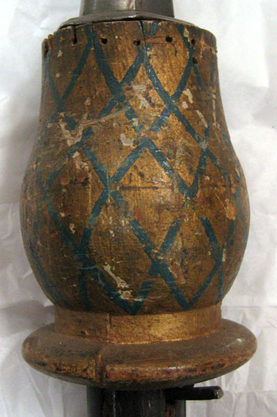 Bestående av balusterformig knopp av svarvat trä med krage nertill. Målad i guld med rutnät i blått.