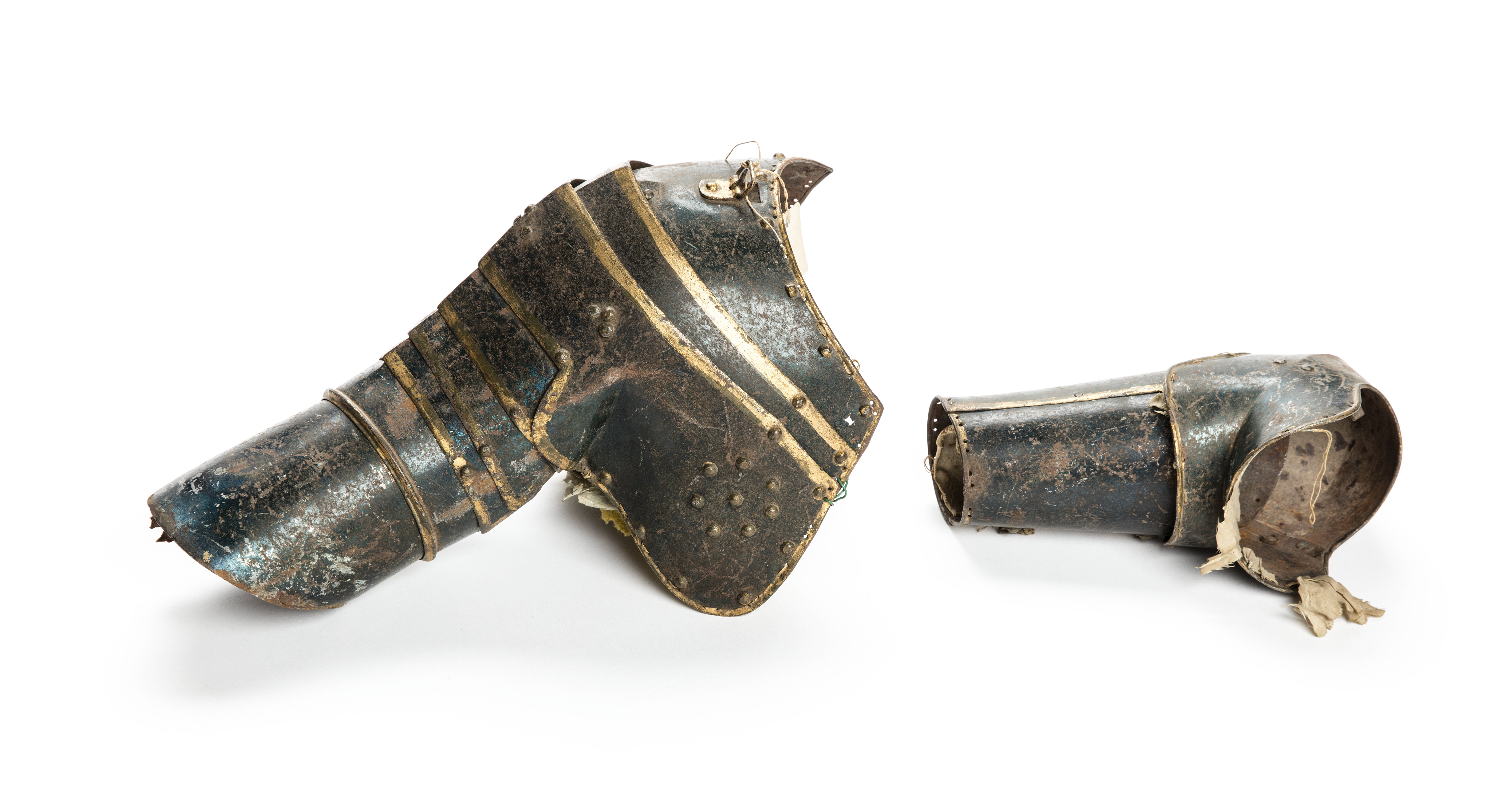 Av bleckplåt, 10 delar. Målat i blå/grönt med förgyllda kanter. Axelpartiet med ursprungligen foder av gult ylle. Ursprungligen även kantning av ljusblått, rynkat siden: axelpartiet, kring armpucklor och armskenans nedre kant.