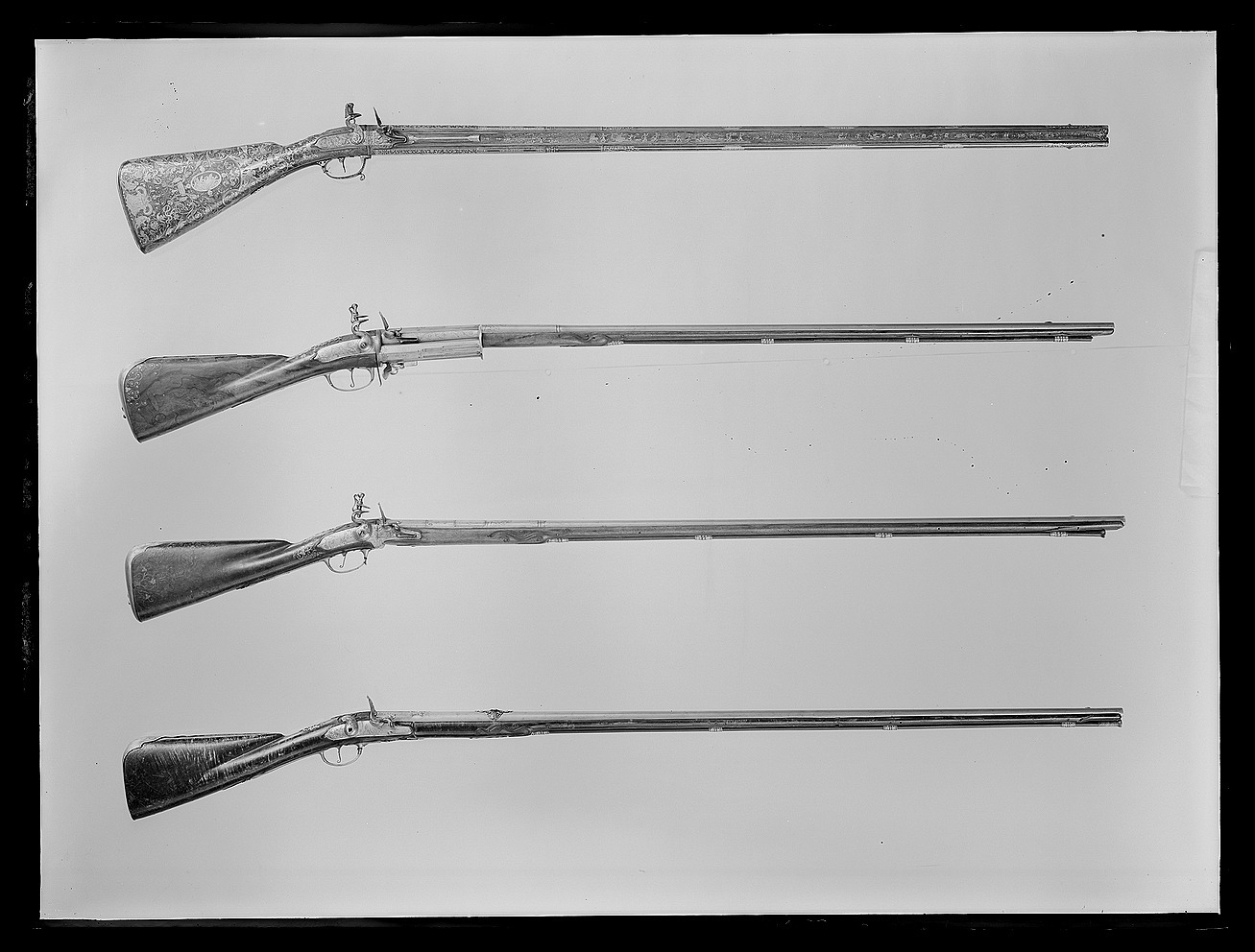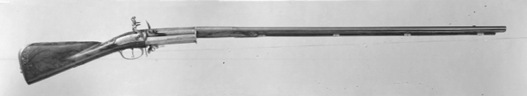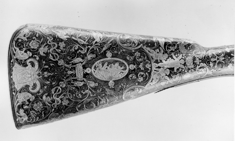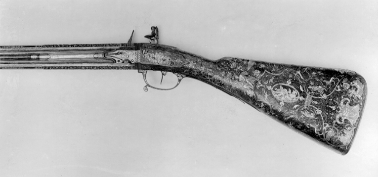 Två likadana, runda, blånerade och slätborrade pipor av stål över varandra. Rik dekor av graverat och påslaget guld. Kammarens bakre hälft åttasidig med bladbård, groteska slingor och på mellersta fasen jaktscener, beridna jägare och en stad i bakgrunden. Främre hälften sextonsidig med omväxlande blommor och enkelt flätband. Framför denna en rund del avgränsad av svarvade ringar, dekor med en smal och enbred bladbård och sju längsgående linjer emellan. Den främre, största delen av piporna har sju längslöpande linjer och fyra ornamentfält, i mitten tre fält med bladdekor och flätband, mot kammaren groteska rankor runt en oval med Minerva resp. en basunblåsande Fama. Runt siktet rankor och vidmynningen en bladbård. Små, ovala, graverade sikten av silver, ur vars mitt en knopp mjukt höjer sig. Fästning: På undersidan tre häften vardera, häftena på den övre pipan är placerade mellan väggarna på nedre pipans häften. Pipornas svansskruvändar är fast monterade på en åttsidig skiva, vilken tillsammans med piporna är vridbar kring tappen på en motsvarande skiva, fäst i kolven. Skivornas kanter är graverade. Den bakre skivan är i ett stycke med svansskruvbladet och avtryckarblecket, dekor i guld. Den fjädranderegeln till rotationsspärren är infälld i varbygelns främre arm. Flintlås av wendertyp med plant, graverat låsbleck med fasade kanter. Blecket är tudelat framför hanen, och de två delarna är med en tapp ilaxade i skivorna. Graverad dekor, på bakspetsen en uggla på ett draperi och signering: "LE CONTE A PARIS". På blecket upptill en naken människofigur med öppen mun och flygande hår, vars kropp bildar yviga rankor, dessutom en orm och framtill en apa. Platt hane med motstöd och lös överkäke, rak, avtrappad hangren. Dekor på hanen i form av slingor samt en mansfigur med toppmössa och lyft dolk, redo att hugga en snigel. Genombrutna blad under underkäken och mellan hals ochrygg. Hanskruv i form av en gjuten, förgylld lejonmaskaron. På vardera sidan om kammaren låsblecksdel med graverade blomrankor samt batterifjäder, kantig fängpanna och kantigt batteri. Ett batteri saknas. Flikig nöt utan studel. Avtryckare med fingerläge och bladformig förstärkning på baksidan. Helstock av valnöt med rika, fint ciselerade inläggningar av silver. Kolv av äldre fransk typ. Slätbakplåt av stål med en liten flik, tre skruvar och grotesk dekor av påslaget guld i form av en bladbård runtom. På kolven yppigt rik, grotesk rankdekor med apor, kattor, fåglar, maskaroner, sniglar mm. På kolvryggen en basunblåsande Fama, ridande på en örn, som i näbben håller bandet till en medaljong med initialerna L D G R (Ludovicus Dei Gratia Rex). På h. sida Minerva, vilande bland troféer inom en oval ram med flätbård, framför denna tre amoriner, i mitten en stående Amor med pil och båge. Vid kolvänden maskaron signerad: "BERAIN FECIT". På anslaget dekor i form av Mars vilande bland troféer inom en oval ram med bladstav. Framför ovalen sitter Apollo spelande harpa. På sidan av svansskruvbladet ochbakplåtens flik profilställda maskaroner. Sidbleck av stål föreställande kvinna, famnad av två bevingade satyrer. Separat framstock mellan piporna. På ena sidan inläggningar med blomrankor och livliga figurframställningar. På andra sidan fyra stålrörkor med gulddekor, liksom på näsbandet. Bakom bakre rörkan graverade silverplåtar med masker och landskapsbild med dekor i guld. Varbygel av brunerat(?)stål med dekor i guld. Kort främre arm och lång bakre arm med genombruten bladspets. På bygeln enstående Minerva bland troféer, framtill är rotationsregeln infälld. Tillbehör: Laddstock av valnöt, 1: 1146 mm, skoningen saknas.