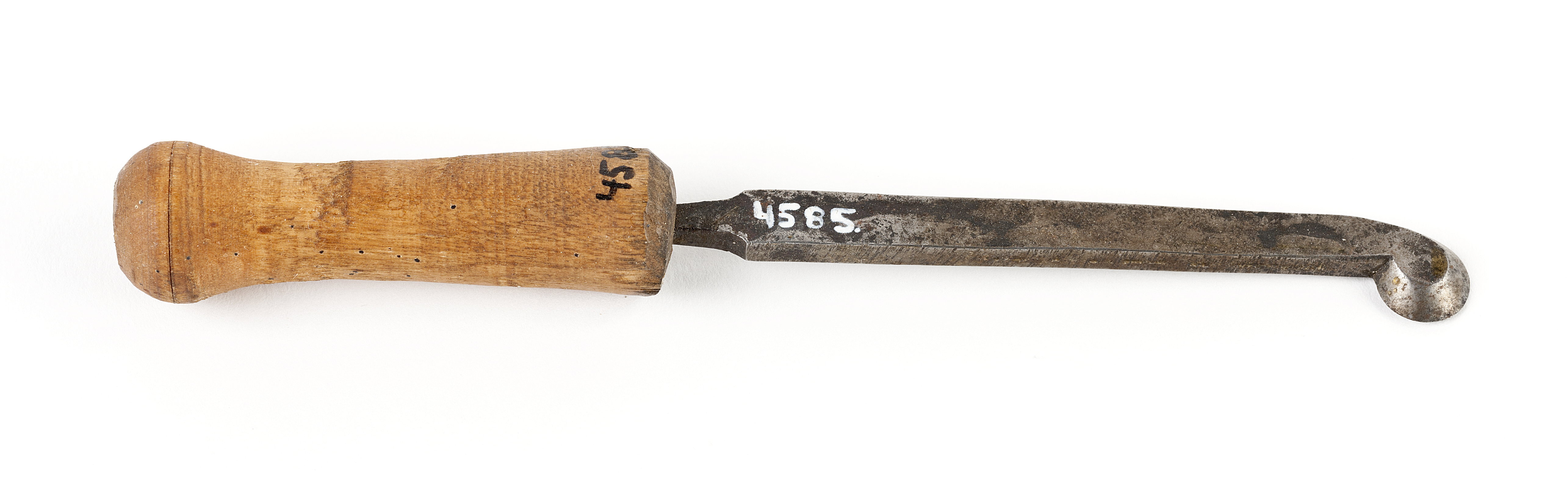 Klinga med rektangulär genomskärning. Vinkelställd, cirkelformad egg. Stämplat på stålet: tupp? Svarvat skaft av ljust lövträ, avskuret nedtill.