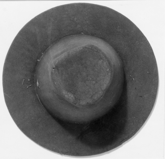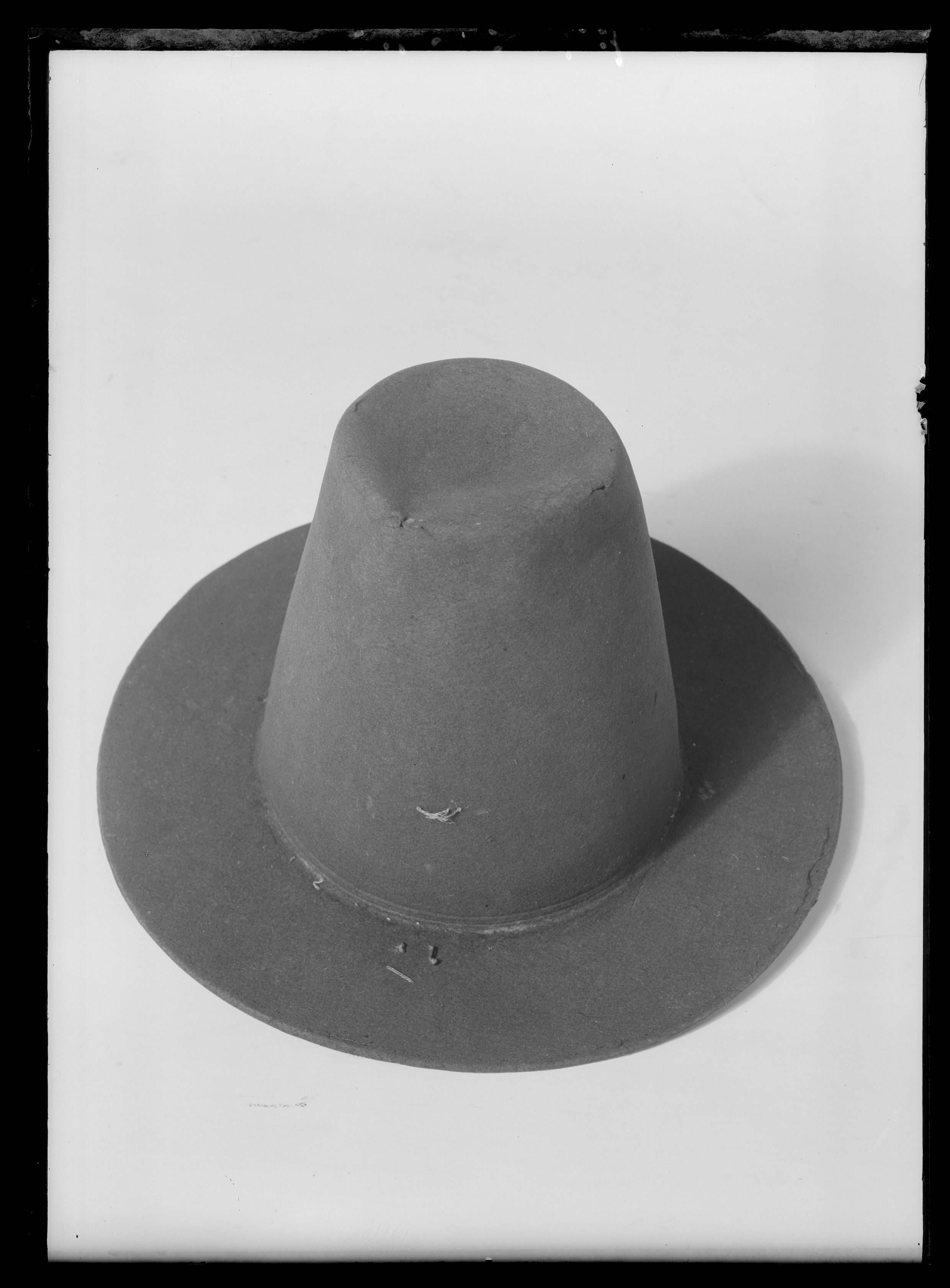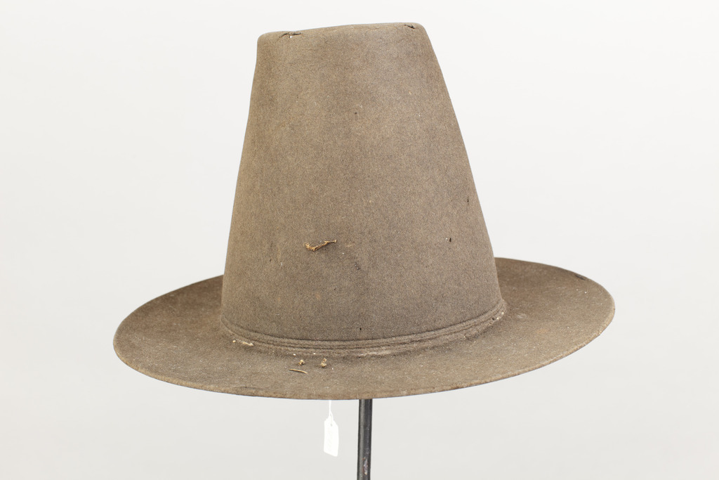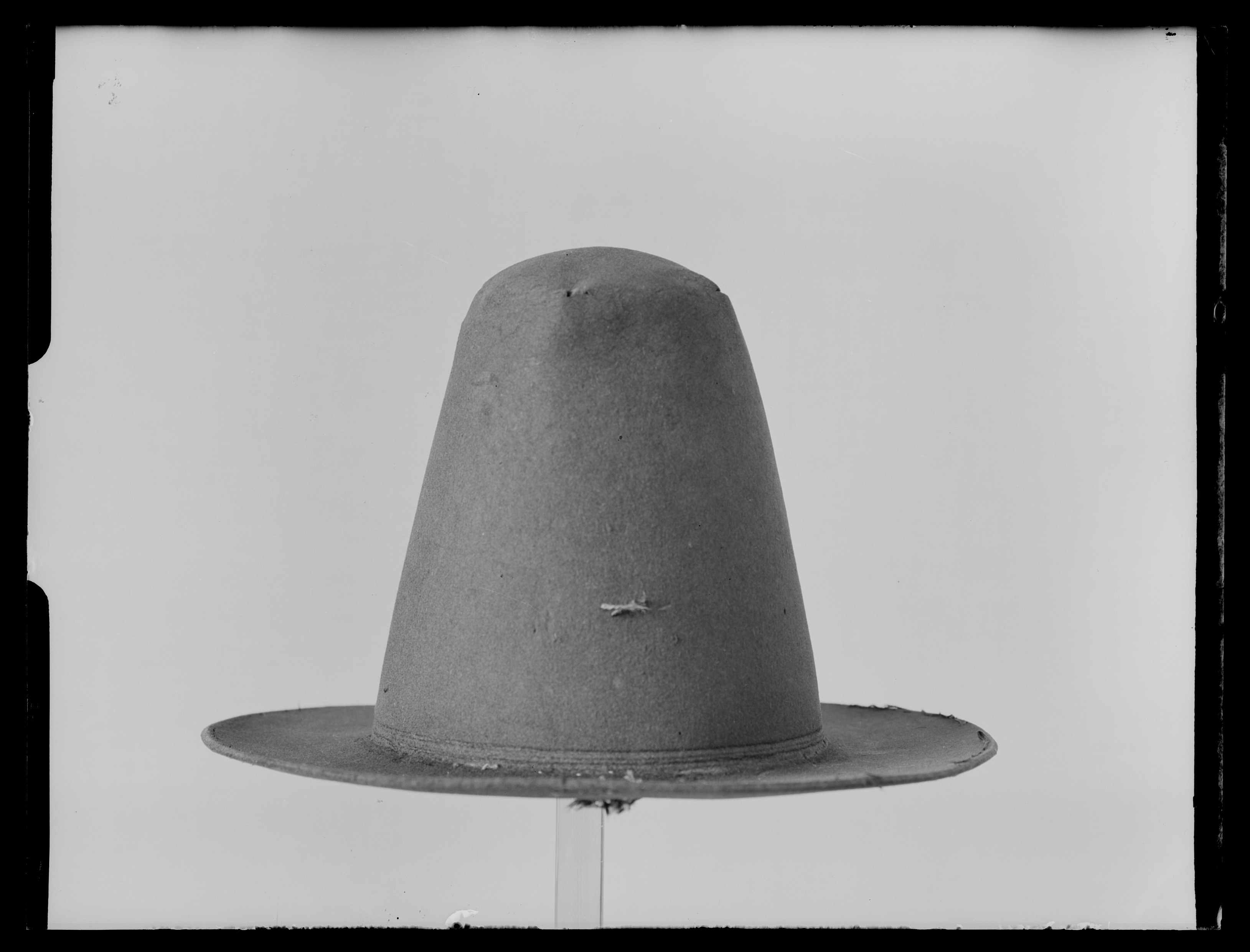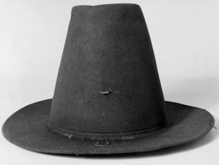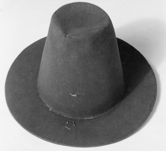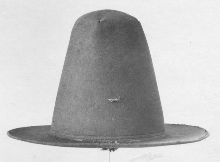 Hatt av svart filt. Hatt med hög kulle i form av en avskuren kon, avsmalnande uppåt och med rakt brätte, ca 7 - 7,5 cm brett. Denna hattmodell kallas copotain. Två parallella dekorlinjer finns inpressade i filten, nederst på kullen, mot brättet, placerade med ett mellanrun på ca. 3 mm. På både brättet och kullen finns stygn sydda med grov lintråd. Stygnen är förmodligen spår efter dekor av något slag som varit fäst på hatten. Invändigt finns ett svettband av tuskaftsvävt linne, skuret på snedden, ca. 6 cm brett. Skarv sydd på snedden. En ögla av dubbelvikt linneband, ca. 1,3 cm brett, är fäst i svettbandet.