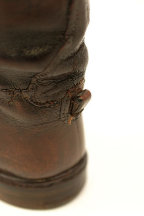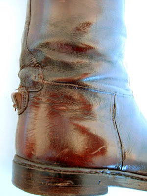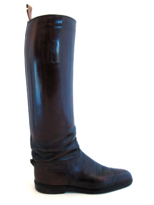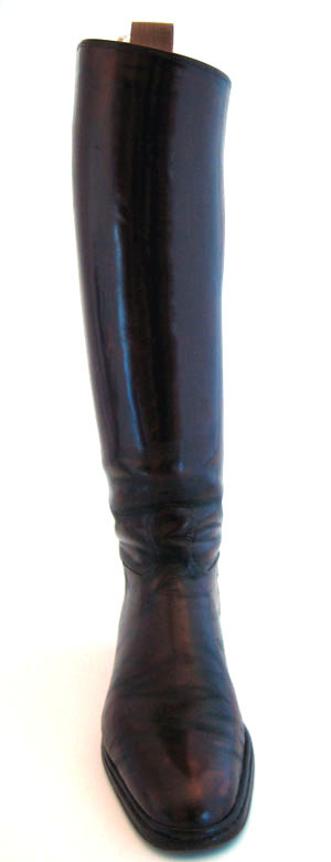 Stövel, höger, gjord av rödbrunt lackerat skinn.