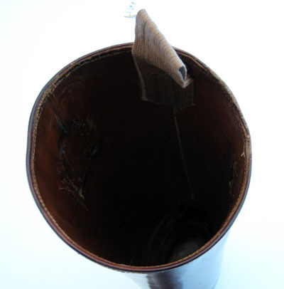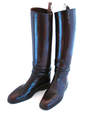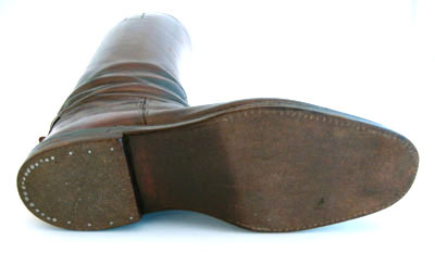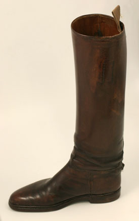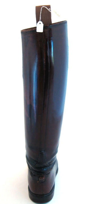 Ridstöveln skuren i reseft, skaft och bakkappa. Reseftet och bakstycket förenas med hopspannade sidsömmar. Skaftet förenas med reseft och bakkappa med en horisontell söm mitt på, som mitt fram går upp i en böj. Bakstycket är skuret med en 13 mm bred skinnremsa som täcker över skaftets söm mitt bak, som nedtill mynnar ut i en triangelformad del. Under denna finns en 12 mm bred, 17 mm hög, utåtpekande kil. På skaftets båda sidor finns två vertikala och parallella rader av små hål som ser ut som om något varit fastsytt där. Stöveln är fodrad med ljusare brunt skinn (kalv?). Innersula av brunt skinn med förstärkt häl. Mitt bak, på insidan upptill av skaftet finns en ljusbrun, dubbelvikt textilstropp, längd 130 mm , bredd 35 mm. På insidan mitt fram, c:a 30 mm från överkanten, finns med svart stämplad, delvis oläslig text: "/.../ // Charlottenburg 2 // /.../strasse 184 // Tel. /.../". På var sida om texten finns ett märke bestående av två cirklar som går in i varandra med oläslig text i och omkring. Under hela stämpeln finns, i svart, handskriven text: "Prinz Gustav Adolf // von Schweden". Sula av rödbrunt nötläder. Klack av läder med tre klacklappar och stiftlapp fastsatt med 24 stift av vit metall.