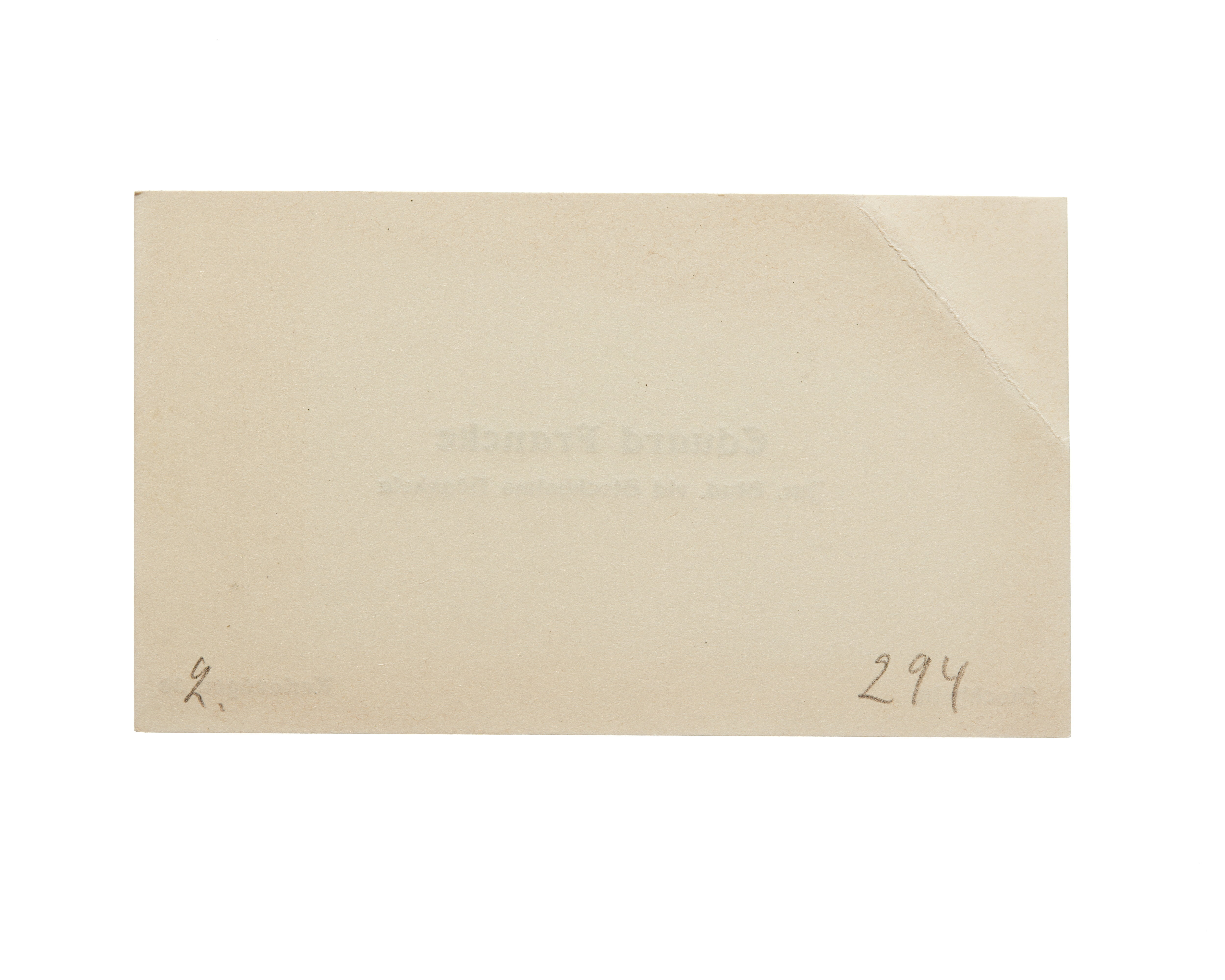 Två visitkort från Eduard Francke, Jur. Stud. vid Stockholms Högskola. Båda vikt i övre vänstra hörnet. Adress (nedre vänstra hörnet) Stockholm, (nedre högra hörnet) Karlavägen 38.
