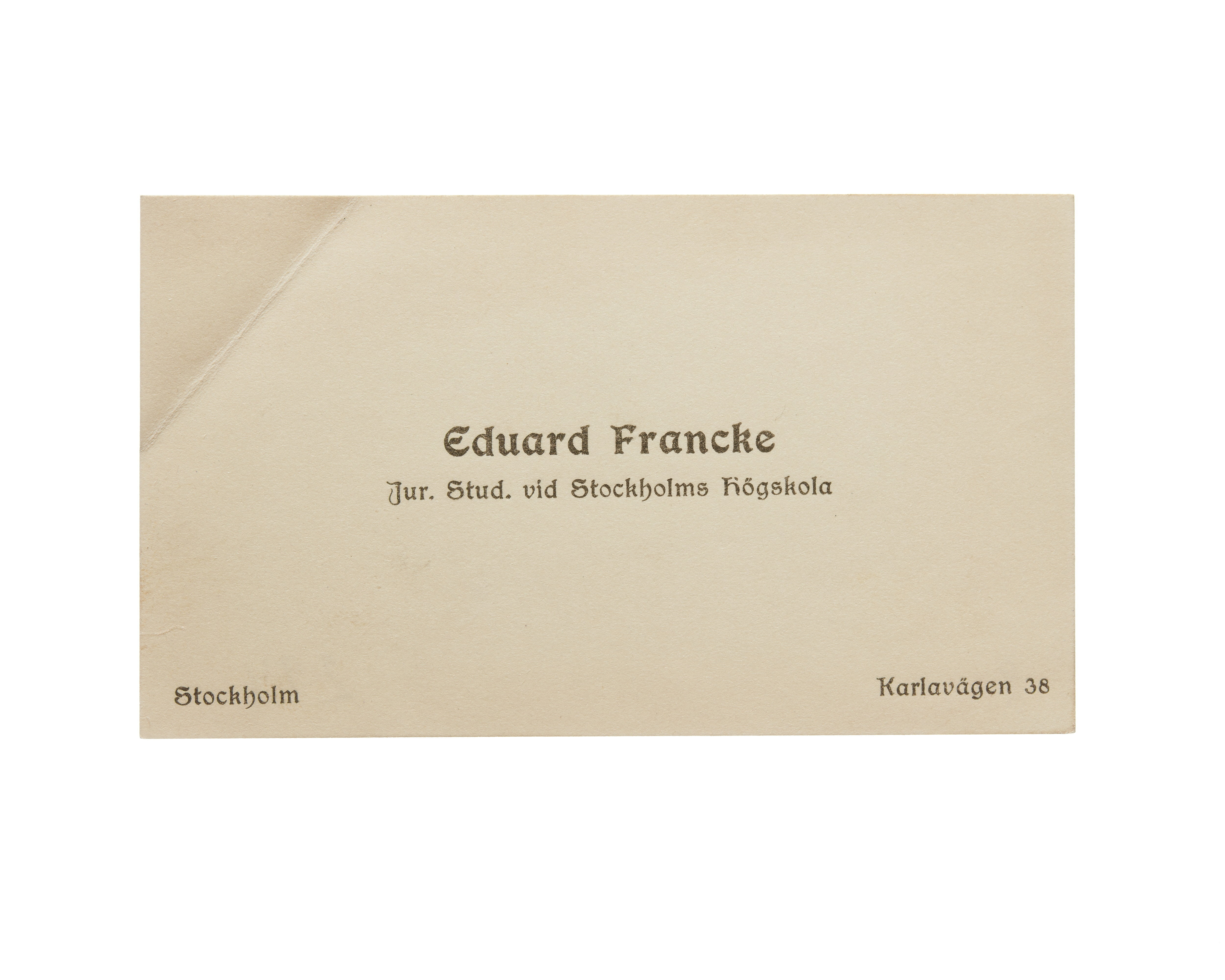 Visitkort från Eduard Francke, Jur. Stud. vid Stockholms Högskola.