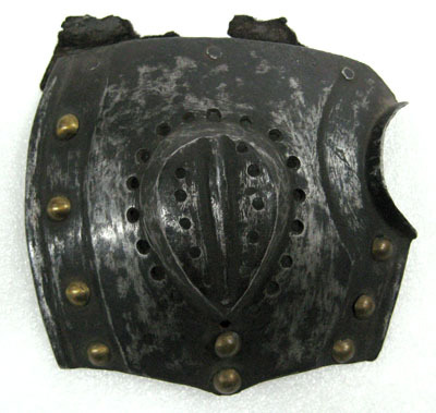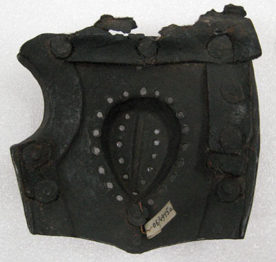 Av stål med utsidan delvis blankslipad och insidan svart. Närmast kvadratisk svagt välvd plåt med bakre kant konvex, omvikt inåt och rundsmidd. Främre kant med rundad urtagning upptill. Övre kant rak, nedre med svagt utdragen spets i mitten. I plåtens mitt mandelformigt uppdrivet ornament, L 63 mm, med längsgående ås och elva hål. Runt ornamentet 19 hål. Längsmed fram- och bakkant försänkt bård, B 16 mm, i denna nitar med gulmetallhätta. På insidan rester av kantband av läder.