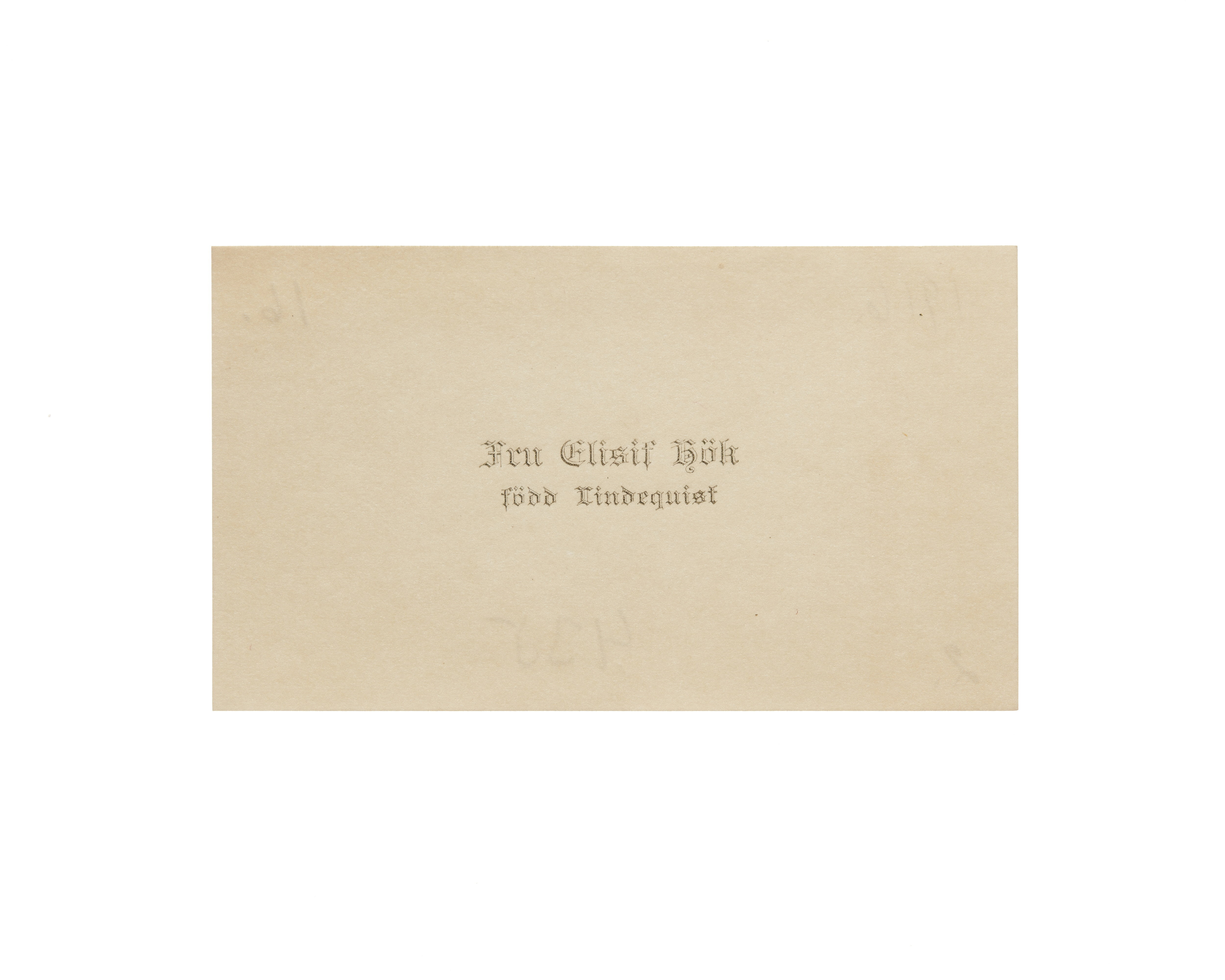 Fem visitkort från Elisif Hök, f. Lindequist. Första kortet är utan datum, vikt i högra sidan. Andra kortet daterat 1916. Tredje kortet daterat 1922, vikt i högra sidan. Fjärde kortet daterat 1923, vikt i högra sidan. Femte kortet daterat 1924 samt sorgkant, vikt i högra sidan.