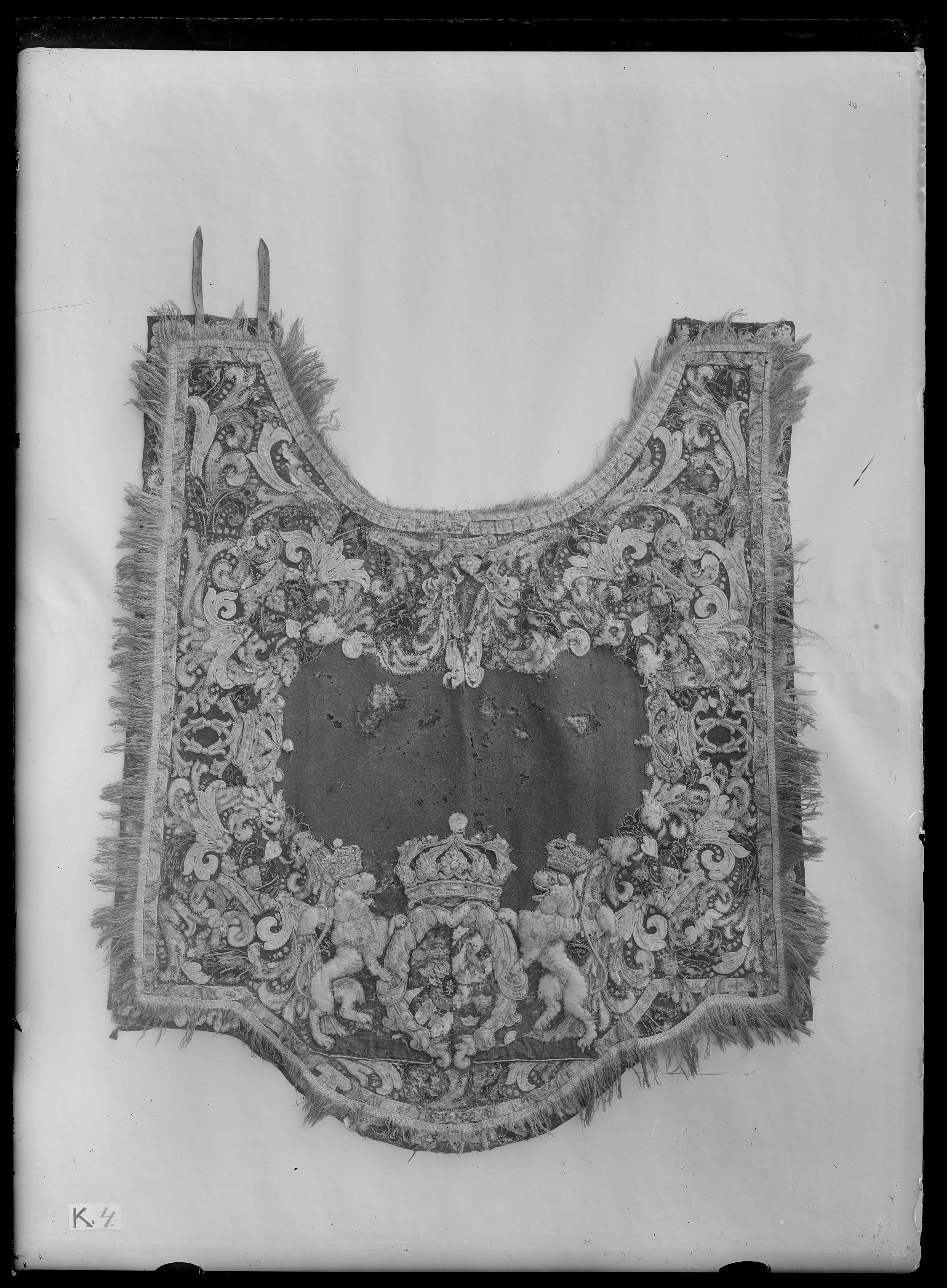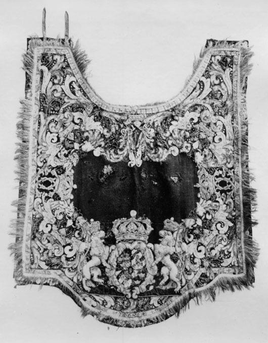 Handhästtäcke, ur en svit om 30 st med svenska riksvapnet och Karl XI:snamnchiffer.