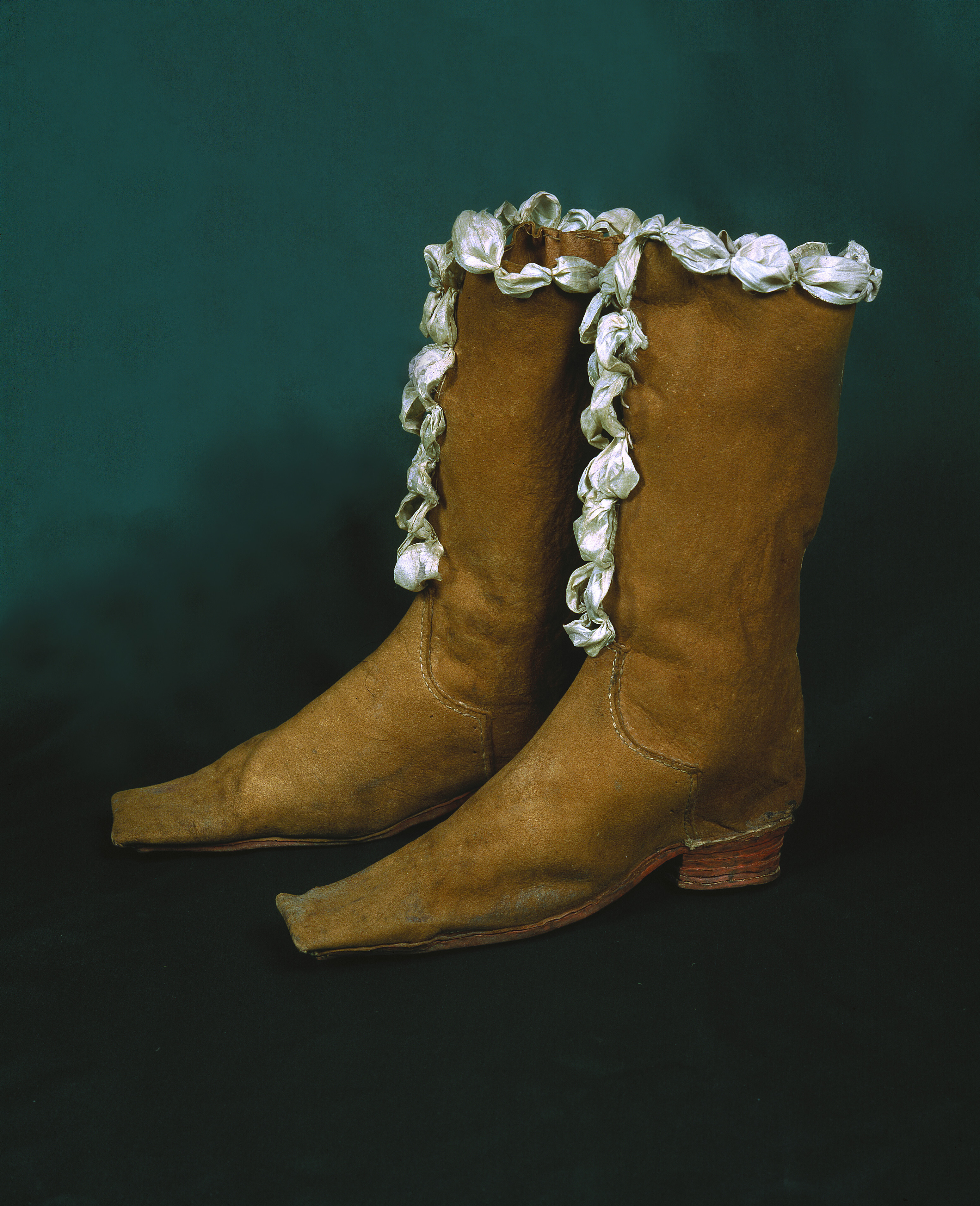 Karusellstövel i garnityr med inventarienummer 7347. Beställd i samband med Karl X Gustavs kröning 1654, RA. Stövel av brunt läder med köttsidan utåt och narven inåt. Kantad med band av ursprungligen ljusblått siden. Snörd mitt fram. Klacken är 30 millimeter hög och av rödmålat läder.