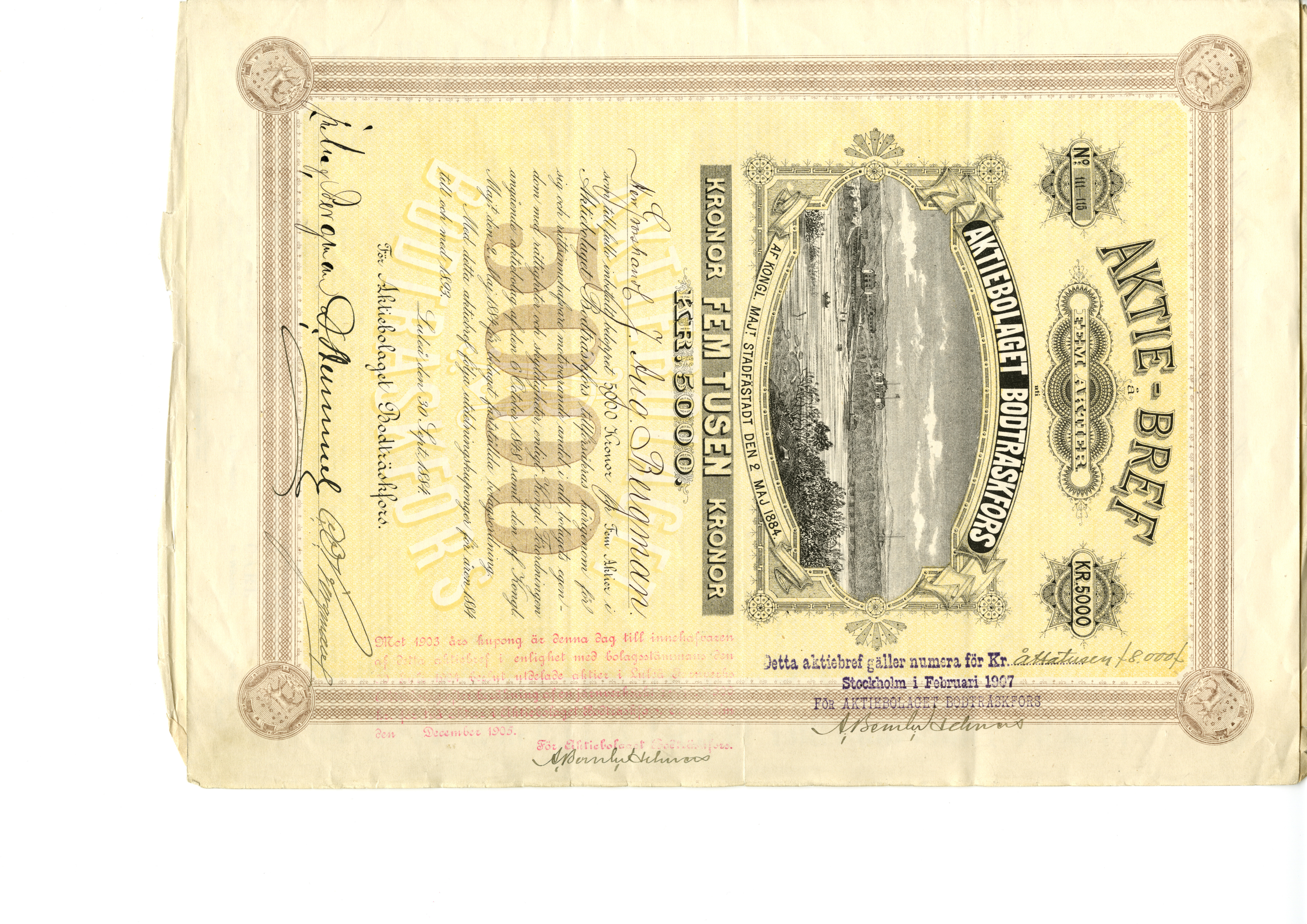 Vinjett med graverad landskapsbild föreställande anläggningarna vid Bodträskfors. Med texten "AKTIE-BREF å FEM AKTIER uti AKTIEBOLAGET BODTRÄSKFORS" No 111-115, KR 5000.