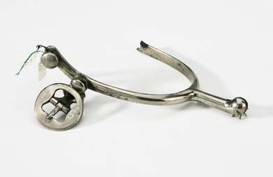 Sporre av förnicklat stål med u-formade, vid ändarna uppåtsvängda skänklar, rundstavig 32 mm lång hals, vidgad och något uppåtsvängd i ytteränden, åttauddig klinga. Vid ändarna två runda plana knappar på hals, i den bakre på ena sidan rund remsölja medtagg och ledad med enkelt gångjärn.