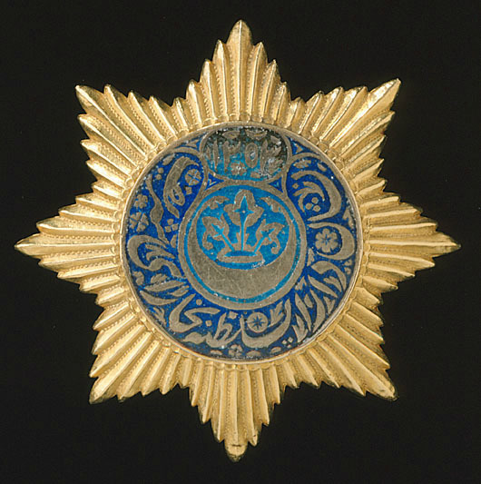 Åttauddig strålstjärna av förgyllt silver, varje udd bestående av åtta strålar med mittås, mellan strålarna repstavar. Runt, platt medaljong av silver, i mitten rundel med ljusblåemalj med halvmåne och därovanför växtornament med tre blad. Ovanför mittfältet vid kanten mindre ovalt fält med ljusblå, delvis missfärgad emalj med skrifttecken av silver. Utefter resten av kanten ett hästskoformigt fält täckt med mörkblå emalj, skrifttecken av silver (nisan-i dar-as-saltana-i Buhara-i sarif = makthusets orden i upphöjda Bokhara).