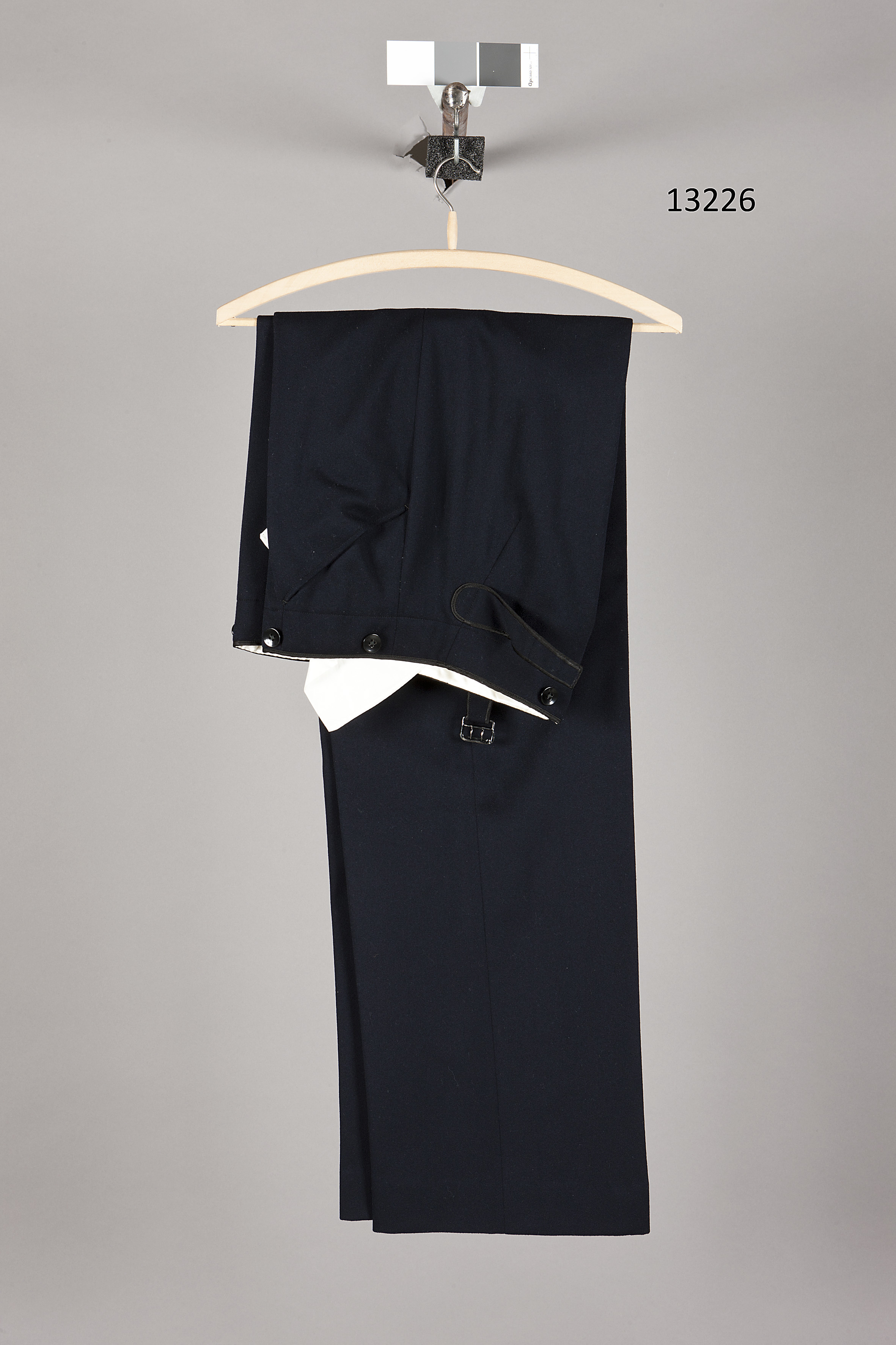 Byxor av mörkblått kläde. Knäppes med knapp i linningen, d: 17 mm, gylfen knäppes med fyra slätaknappar, d: 14 mm. I linningen sex släta knappar, d: 17 mm. Bak i sprundet ett sprund med spänntampar samt rektangulär, svart sölja. Snedfickor i varje sida. Helt raka ben. Foder i linningen av vitt siden. Fickorna av vit bomull.Tillverkaretikett på spänntampens baksida: "LINDAHL // KUNGL. HOVSKRÄDDARE // Juni STOCKHOLM 1939 // H. M. Konungen". Sydd av Lindahl, kunglig hovskräddare, Stockholm.