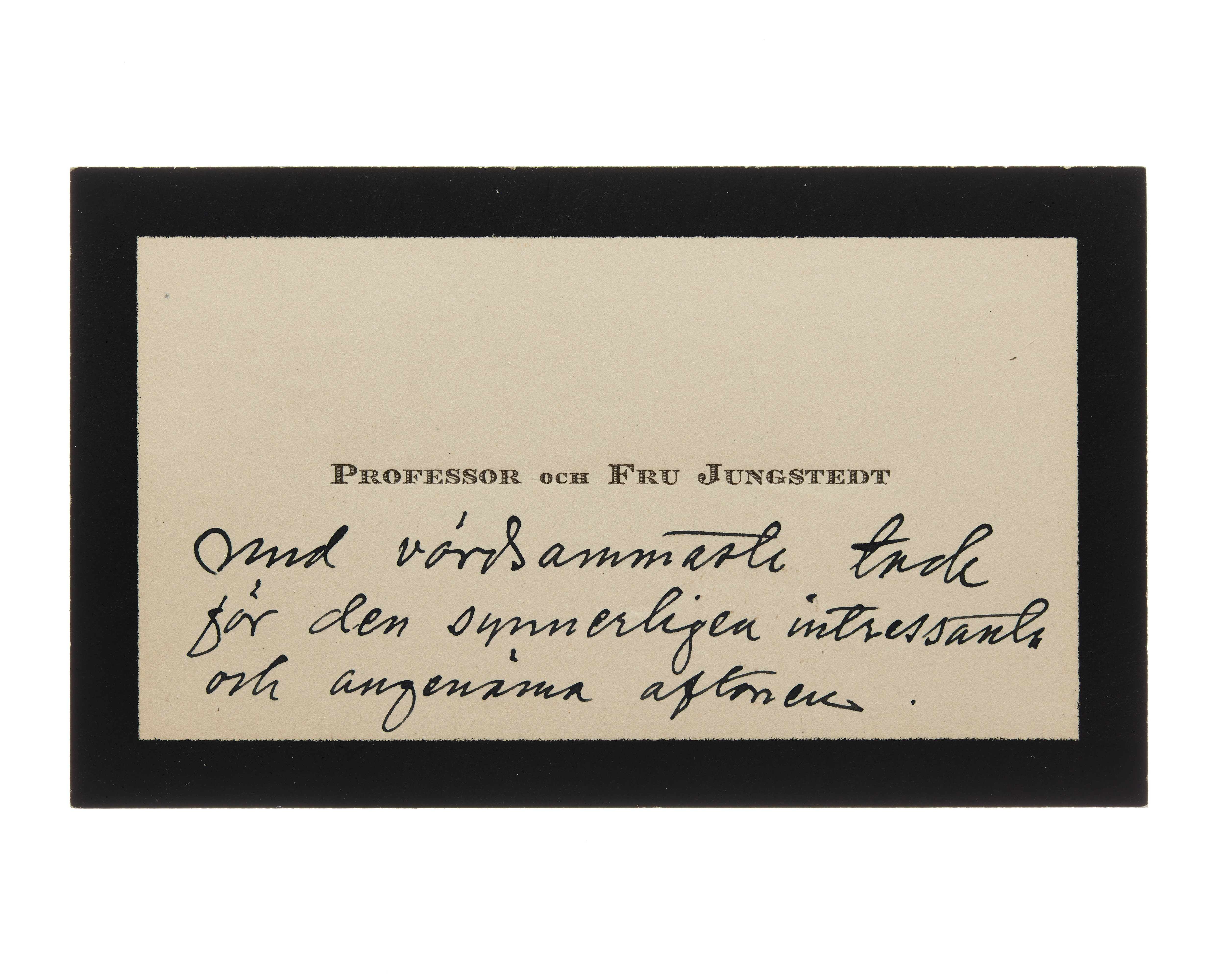 Ett visitkort från Professor Axel Adolf Harald Jungstedt och Fru Sigrid Jungstedt, f. Nilson-Dag , daterat 1923 samt sorgkant. Handskrift "Med vördsammaste tack för den synnerligen intressanta och angenäma aftonen".