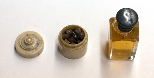 Fyrsidig glasflaska med fasade kanter och fasetterade axlar. På utsidan gängad, lång hals, h: 7 mm. Propp av glas med triangulärt grepp. Proppskydd av silverplåt (?), h: 15 mm, d: 18,4 mm, med svagt balusterformig, nertill gängad hals.