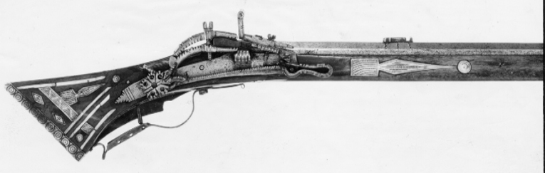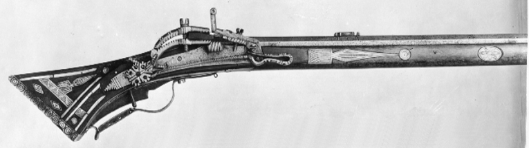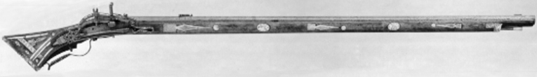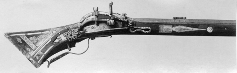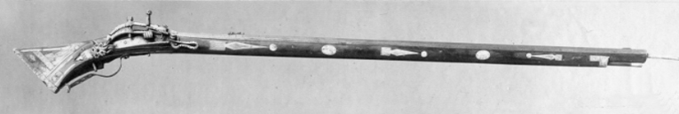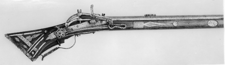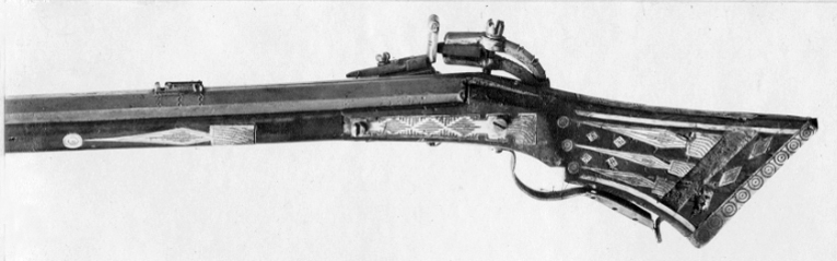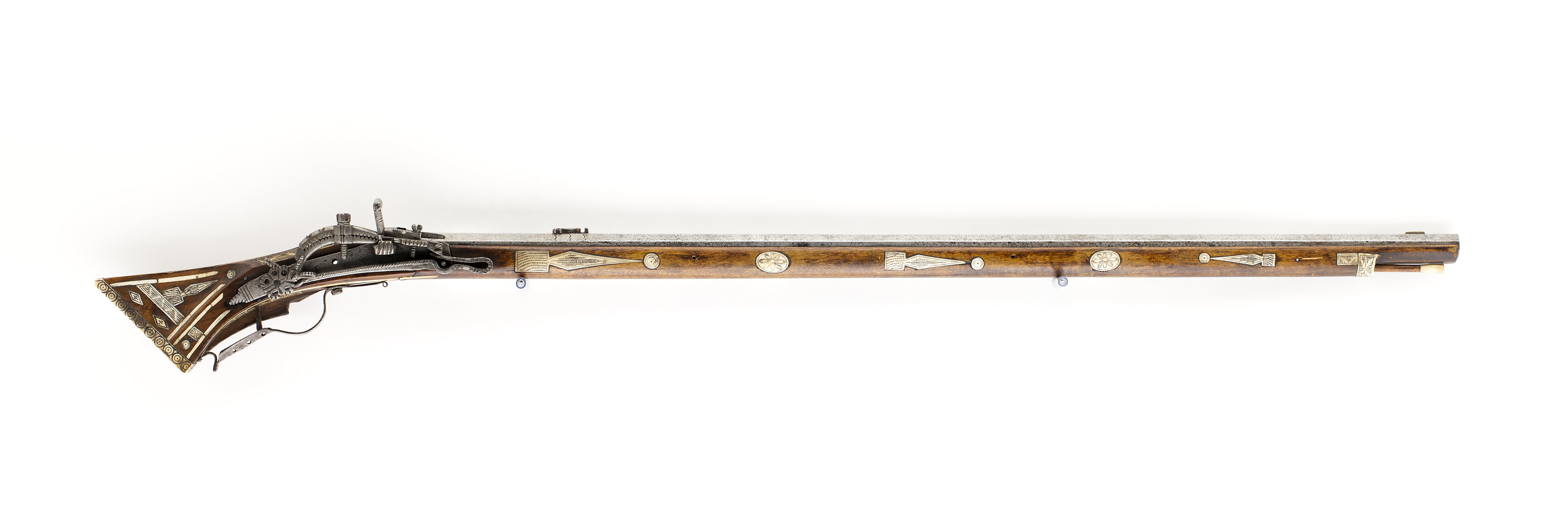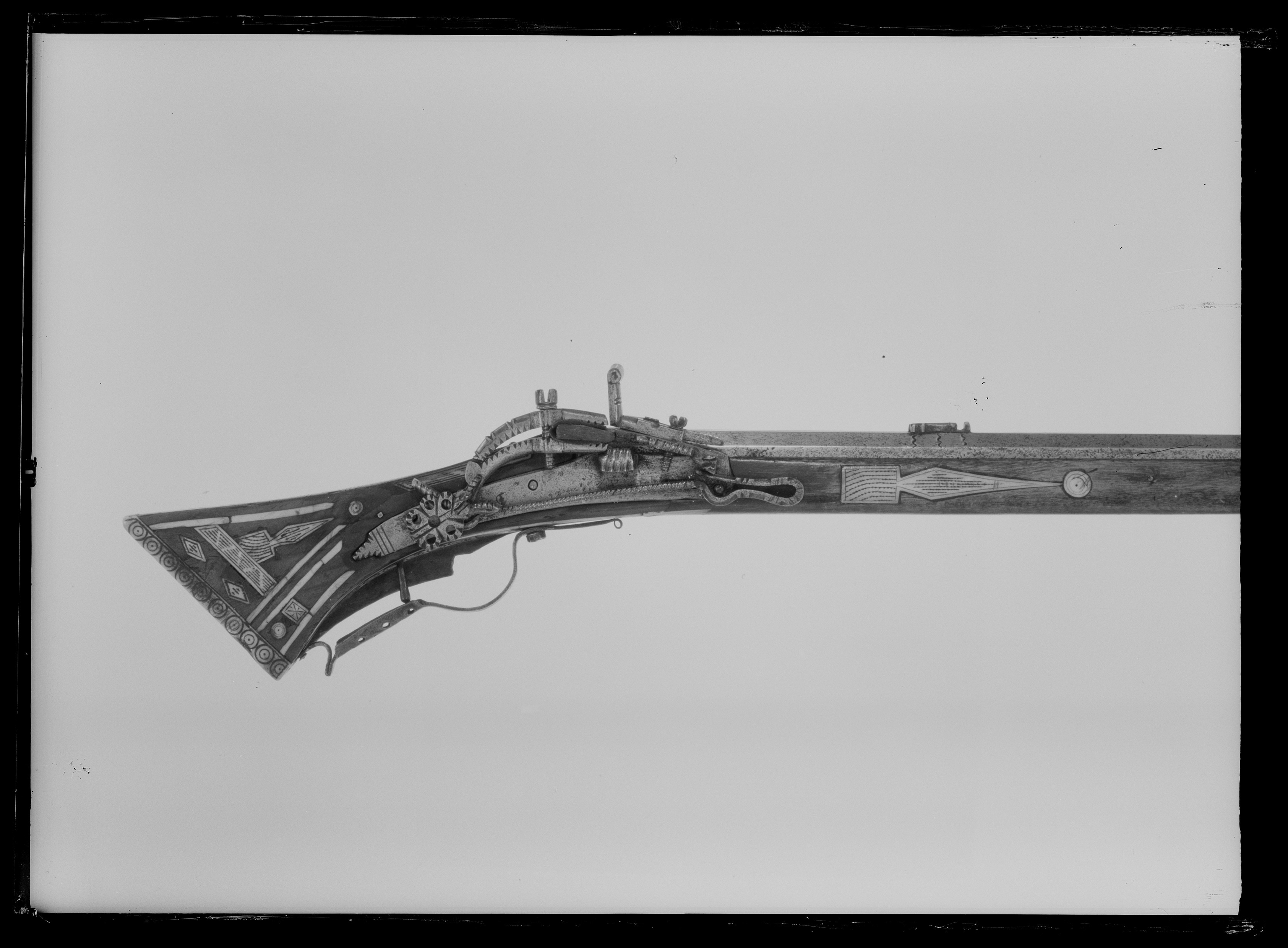 Åttsidig, räfflad pipa av stål med i vinkel böjt, baktill tvärt avskuret svansskruvblad. På sidofaserna vid siktet samt på översidan framför siktet punsade våglinjer. Riktmedel: Från svansskruvbladet till siktet en filad siktskåra. Kulissikte av stål, l: 31 mm, profilerat och med skärm av koppar. Långt stolpkorn av mässing. Fästning: Tre häften, laxning för ytterligare ett. Snapplås, springlås med plant låsbleck, tre filade streck samt triangulära kantfilningar på bakspetsen. Böjd hane med lång, inlaxad överkäke, svagt triangulära käkar, käkskruv med cylindriskt huvud med djupt inskuren x-skåra, spetsarna med kanthak.Överkäken därbakom åsad och försedd med tre parvisa tvärlister, käkarna på innerkanterna kanthuggna. Hanfoten dekorerad med snedvulster. Studel i form av kanthuggen, åttabladig blomma, genombruten av sex ytter- och ett mitthål, ett ytterhål använt för fästskruven, framför skurven två ögleformigt uppåt-bakåtböjda räfflade stålspetsar. Rektangulär fängpanna med snedräfflad gavel. Batteri med omvändningseldstål, upptill avslutat med vuslt, lockets ytterkant räfflad. Slagfjäder-batterifjäder med snedräffling på den långa, raka delen, fasningar, tvärstreck och kanthuggningar på batteridelen. Fästning: Låsskruvar. Rak, något droppformig avtryckare. Rektangulärt avtryckarbleck av ben med spetsig bakände, dekor av koncentriska cirklar. Helstock av trä med kolv av göingetypd, triangulär med triangulärt tvärsnitt. Hela framstocken ersatt. Sluten laddstocksränna. Beslag och inläggningar av ben med graverade streck och koncentriska ringar. Bakplåt med nertill ett fält med snedskraffering,på resten av plåten dubbla kantlinjer och punkter, däremellan bokstäver(?) T I. På kolvens båda sidor kantlister, rombiska, kvadratiska och runda benplattor samt större plattor i form av rombiska spetsar på fyrsidig fot. Rektangulärt sidbleck med rätvinkliga inskärningar vid skruvhålen. På framstocken inläggningar som på kolven i övrigt samt ovala plattor med graverade, åttabladiga blommor. Överrörka av ben med streckdekor. Bandformig varbygel av stål med smal främre arm, avslutad med en upprullad ring, bakom bygeln är bakre armen fri, skålad och genombruten av nio runda hål, bakre stolpen omvänt c-formig och fäst med en sliten träskruv, främre armen fäst med krysskruven. Tillbehör: Laddstock av trä, l: 967 mm, framtill skodd med ben.