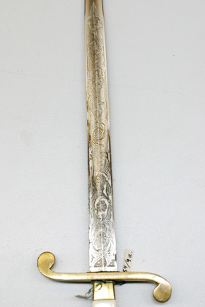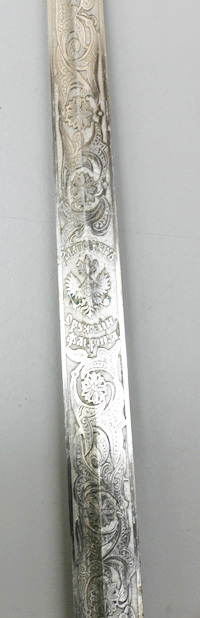 Fäste av förgylld mässing. Fyrkantig knapp med rund nitknapp. S-formiga parerstänger med uppåt- respektive nedåtböjda rundade ytterändar. Kavel av elfenben med fyrsidigt tvärsnitt. Tvåeggad rak klinga med hög mittås. Klingan har etsad dekor av slingor på båda sidor. På klingans mitt ryska riksvapnet omgivet av kyrillisk text ZLATOUST // ORUZEIN. // FABRIKA.