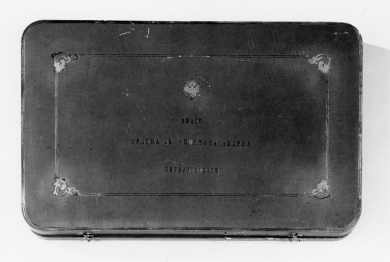 Rektangulärt etui av trä med rundade hörn. Utvändigt klätt med saffian, på undersidan med orangefärgat, mönsterpressat papper. På locket i guldtryck den ryska dubbelörnen samt rysk text: ZNAKI // ORDENA SV.APOSTOLA ANDREJA // PERVOZVANNAGO samt däromkring dubbel bård med hörnornament, längs kanten en smal och en bredare kantbård. Två gångjärn samt två haklås av mässing(?). Locket invändigt klätt med vitt siden, två hällor av vitt sidenband. I underdelen fast insats klädd med vit sammet med urtag för kedja, klenod och kraschan.