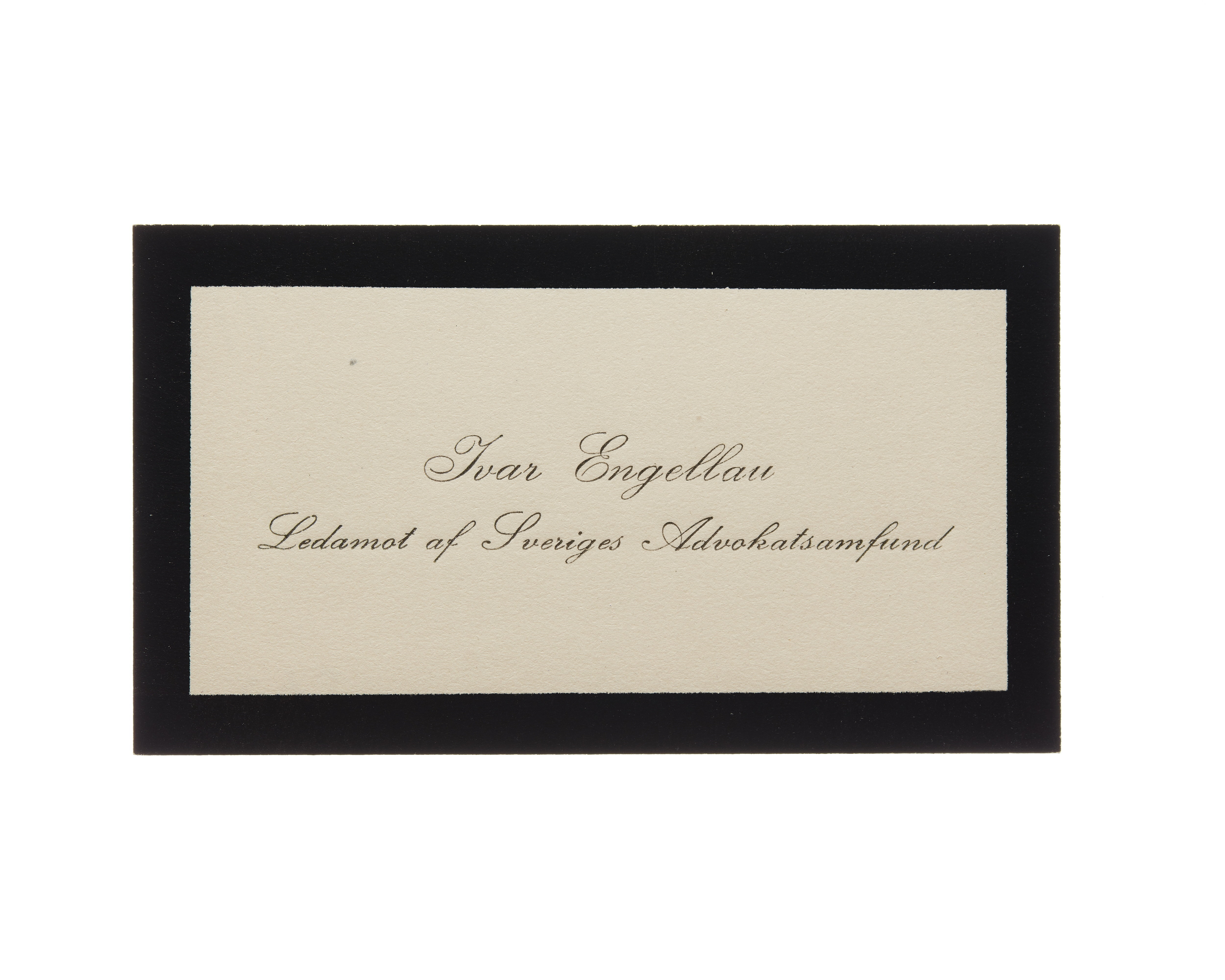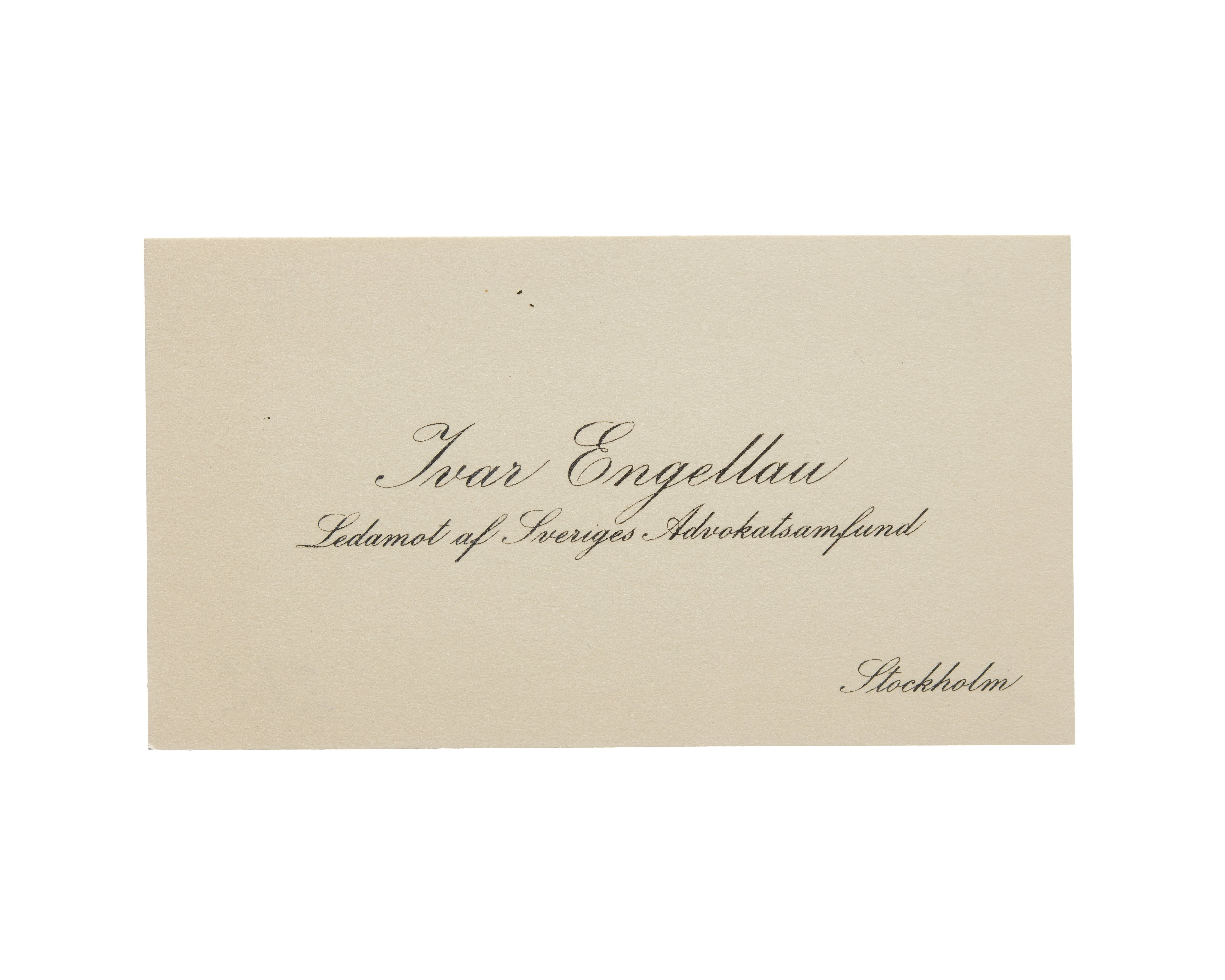 Sex visitkort från Ivar Engellau, Ledamot av Sveriges Advokatsamfund. Första kortet daterat 1915, adress (nedre högra hörnet) Stockholm. Andra kortet daterat 1915. Tredje kortet daterat 1917 samt sorgkant. Fjärde kortet är utan datum samt sorgkant. Femte kortet daterat 1918. Sjätte kortet daterat 1918.