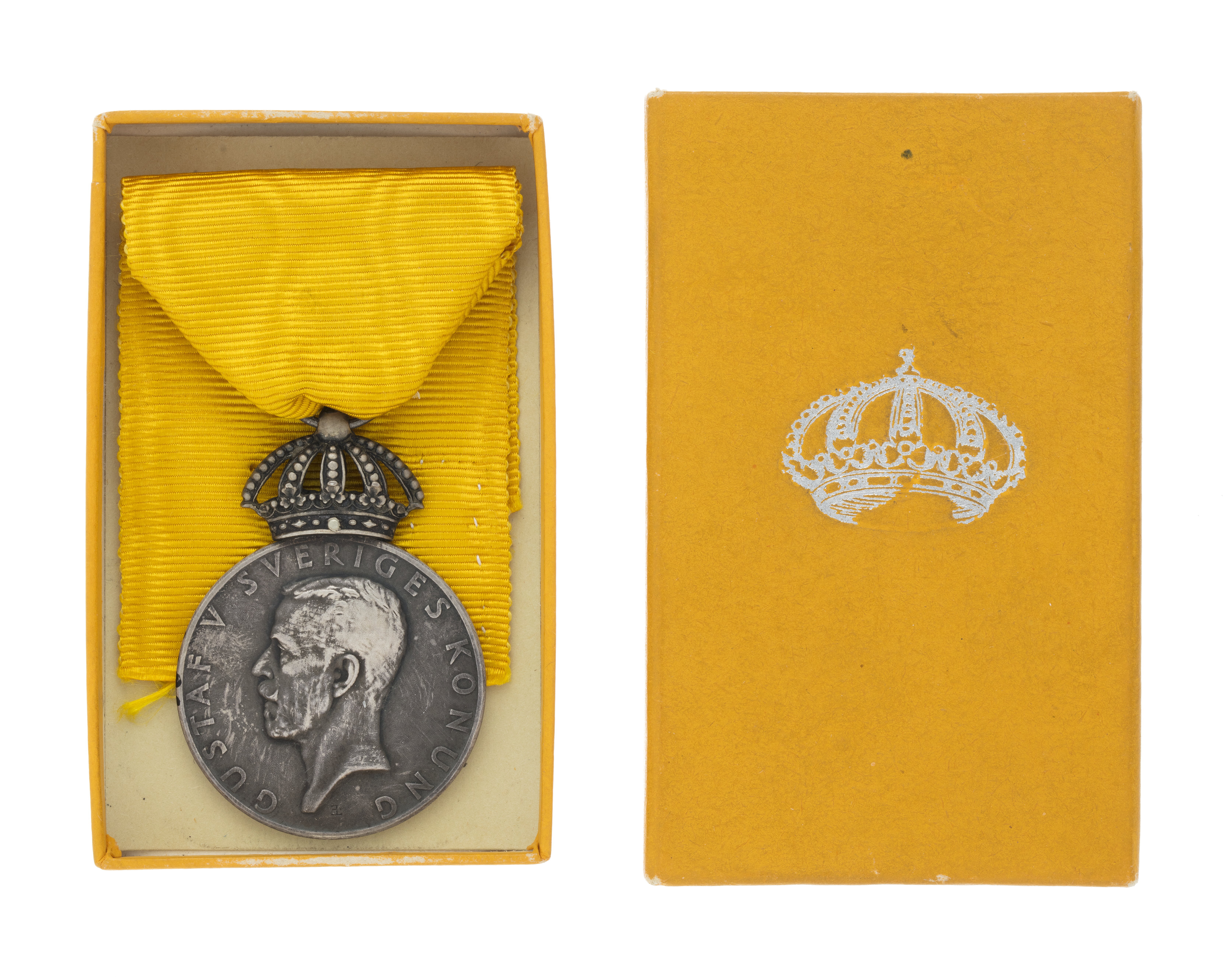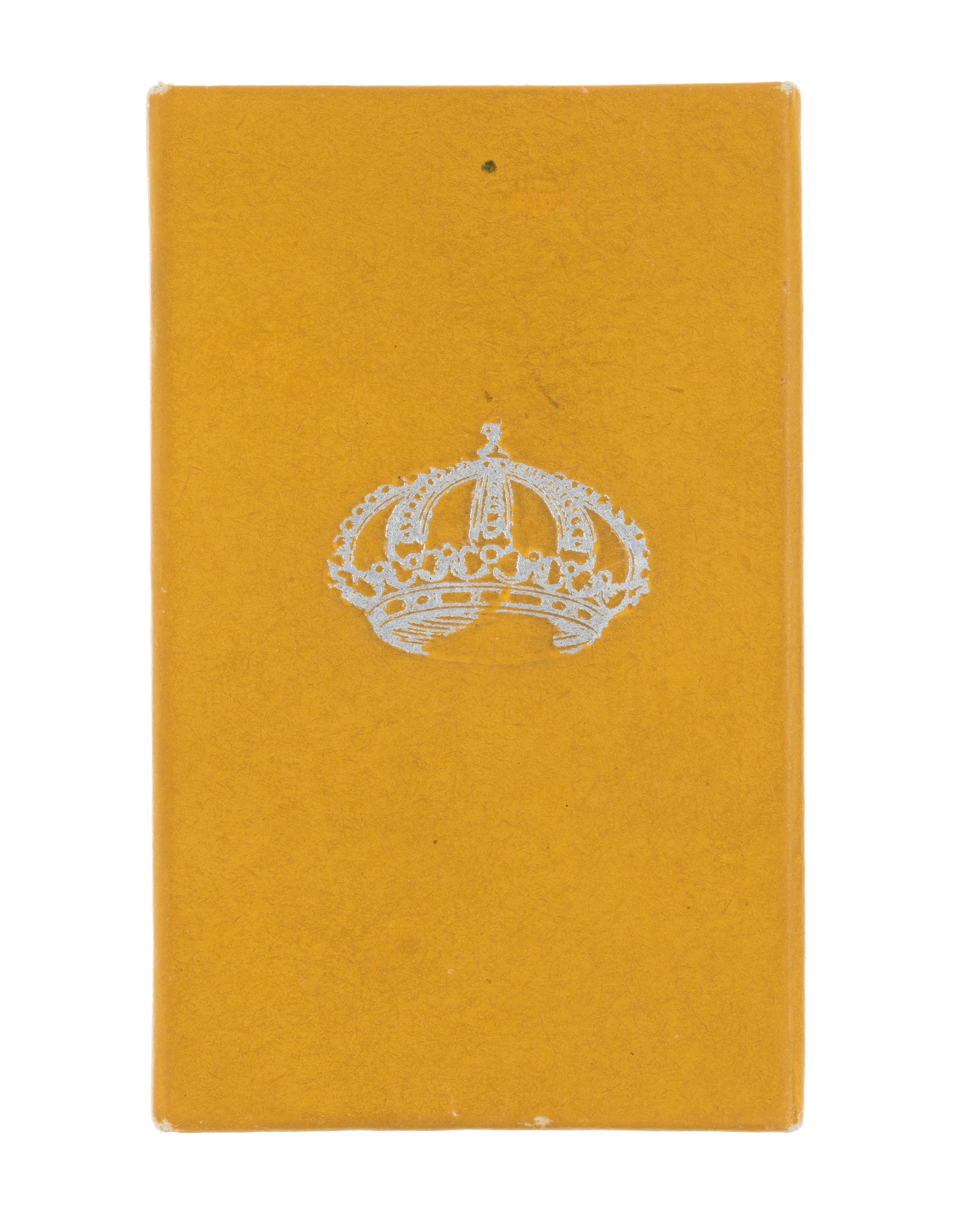 Rektangulär pappask, utvändigt klädd med gult papper, på locket i silverpressning en kunglig krona. Inuti asken papperslapp med text: "La miniature de cette medaille est a vendre chez C.F.CARLMAN, Joaillier de la Cour, 15 Regeringsgatan, Stockholm. Le prix avec ruban 8 couronnes."